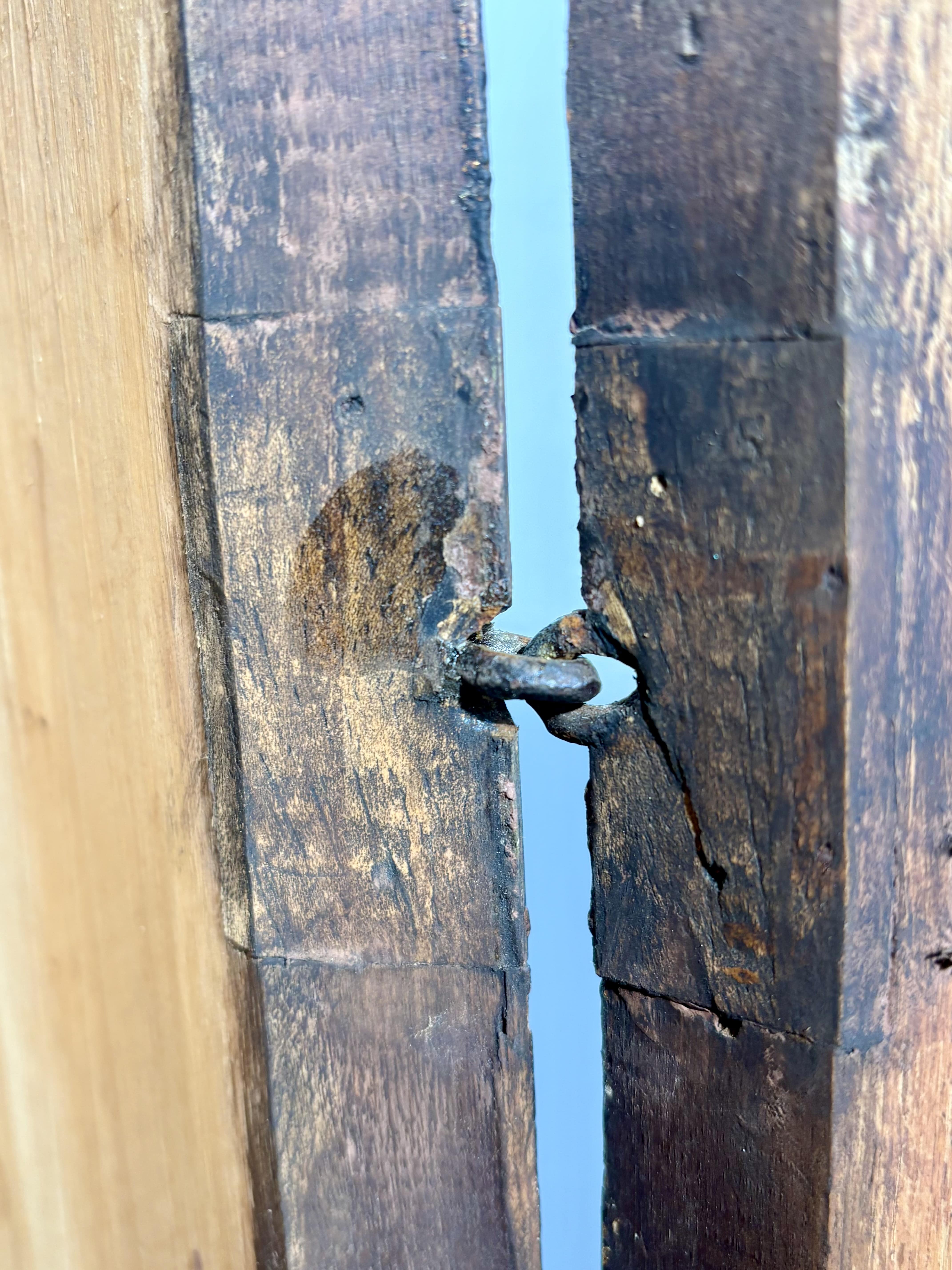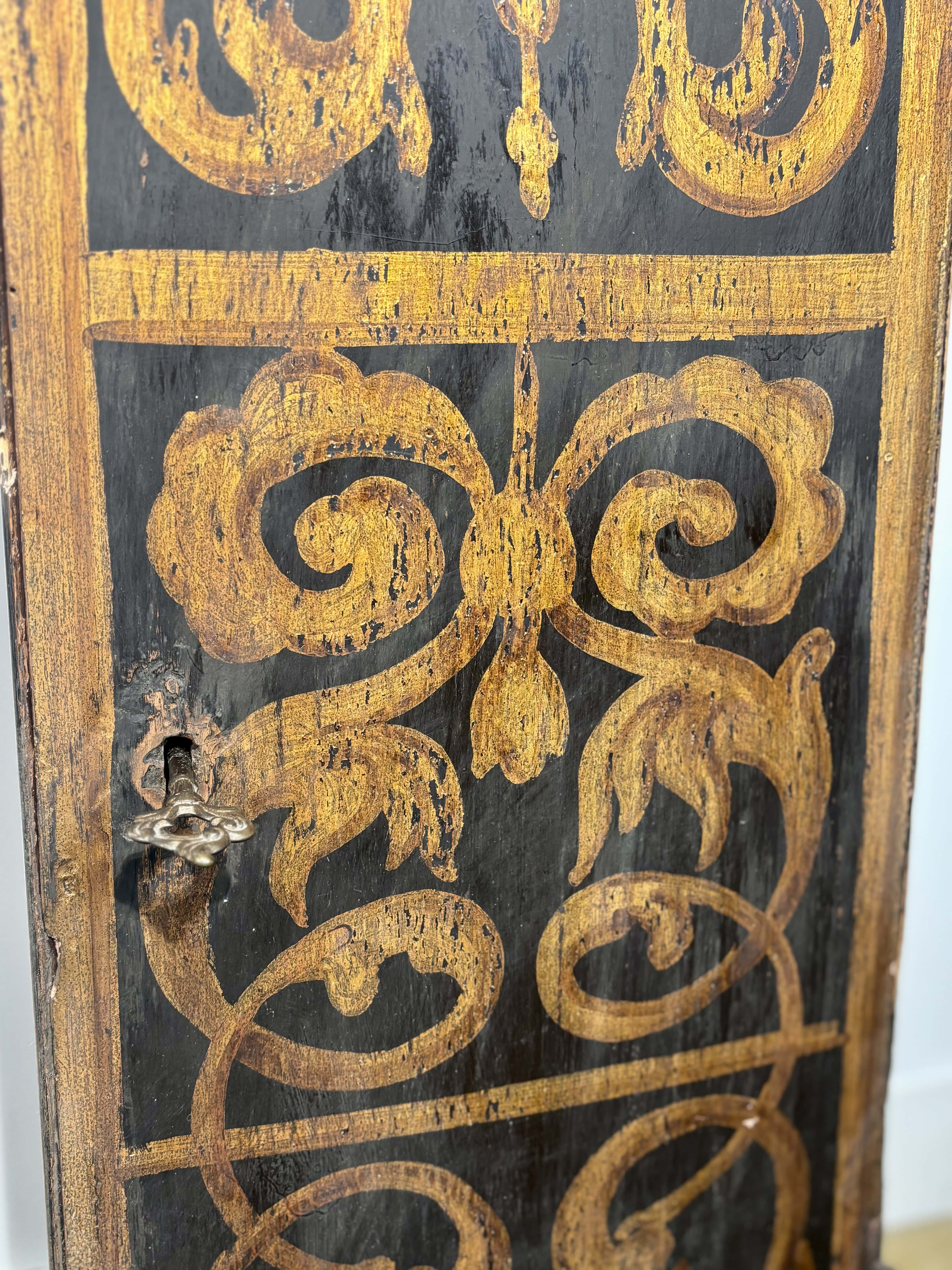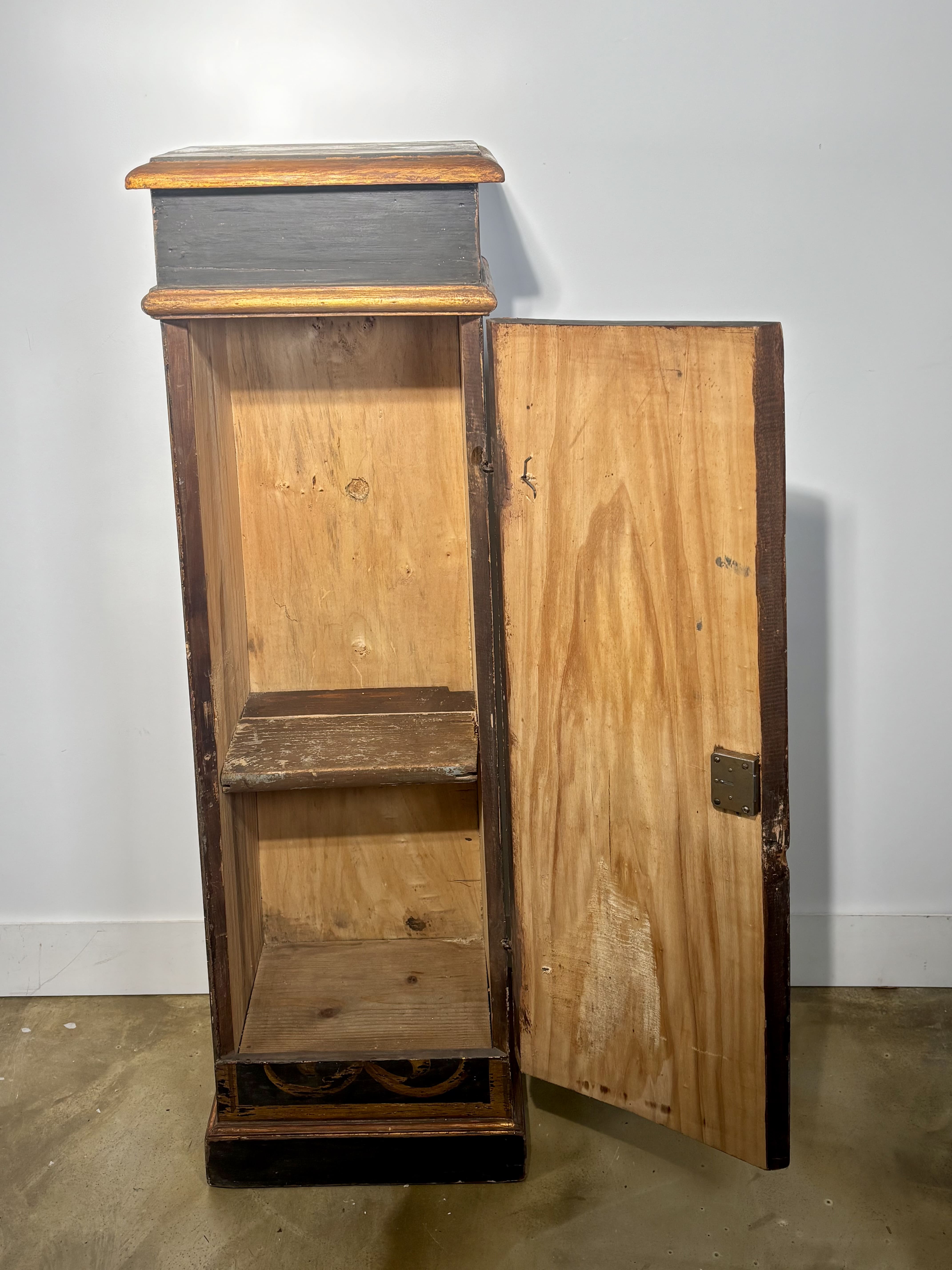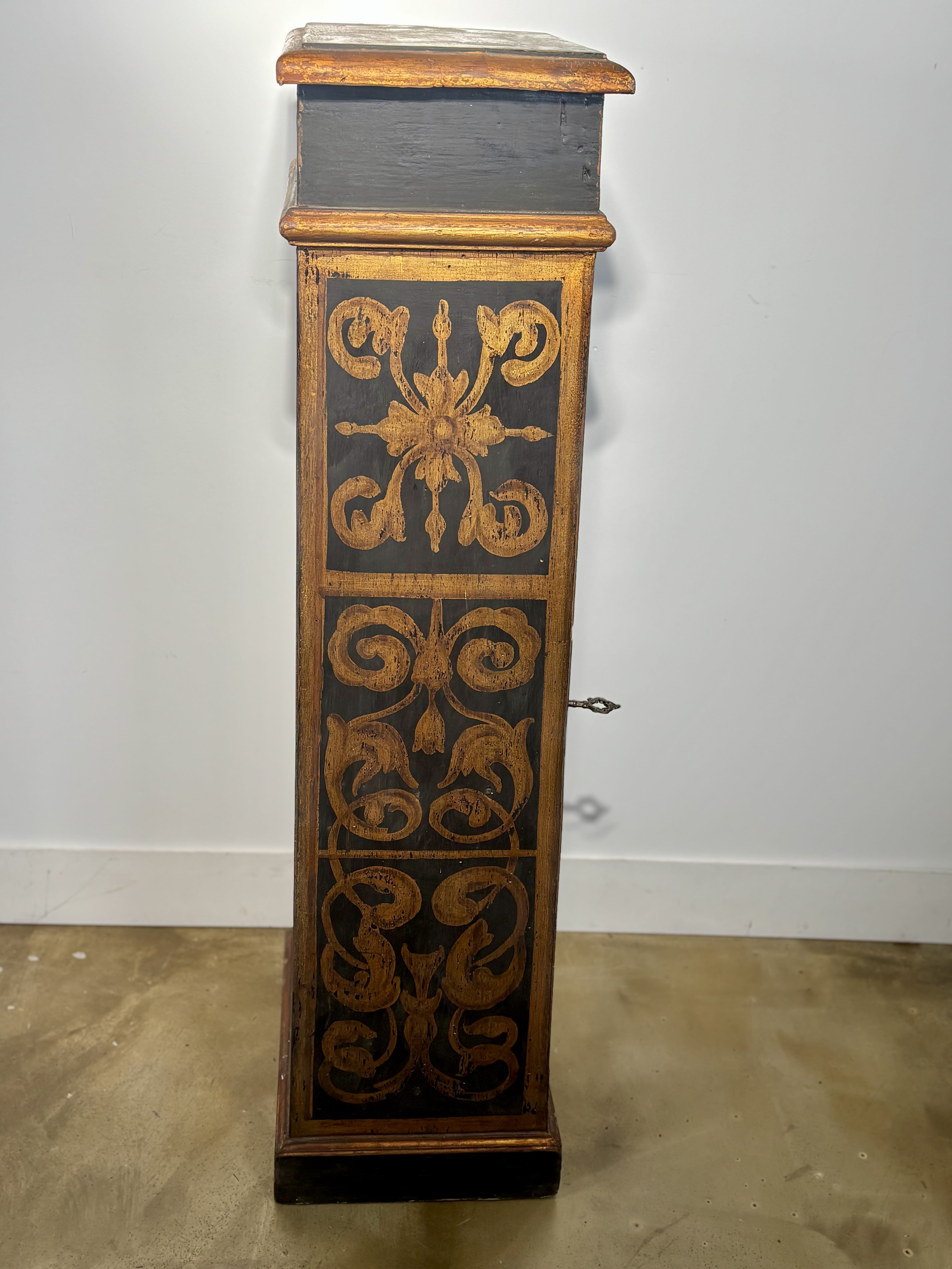 Elégante colonne d'appoint ou sellette de forme rectangulaire, réalisée en bois peint à fond noir profond, rehaussé d'un décor doré. Production italienne du XIXe siècle s'inspirant du répertoire ornemental du XVIIIe siècle. Les quatre faces présentent une composition symétrique de rinceaux feuillagés, fleurons et motifs floraux stylisés, finement exécuté en dorure mate sur fond noir. Le dessin conjugue une rigueur néo-classique à des réminiscences baroques, conférant à la pièce une présence architecturale affirmée. La colonne ouvre par une porte latérale munie de ferrures anciennes d'origine, donnant accès à un intérieur en bois naturel, aménagé d'une étagère fixe. La structure repose sur une base moulurée sobre, et est surmontée d'un plateau supérieur débordant, aux arêtes adoucies, également soulignées de dorure. Polychromie conservée avec des usures cohérentes avec l'âge. A mi chemin entre mobilier et élément décoratif servant à la fois de colonne décorative, de support d'objets ou de petit meuble de rangement discret.