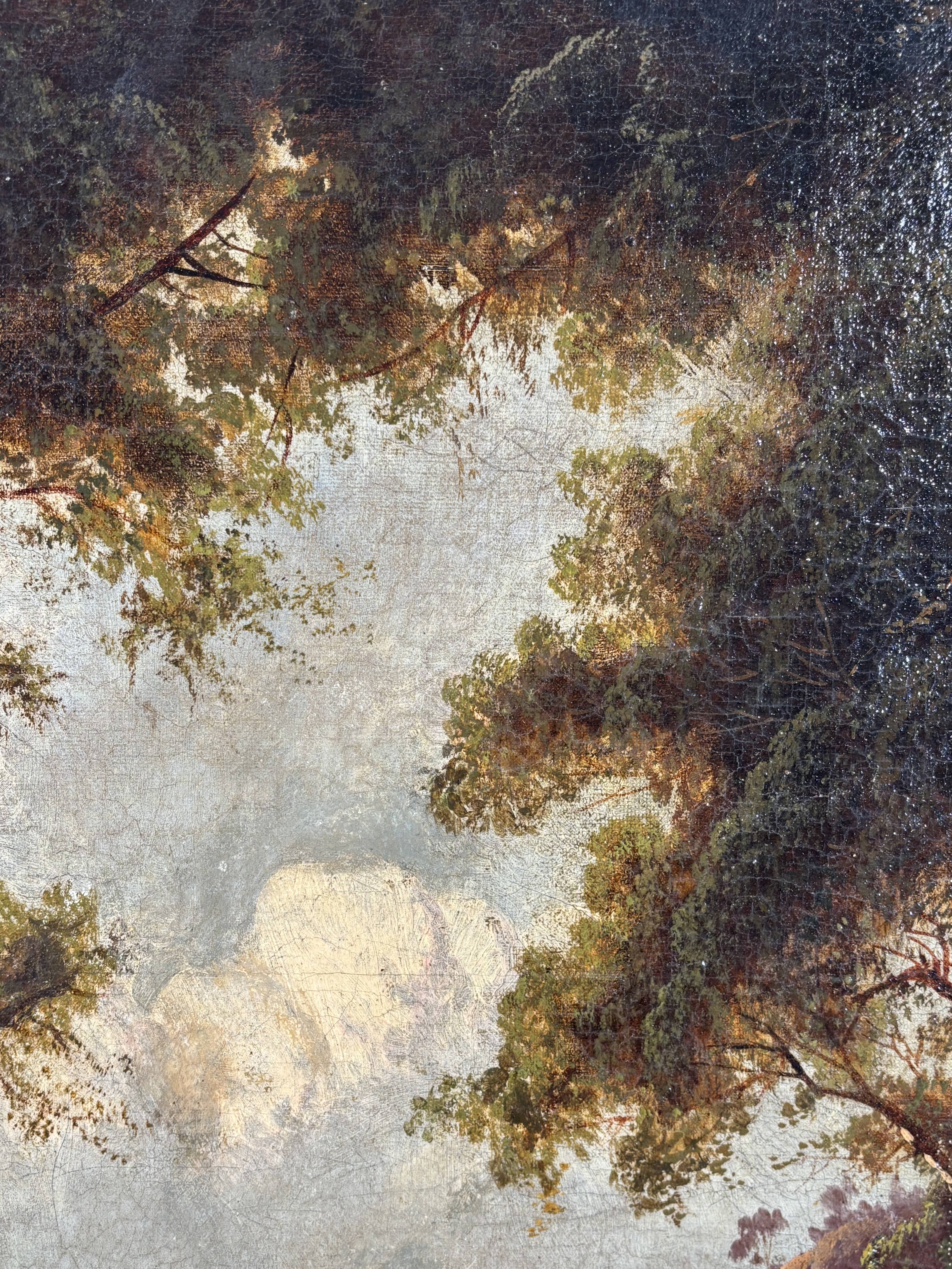 Ecole probablement Allemande représentant un paysage romantique avec voyageur. Très beau tableau ancien figurant un paysage romantique animé d'un personnage solitaire de dos, cheminant dans une vallée rocheuse dominée par de grands arbres. La composition s'organise autour d'un jeu de clair-obscur, une ouverture lumineuse au centre révèle un horizon montagneux, tandis que les masses sombres des arbres et des rochers encadrent la scène avec puissance. L'iconographie du Wanderer -figure chère à la tradition allemande - confère à l'oeuvre une dimension symbolique et introspective, héritée du romantisme du XIXe siècle. La touche est vive dans les rochers, plus fondue dans les ciels et feuillages, avec une palette chaude de bruns, d'ocres et de verts profonds, typique des écoles germaniques. Belle patine ancienne, réentoilée, montée sur chassis d'origine à clés.