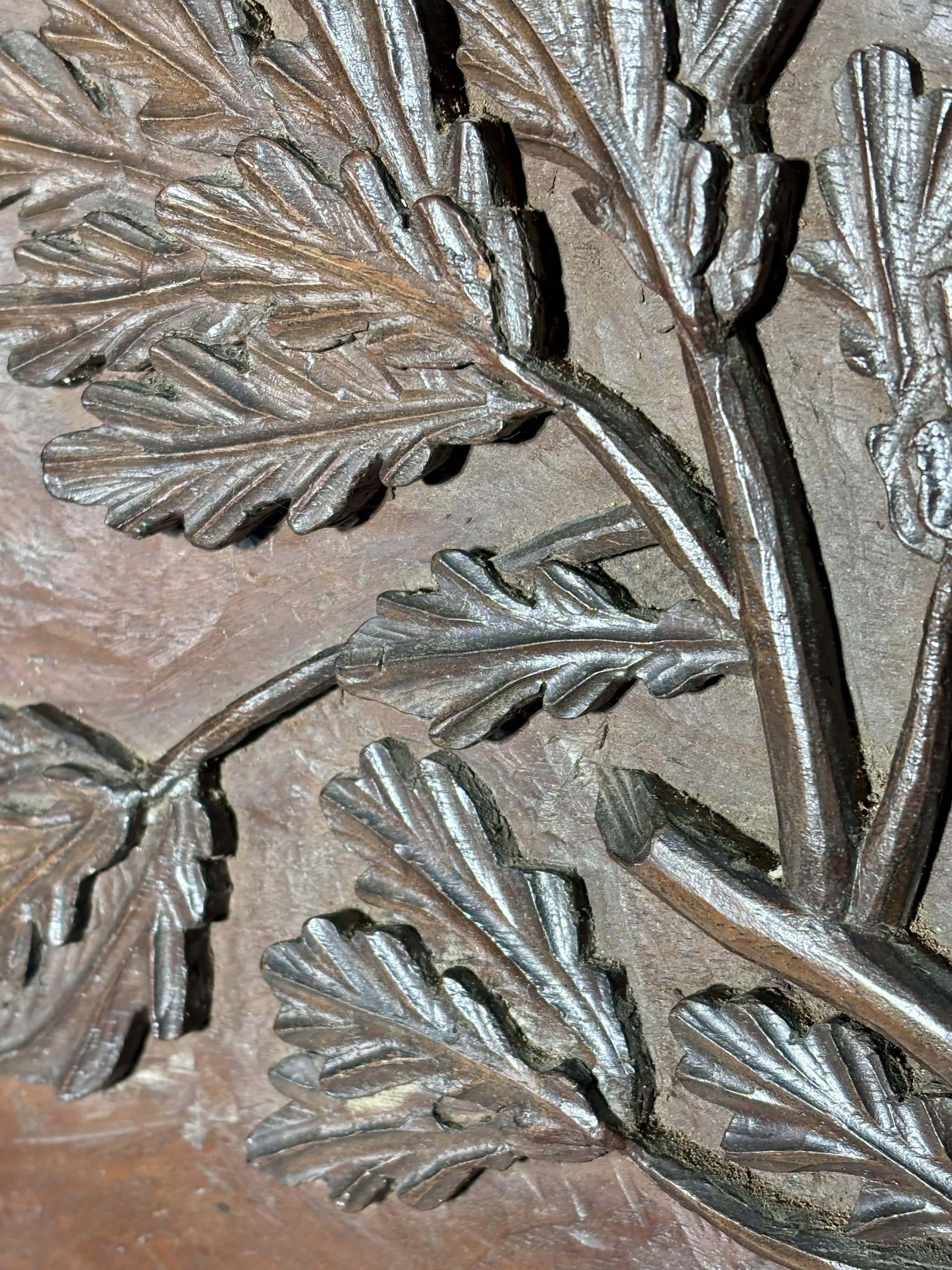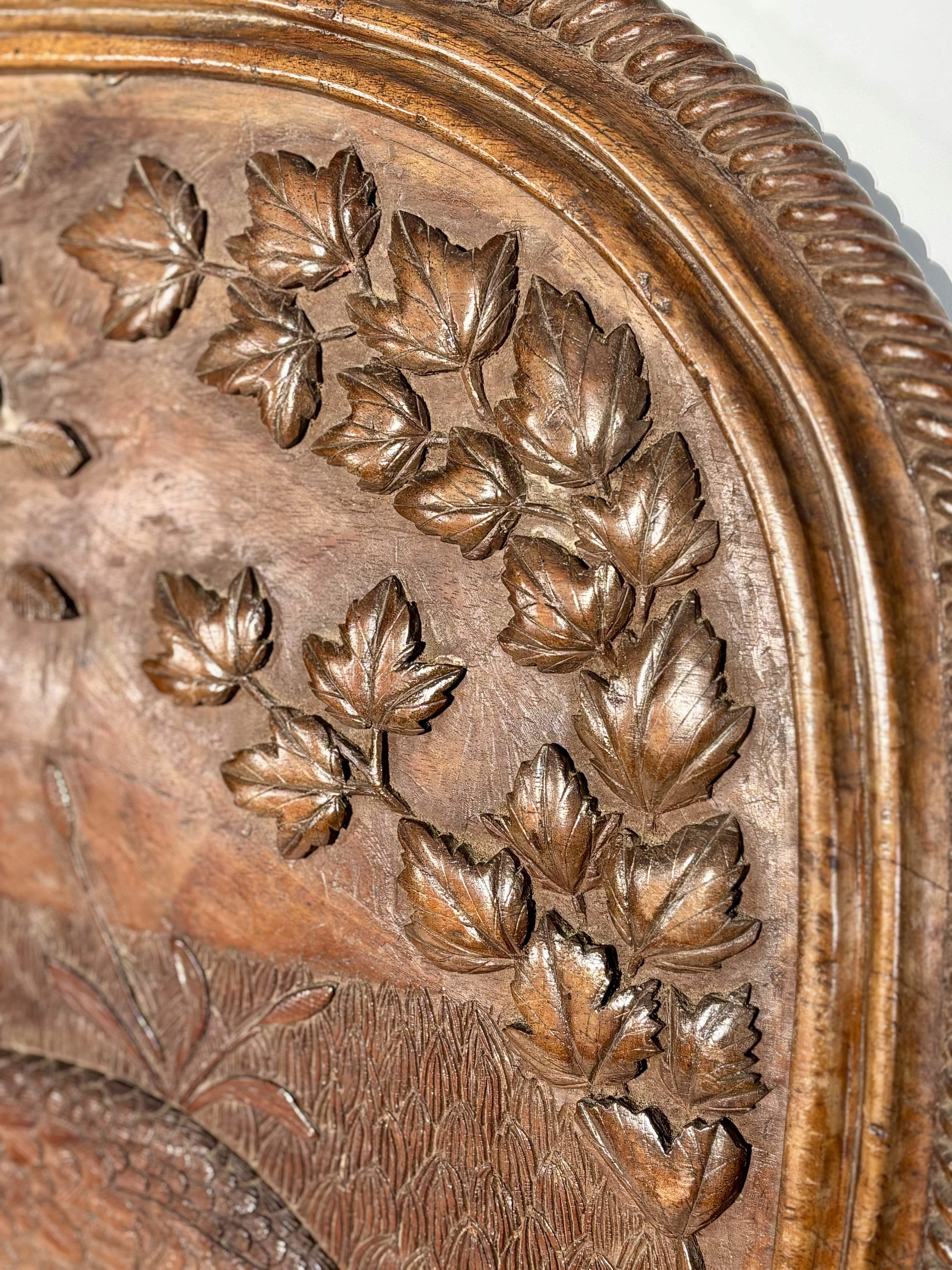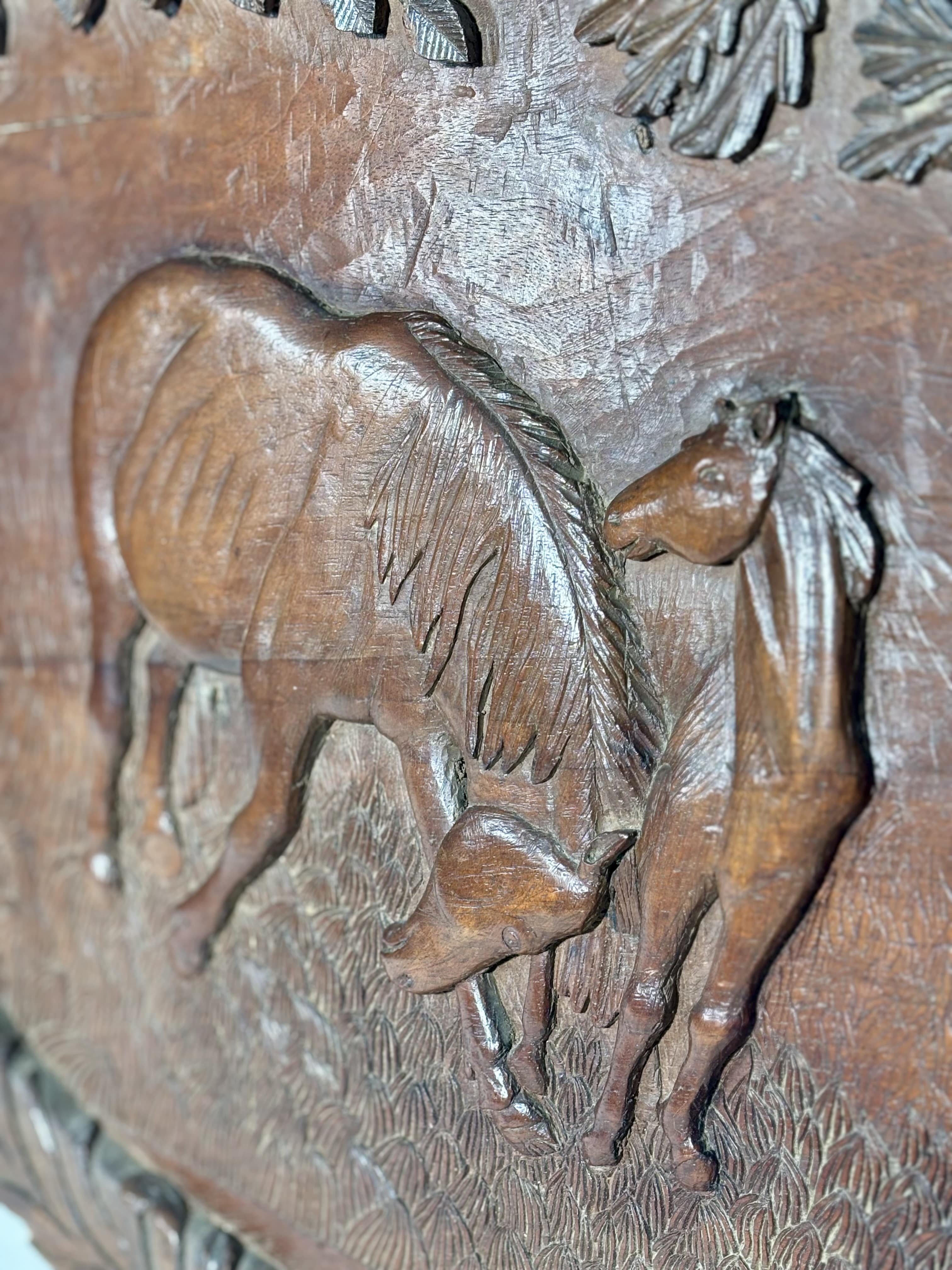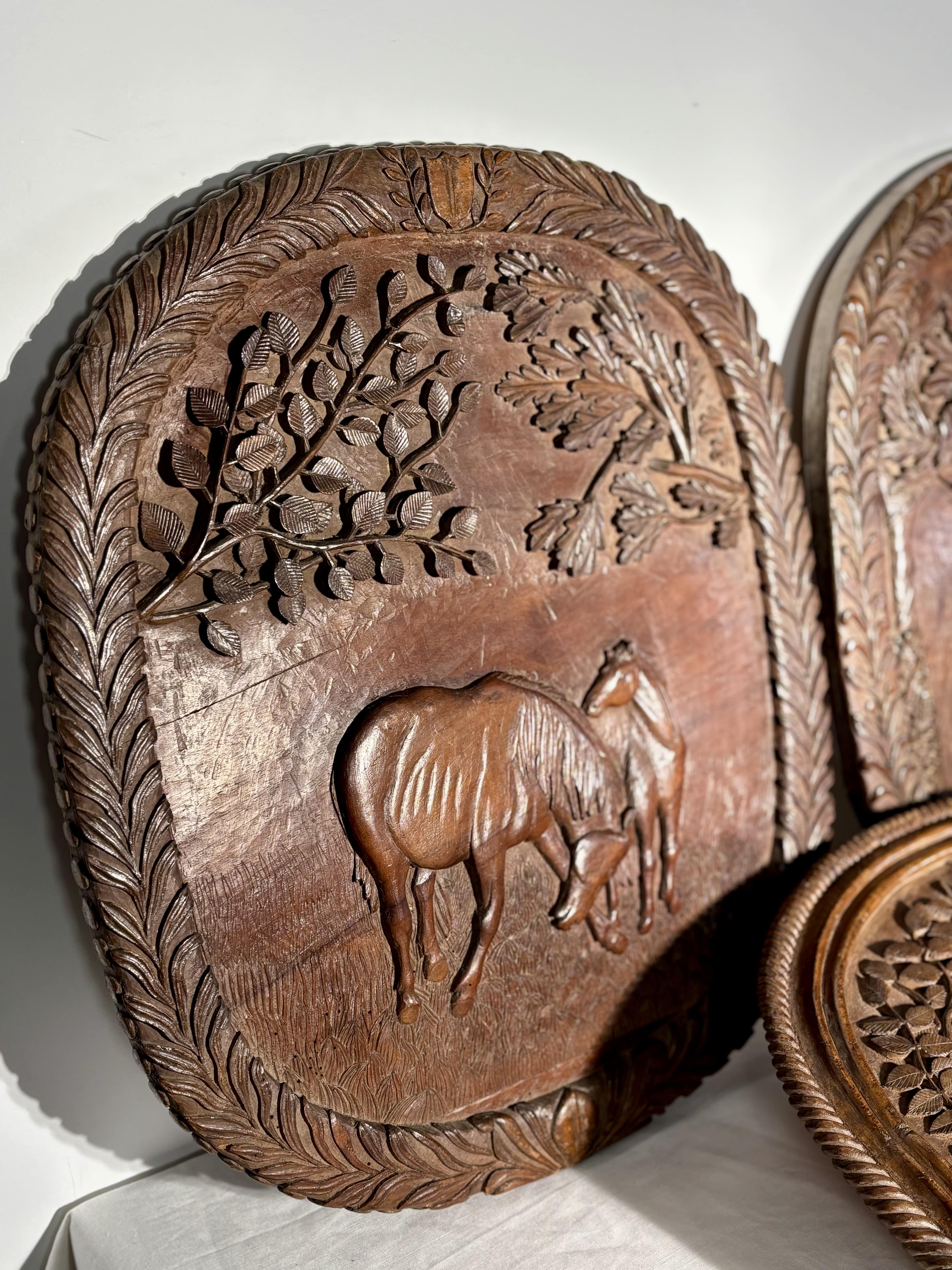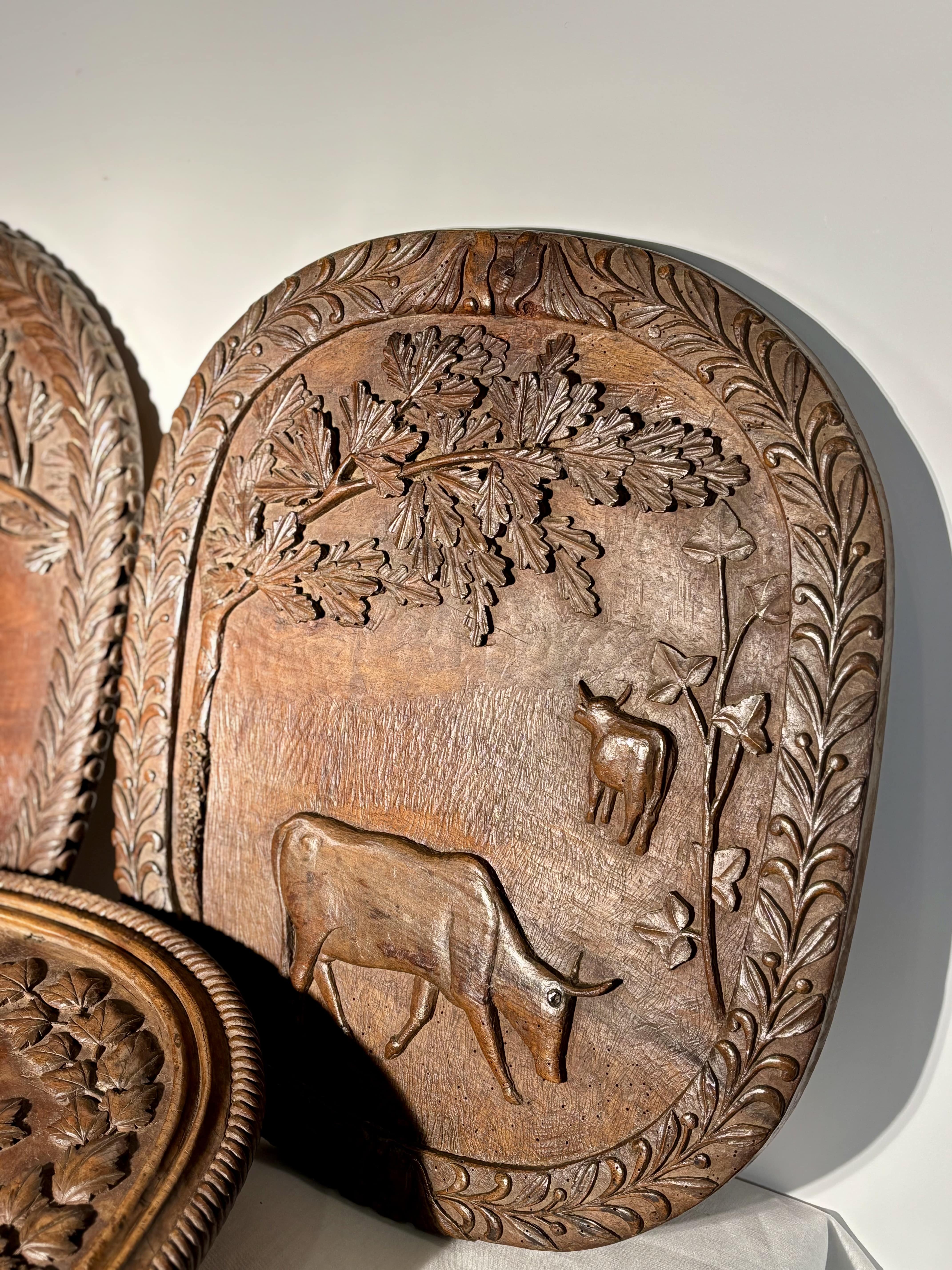 Ensemble de trois panneaux en bois sculpté, réalisés en monoxyle, représentant des scènes animalières. Chaque panneau est taillé dans un seul bloc de bois et présente un relief profond, un trait franc, ainsi qu'un bel ensemble de motifs végétaux, feuillages et encadrements entièrement sculptés à la main. Les scènes représentent une jument et son poulain, un bovin au pâturage et une perdrix dans un décor rural, typiques du répertoire pastoral de la fin du XIXe et début XXe siècle. Le revers laissé brut montre des traces d'outils et confirme un travail traditionnel et authentique d'artisan. Très belle patine ancienne.