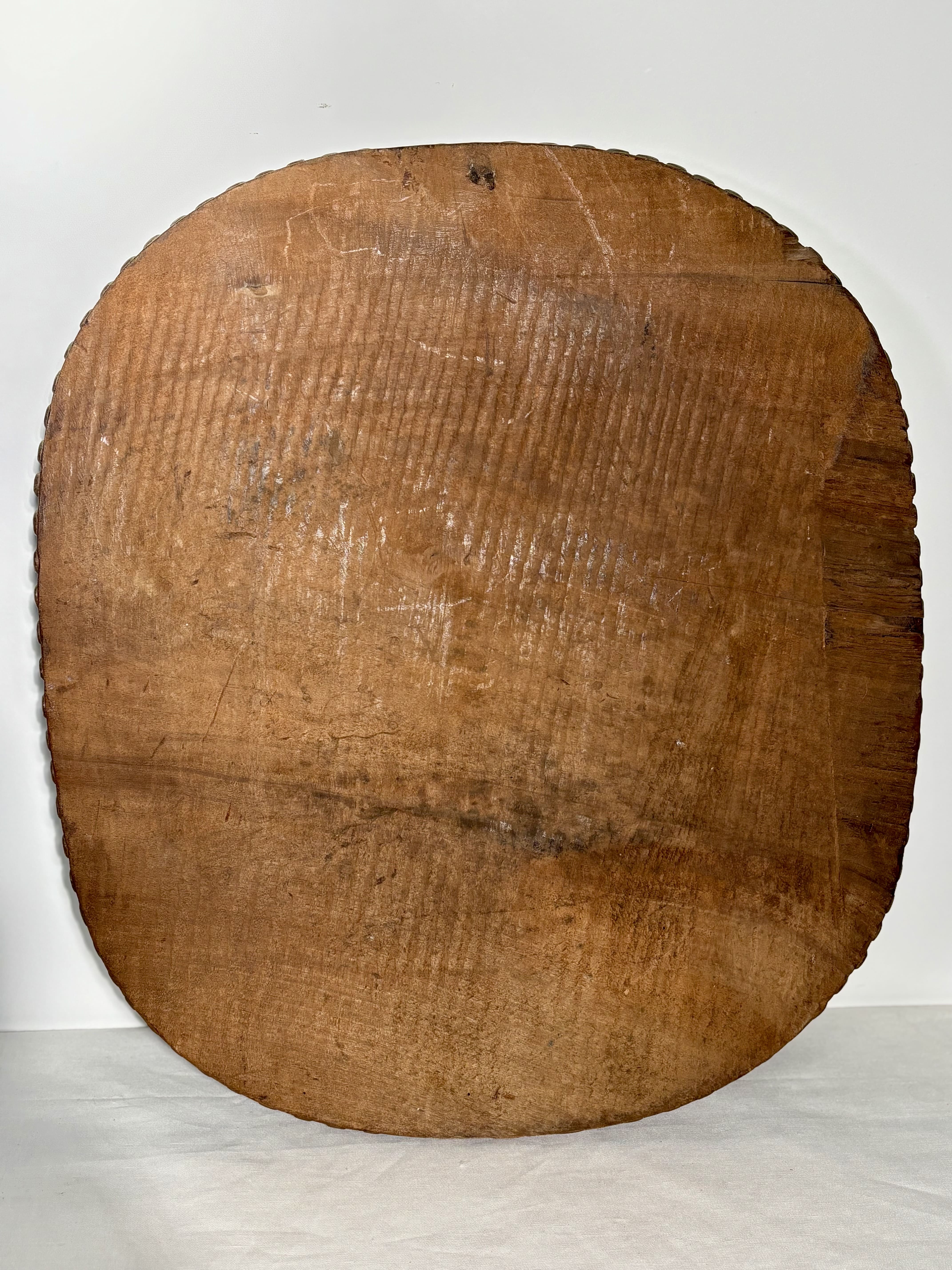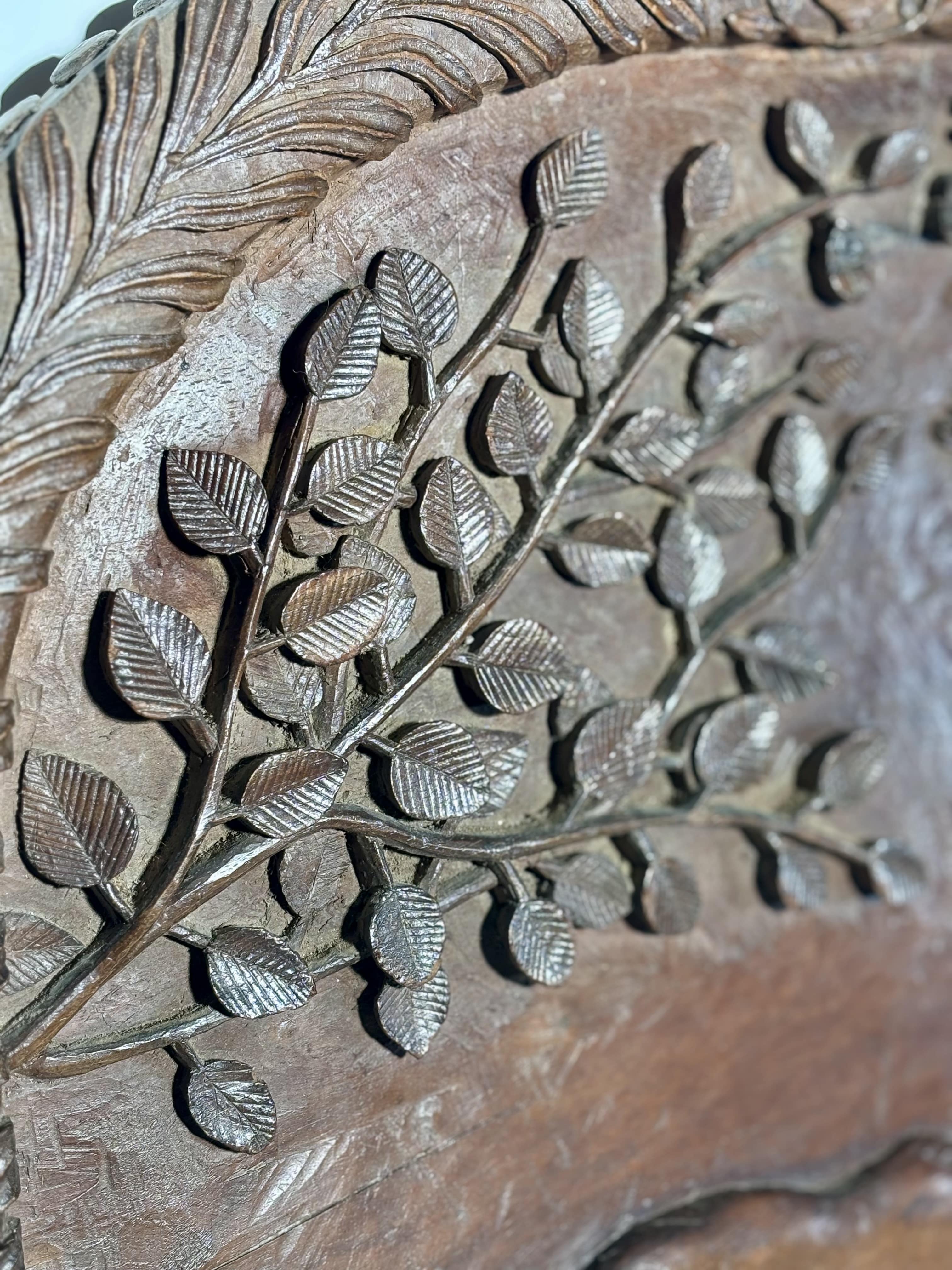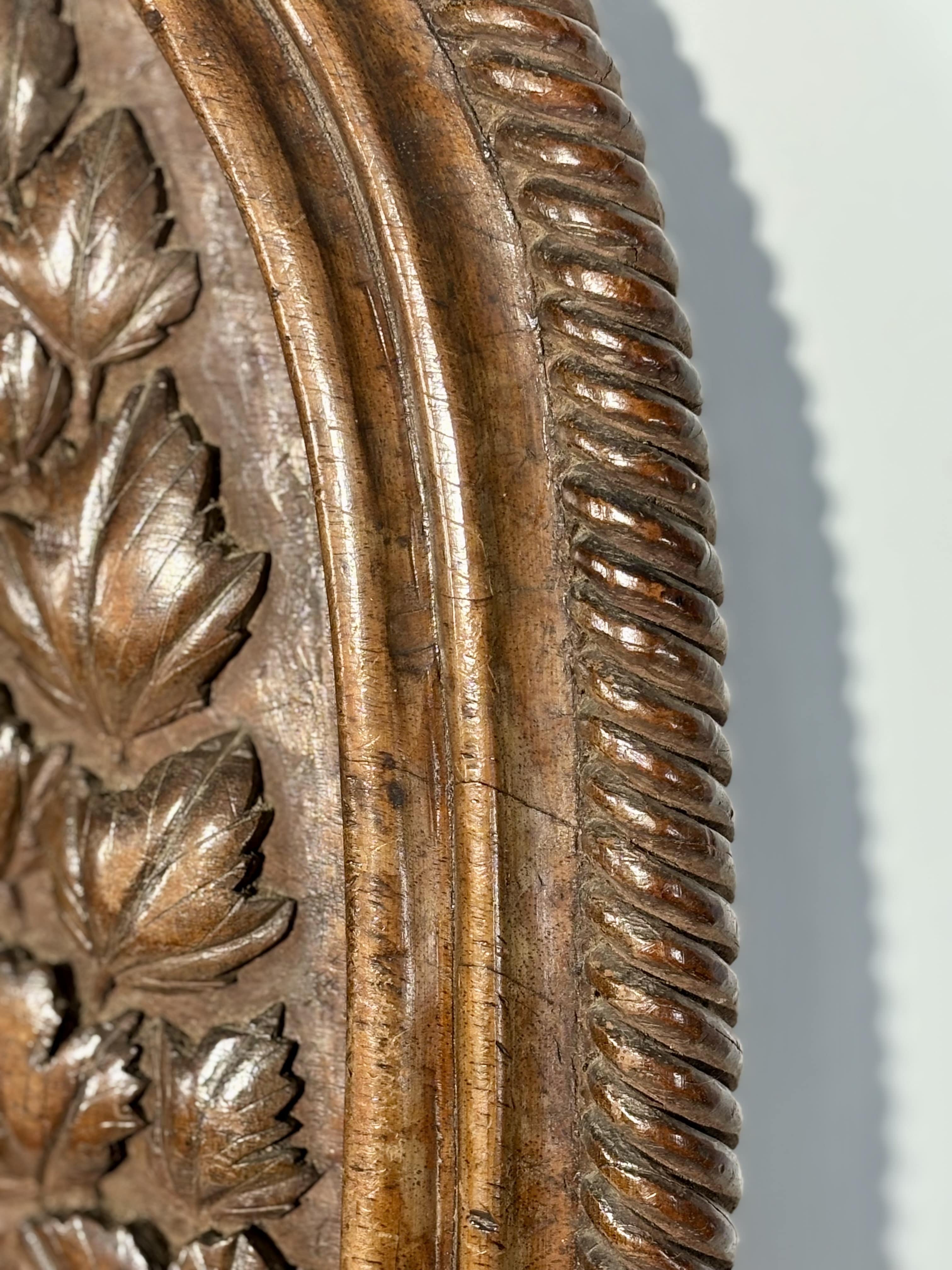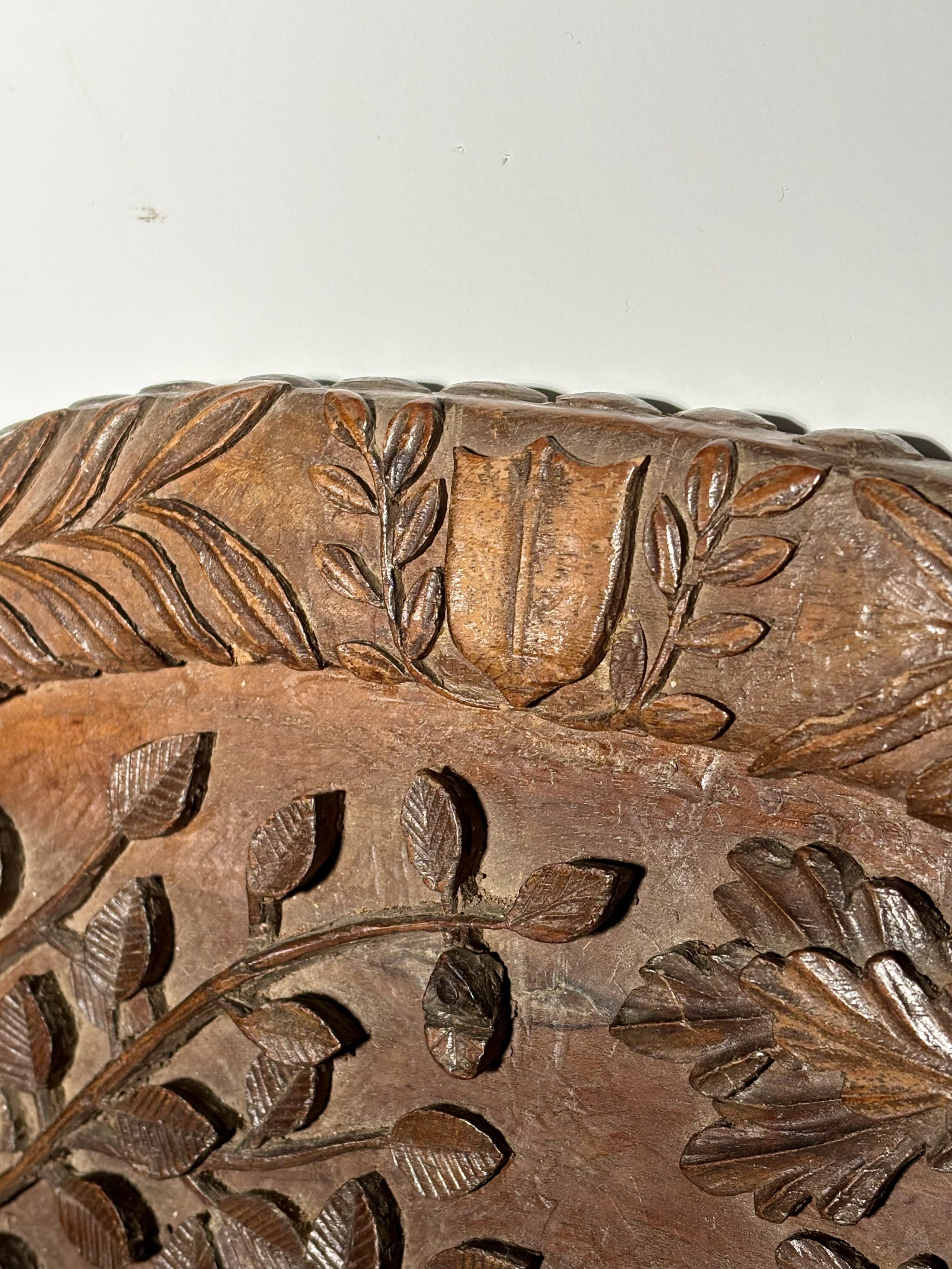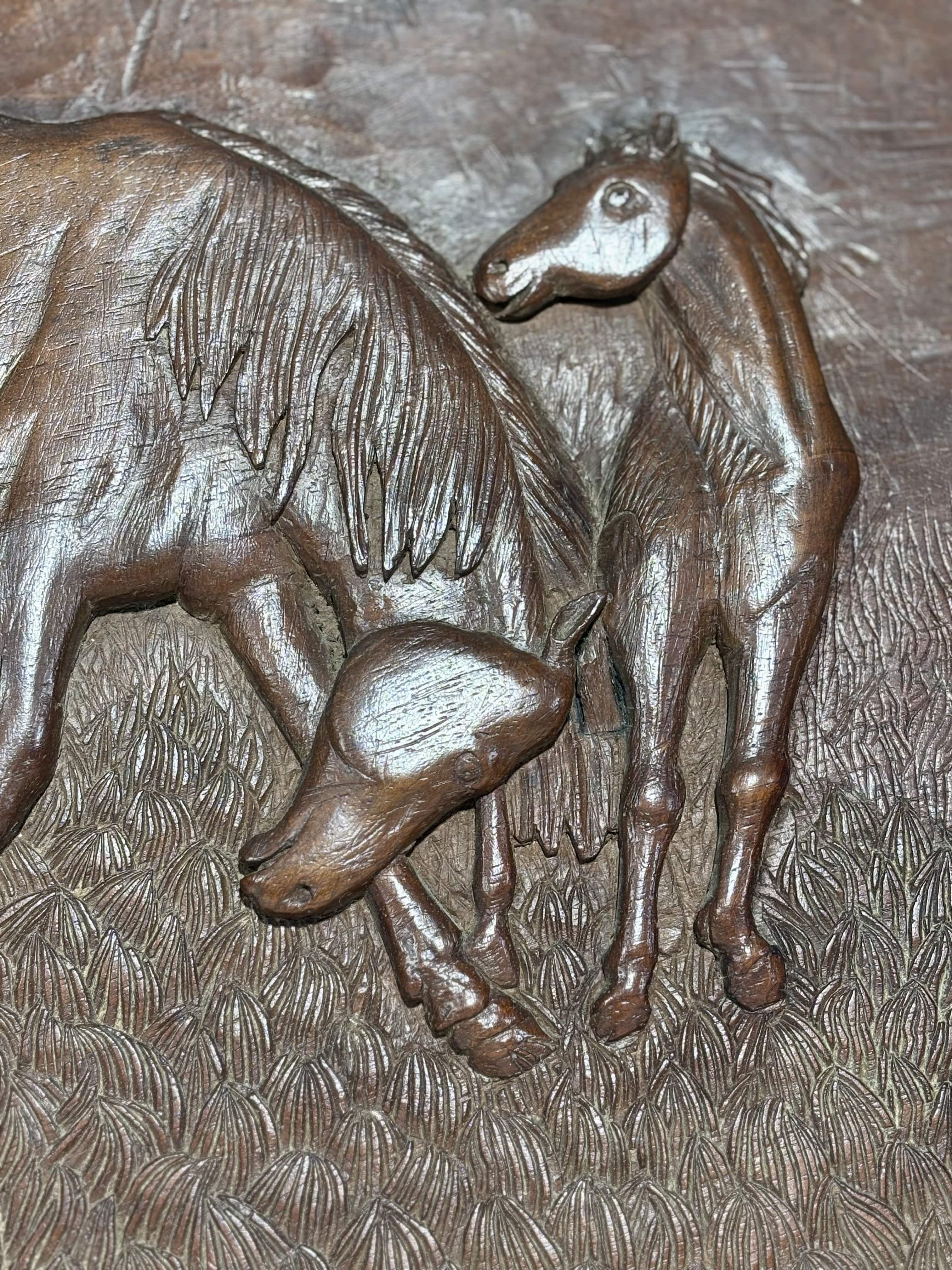 Ensemble de trois panneaux en bois sculpté, réalisés en monoxyle, représentant des scènes animalières. Chaque panneau est taillé dans un seul bloc de bois et présente un relief profond, un trait franc, ainsi qu'un bel ensemble de motifs végétaux, feuillages et encadrements entièrement sculptés à la main. Les scènes représentent une jument et son poulain, un bovin au pâturage et une perdrix dans un décor rural, typiques du répertoire pastoral de la fin du XIXe et début XXe siècle. Le revers laissé brut montre des traces d'outils et confirme un travail traditionnel et authentique d'artisan. Très belle patine ancienne.