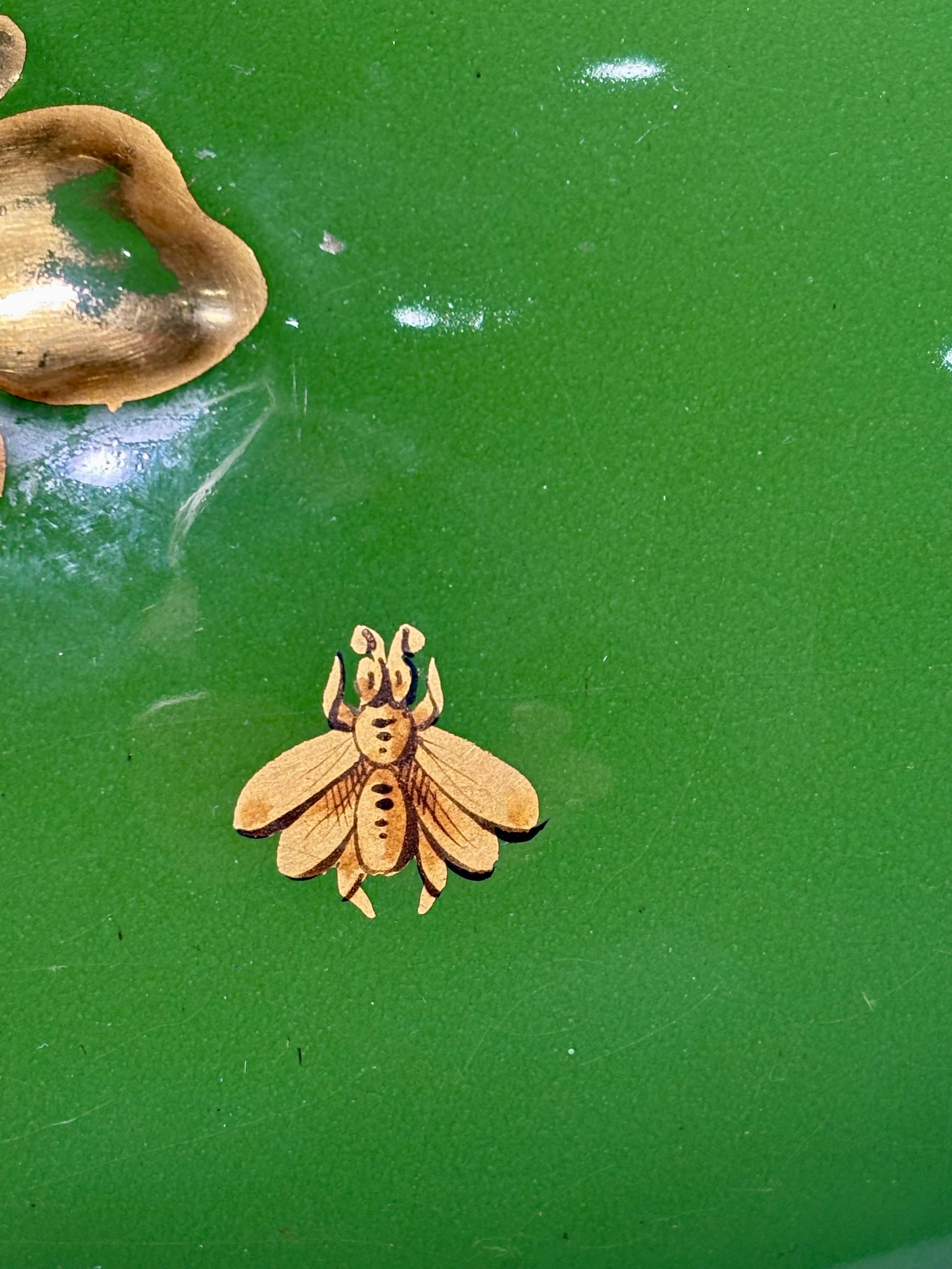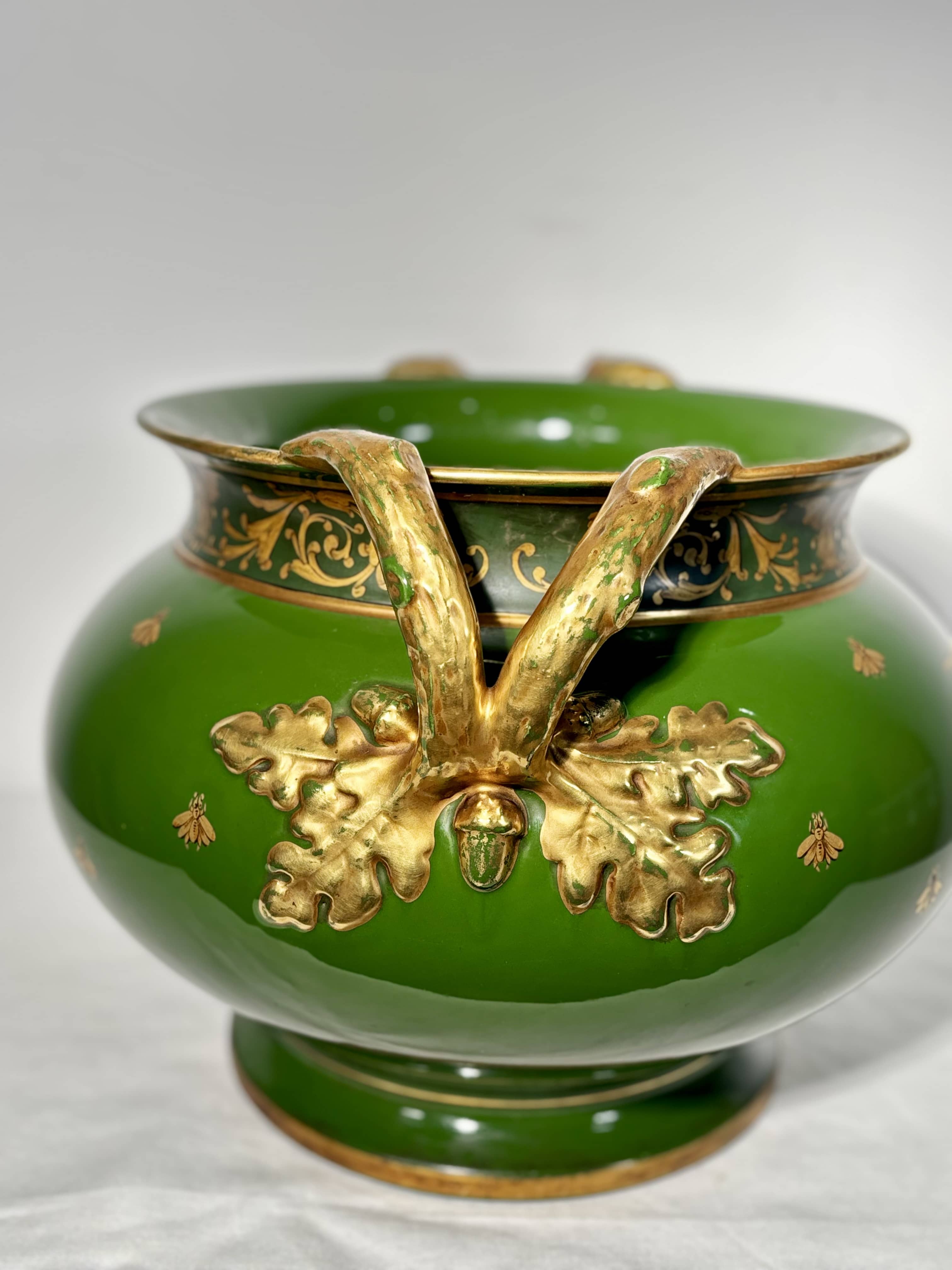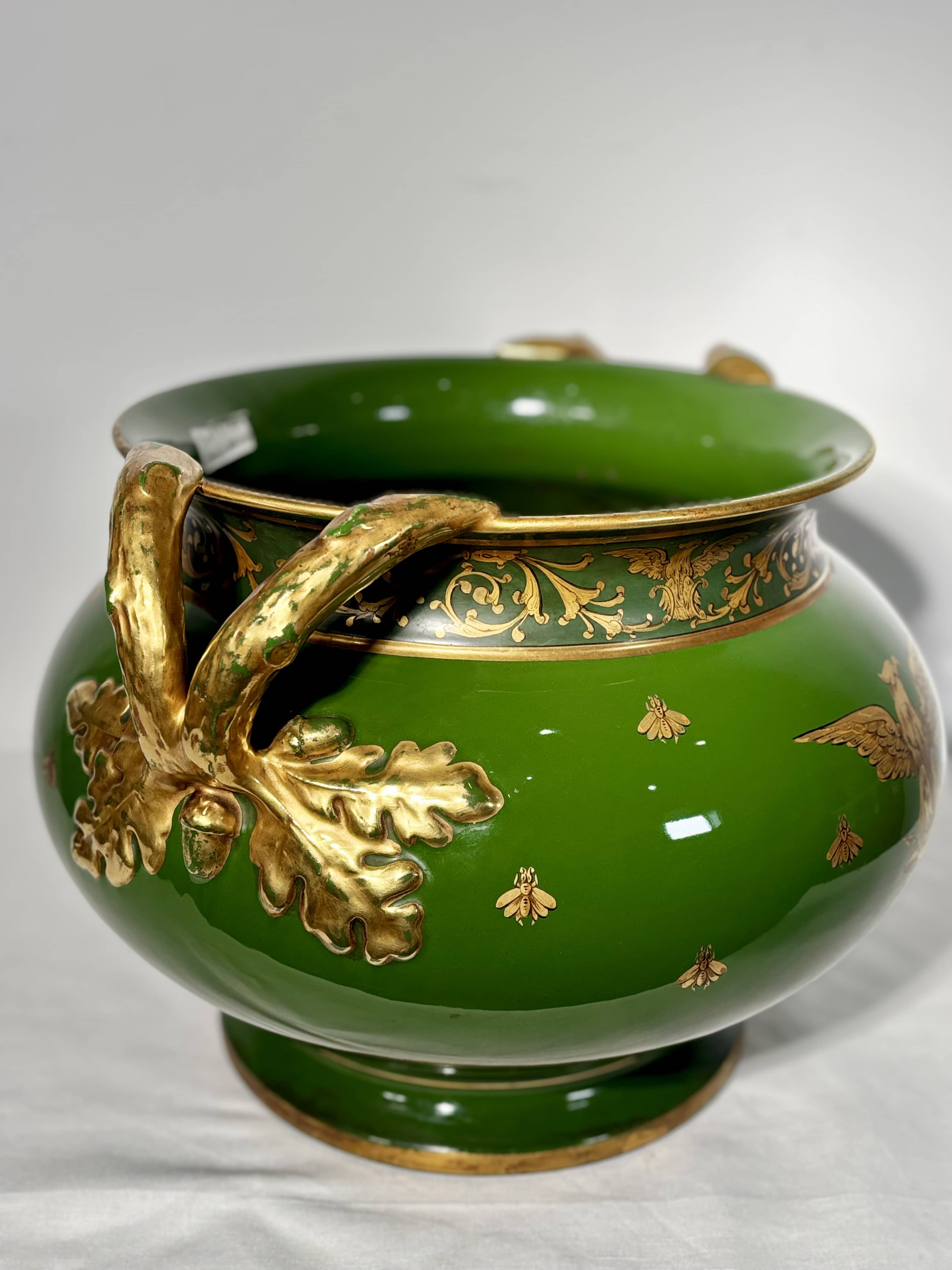 Splendide jardinière de prestige en faïence de grand feu, sortie des ateliers de la célèbre manufacture tourangelle Jaget et Pinon (période 1890-1919). Cette pièce maîtresse se distingue par son décor "aux Aigles et aux Abeilles", iconographie la plus noble et la plus recherchée de la production de Touraine. Colorie & Email: Email de fond vert Empire d'une rare profondeur, obtenu par une cuisson de grand feu, offrant un contraste saisissant avec la dorure Ornementation: Riche décor à l'or fin composé de deux Aigles Impériaux affrontés et d'un semis d'abeilles napoléoniennes Pièces latérales: Anses mouvementées en relief figurant des branches de chêne chargées de glands, emblèmes de force et de pérennité, entièrement rehaussées d'or. Frise: Col ceinturé d'une frise de rinceaux néoclassiques et de palmettes sur bandeau vert sombre. Etat parfait de conservation. Email très brillant. Dorure présentant de légères usures d'usage sur les reliefs conformes à son ancienneté. Poids 6,700 kg