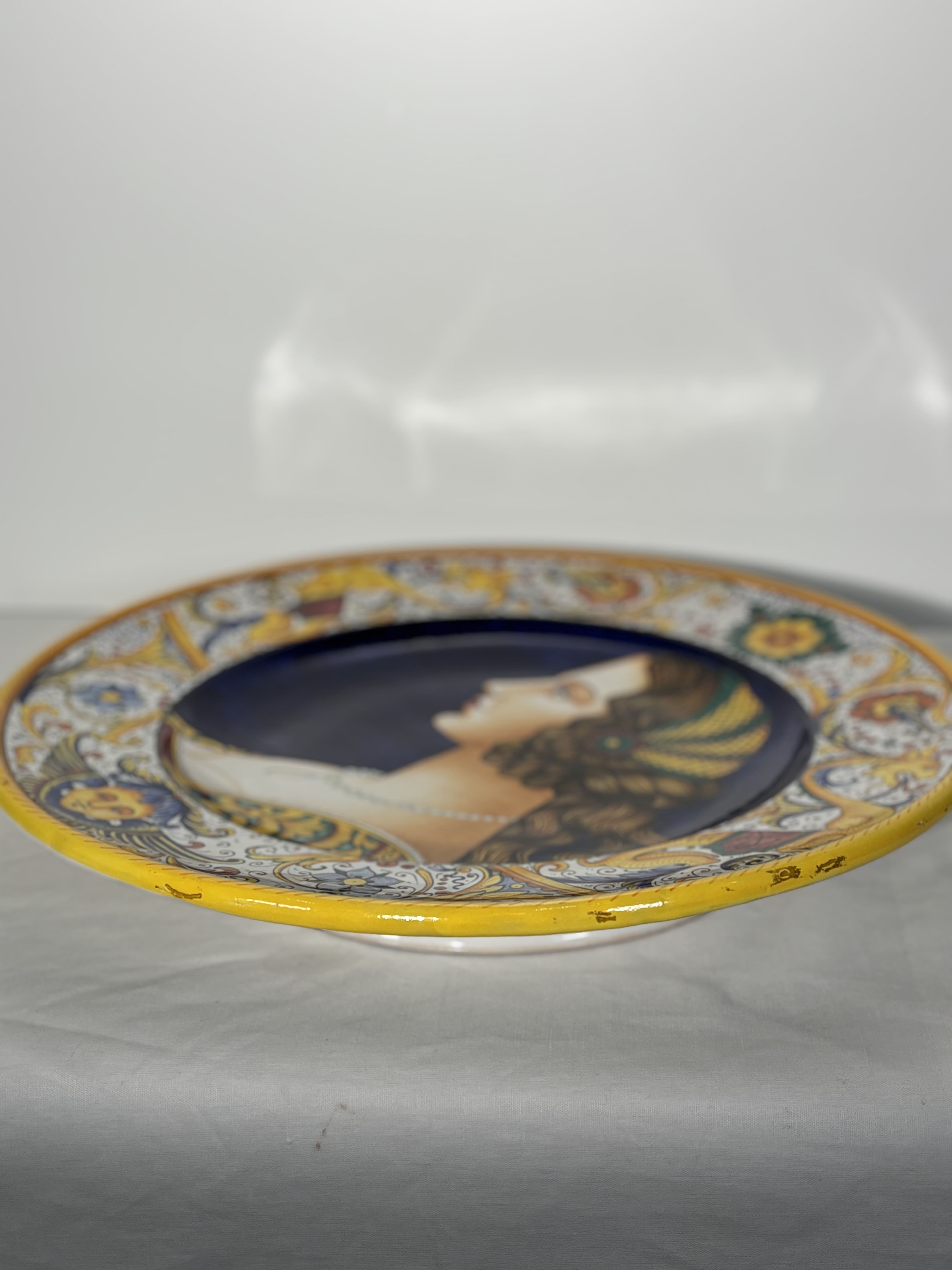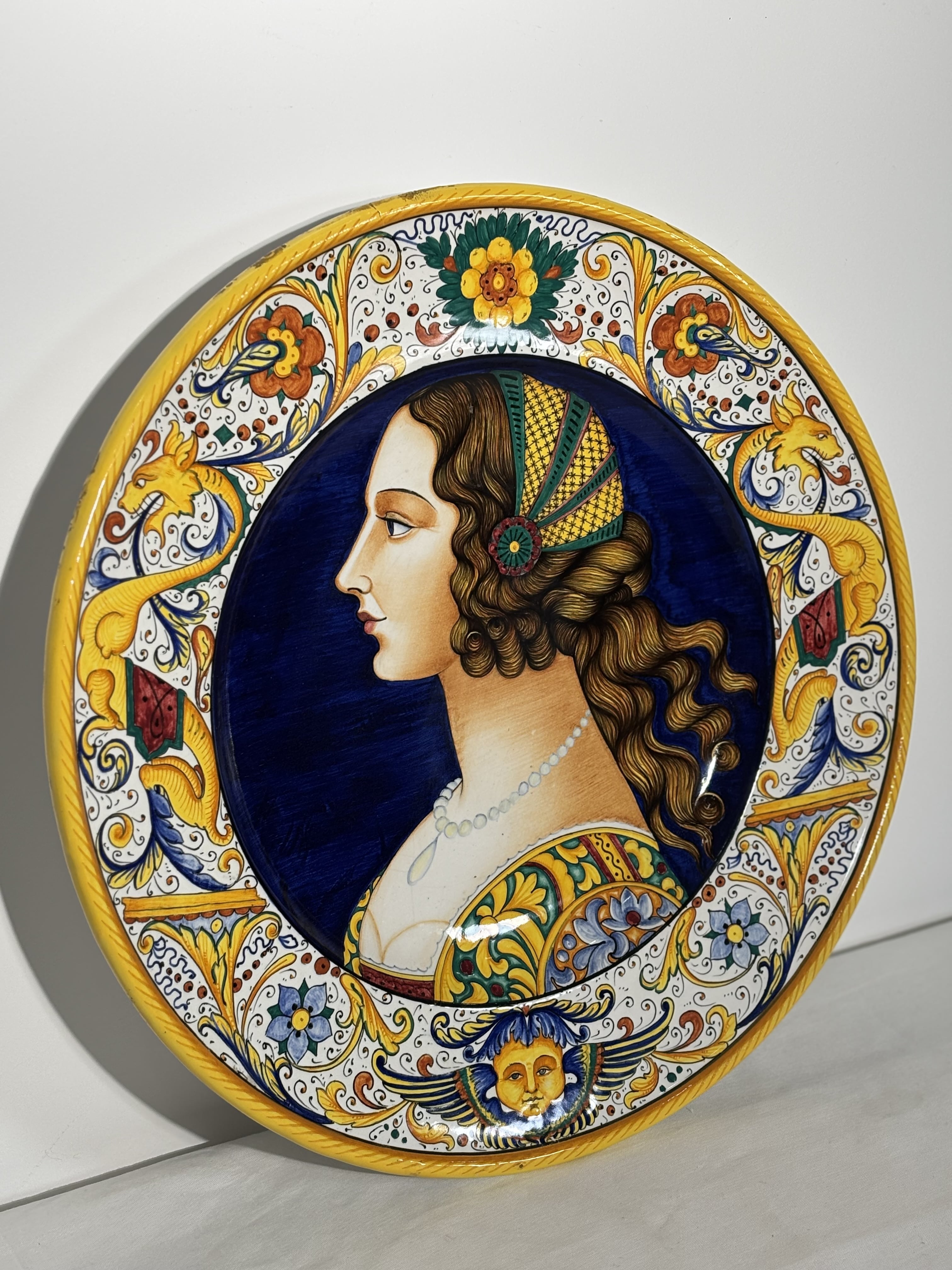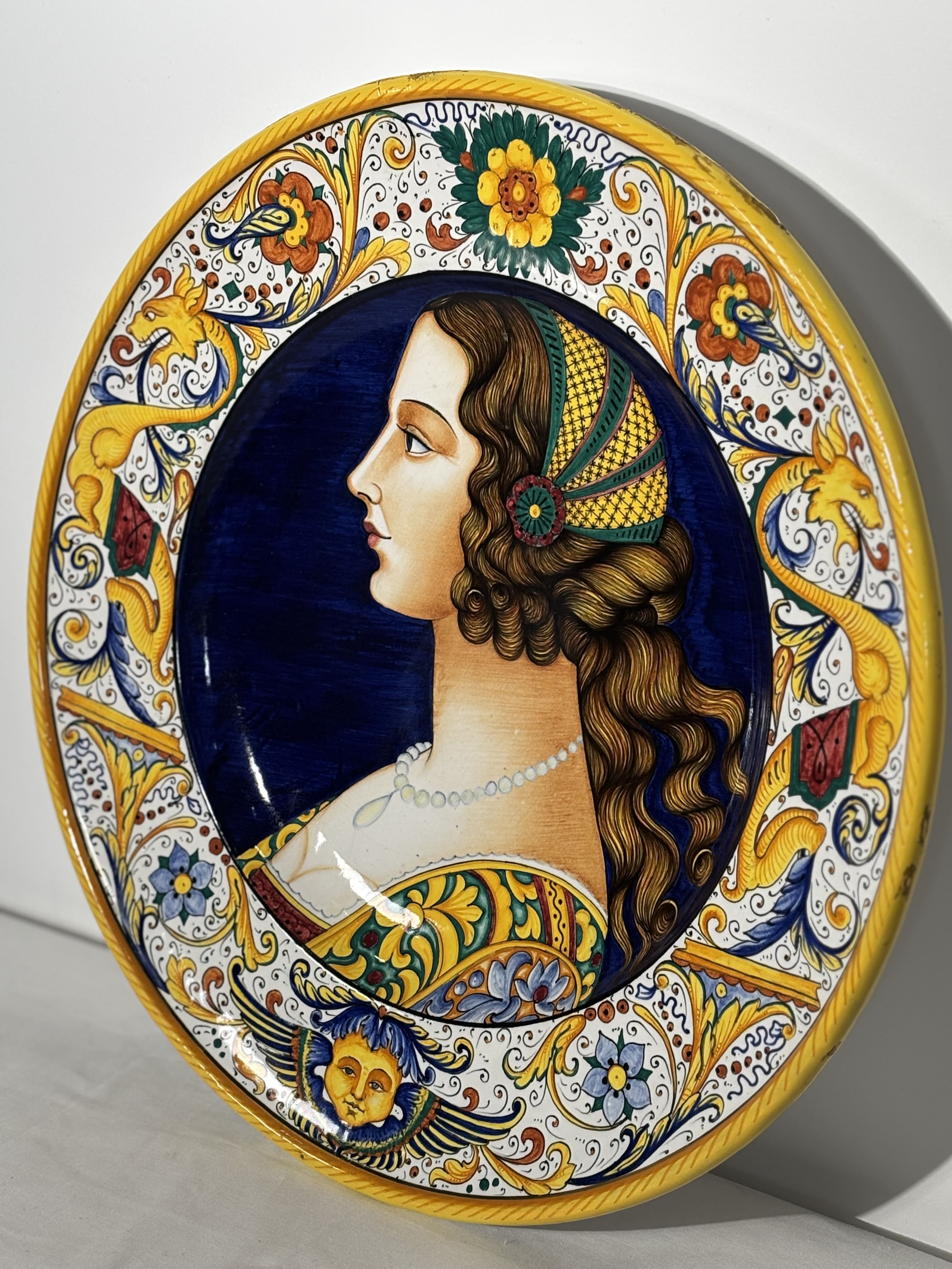 Elégant et large plat en majolique provenant des ateliers de Deruta, célèbre centre italien de céramique en Ombrie. Signé "S. Volpi" "In Deruta" Serafino Volpi, céramiste actif à Deruta entre 1916 et 1918, fut directeur de la manufacture « Maiolica Deruta ». En 1928, il fonda, en partenariat avec Gino Veschini, la manufacture « Maiolica Derutese Volpi ». L'année suivante, il en devint l'unique propriétaire. L'entreprise resta en activité jusqu'au début des années 1950. Serafino Volpi joua un rôle déterminant dans le rayonnement international de Deruta au XXe siècle, faisant de la ville l'un des principaux centres de production céramique d'Italie. Le plat représente un profil féminin à la manière des "Bella donna" de la Renaissance italienne. Le portrait d'une grande finesse de traits se détache sur un fond bleu profond. La bordure typique de la tradition derutienne présente un décor de dragons stylisés, feuillages, fleurs polychromes et mascaron. La palette est lumineuse. Quelques traces sur les bords. Italie, milieu XXe siècle. Signé S. Volpi, in Deruta