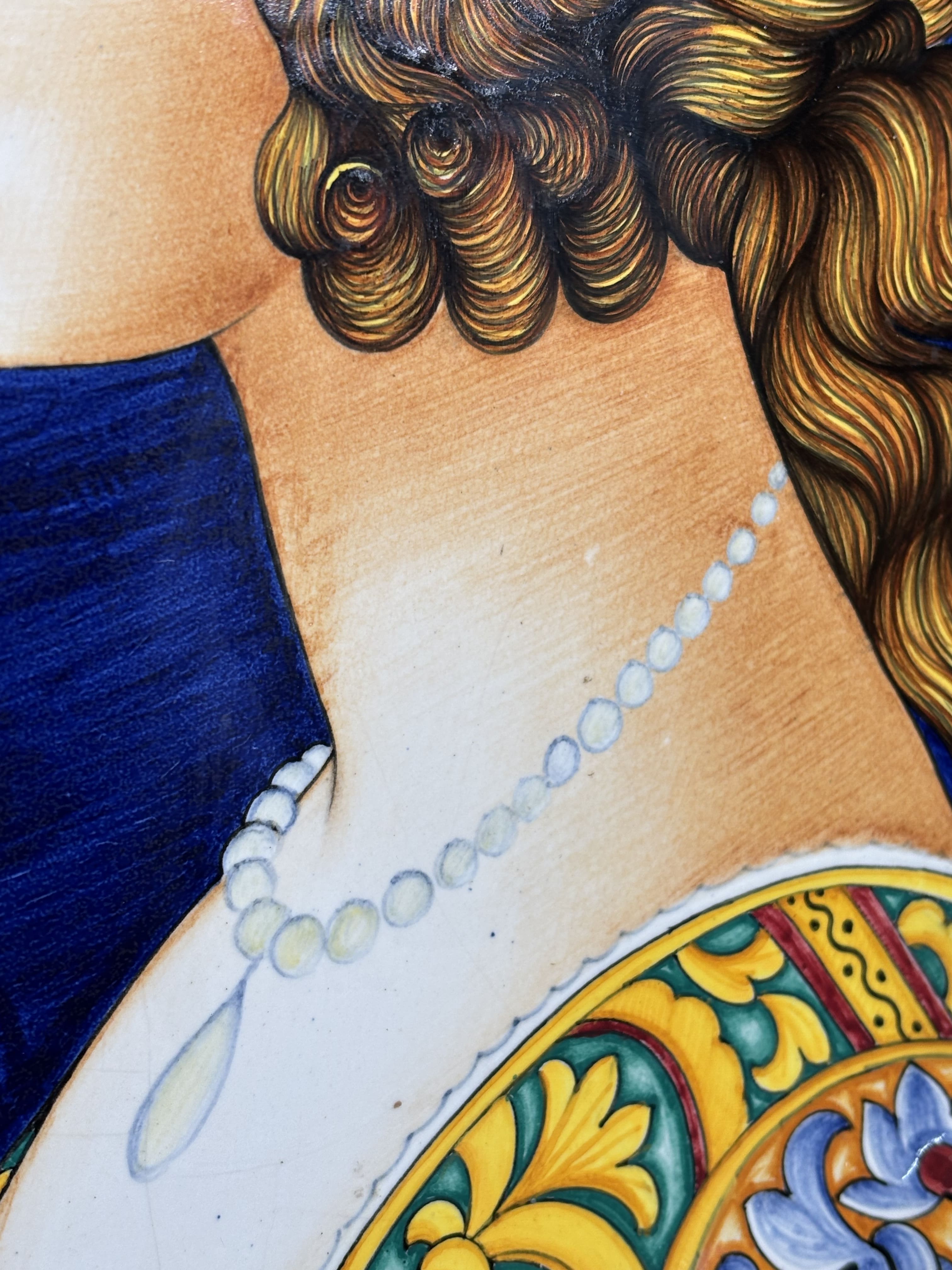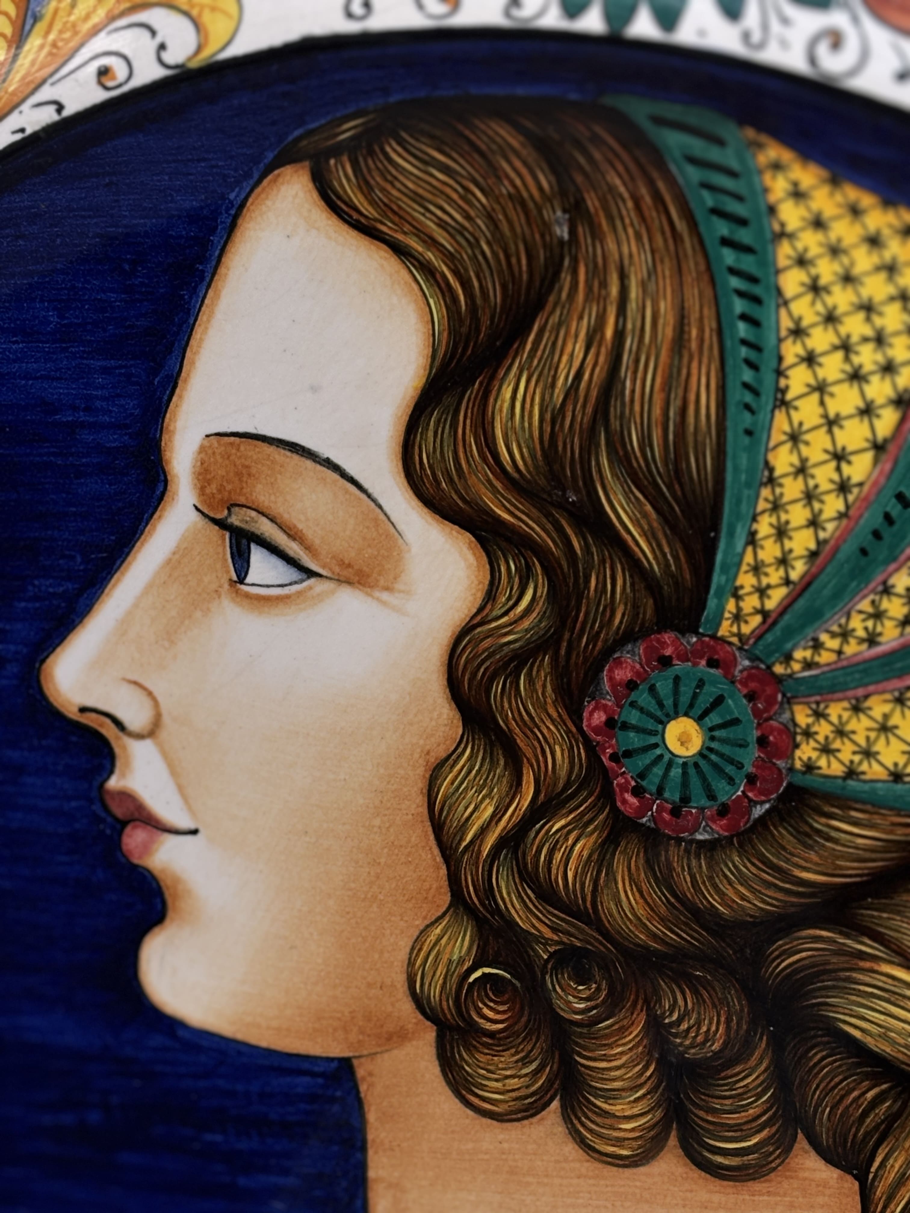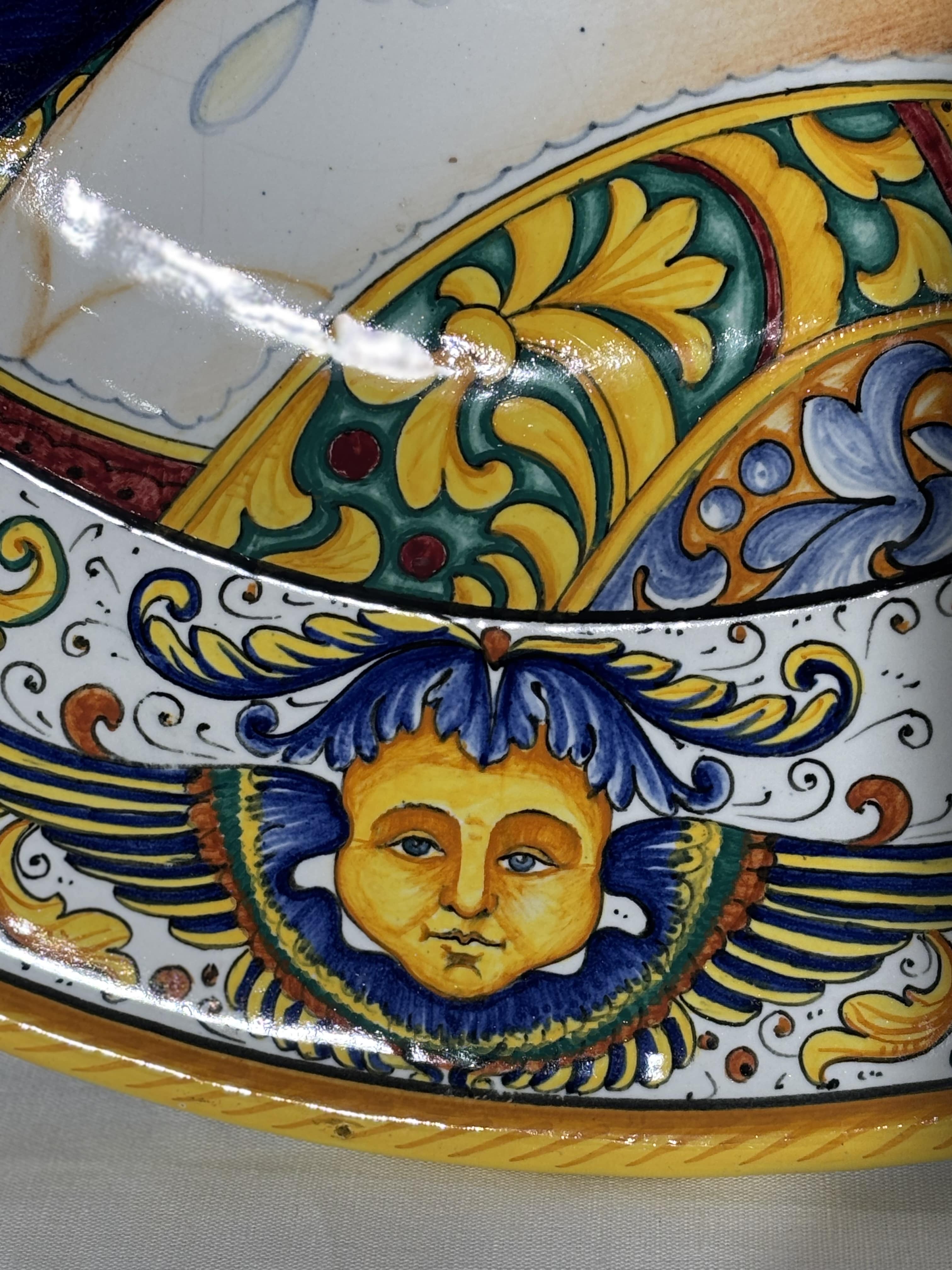 Elégant et large plat en majolique provenant des ateliers de Deruta, célèbre centre italien de céramique en Ombrie. Signé "S. Volpi" "In Deruta" Serafino Volpi, céramiste actif à Deruta entre 1916 et 1918, fut directeur de la manufacture « Maiolica Deruta ». En 1928, il fonda, en partenariat avec Gino Veschini, la manufacture « Maiolica Derutese Volpi ». L'année suivante, il en devint l'unique propriétaire. L'entreprise resta en activité jusqu'au début des années 1950. Serafino Volpi joua un rôle déterminant dans le rayonnement international de Deruta au XXe siècle, faisant de la ville l'un des principaux centres de production céramique d'Italie. Le plat représente un profil féminin à la manière des "Bella donna" de la Renaissance italienne. Le portrait d'une grande finesse de traits se détache sur un fond bleu profond. La bordure typique de la tradition derutienne présente un décor de dragons stylisés, feuillages, fleurs polychromes et mascaron. La palette est lumineuse. Quelques traces sur les bords. Italie, milieu XXe siècle. Signé S. Volpi, in Deruta