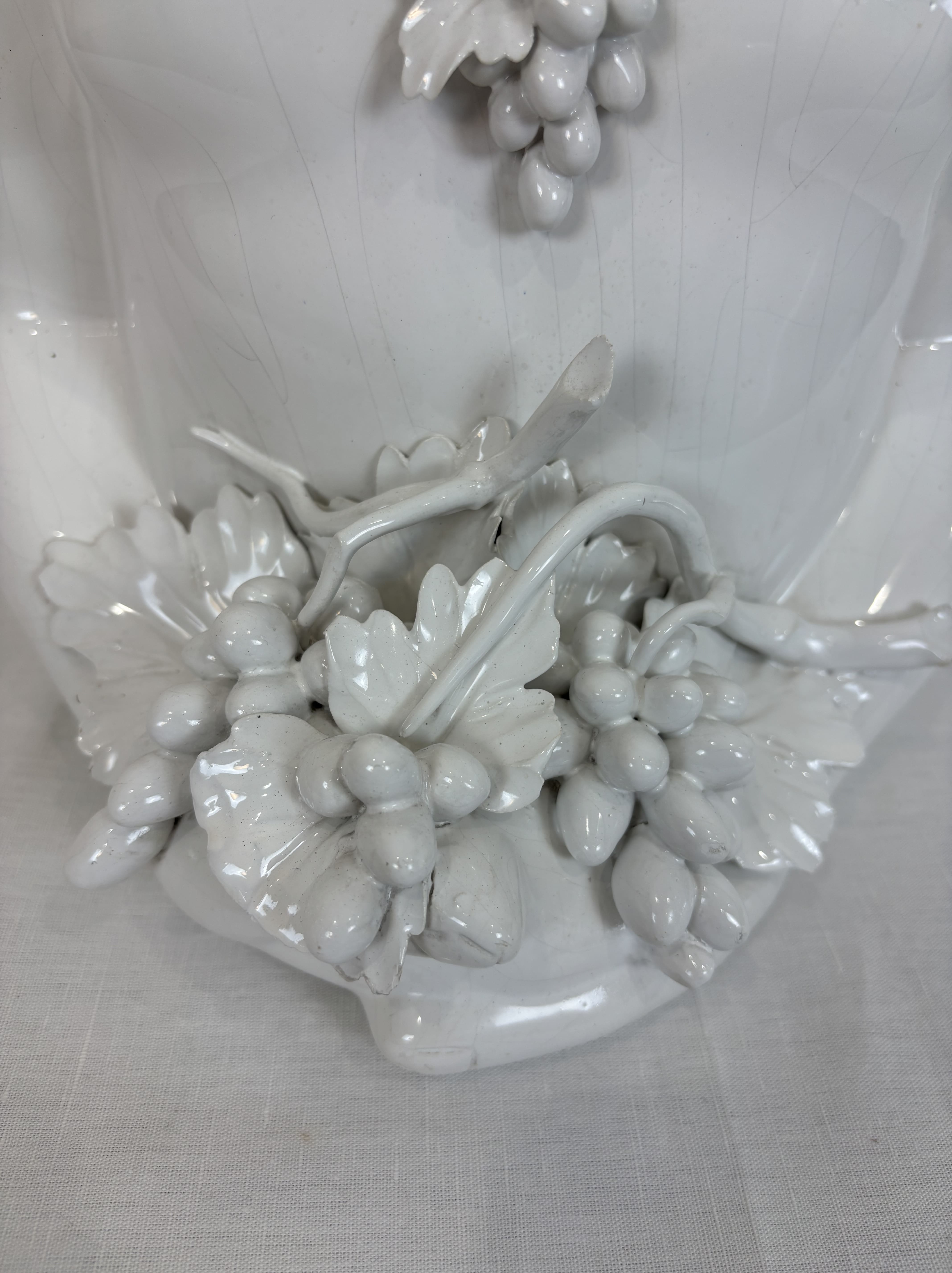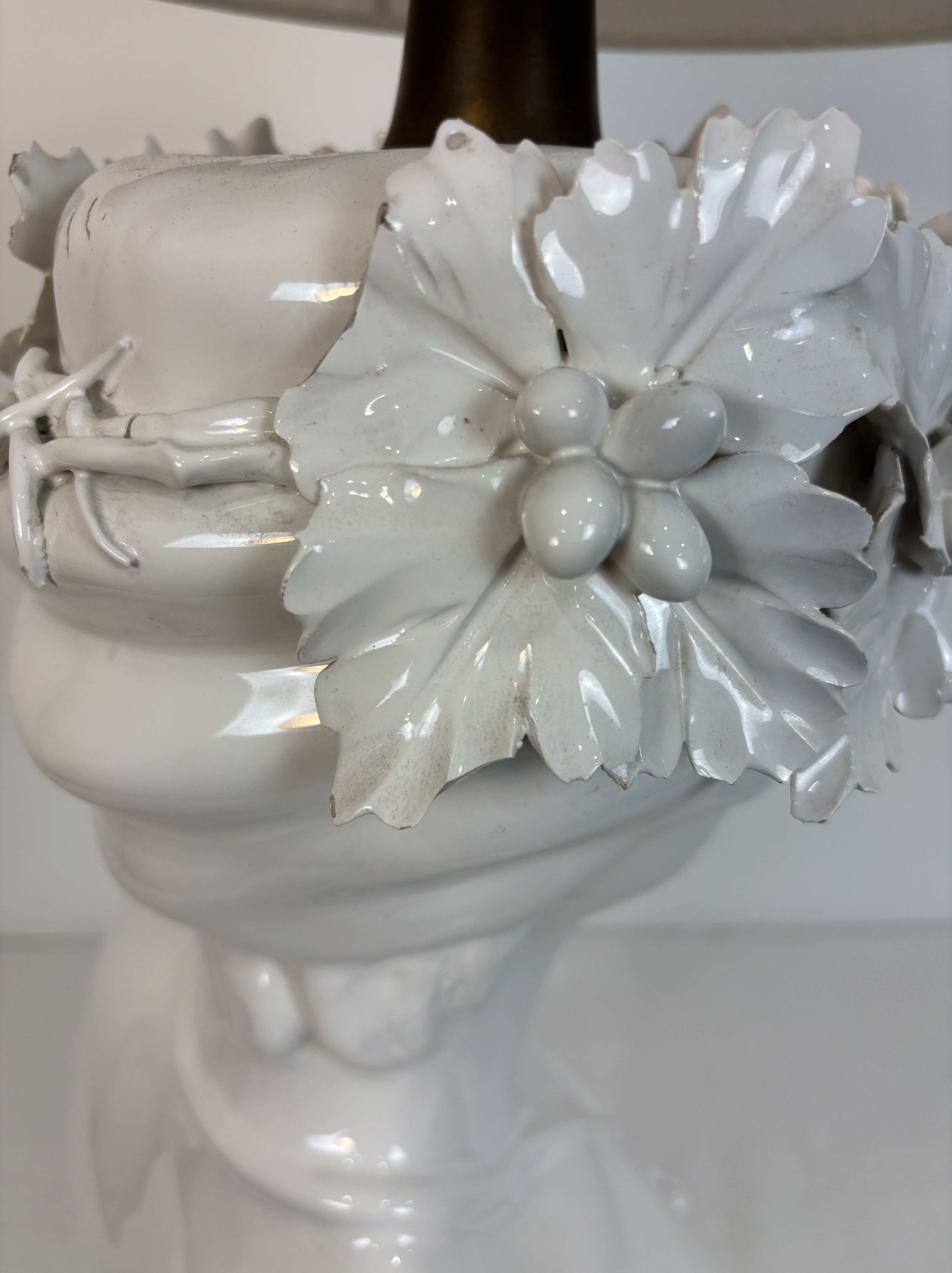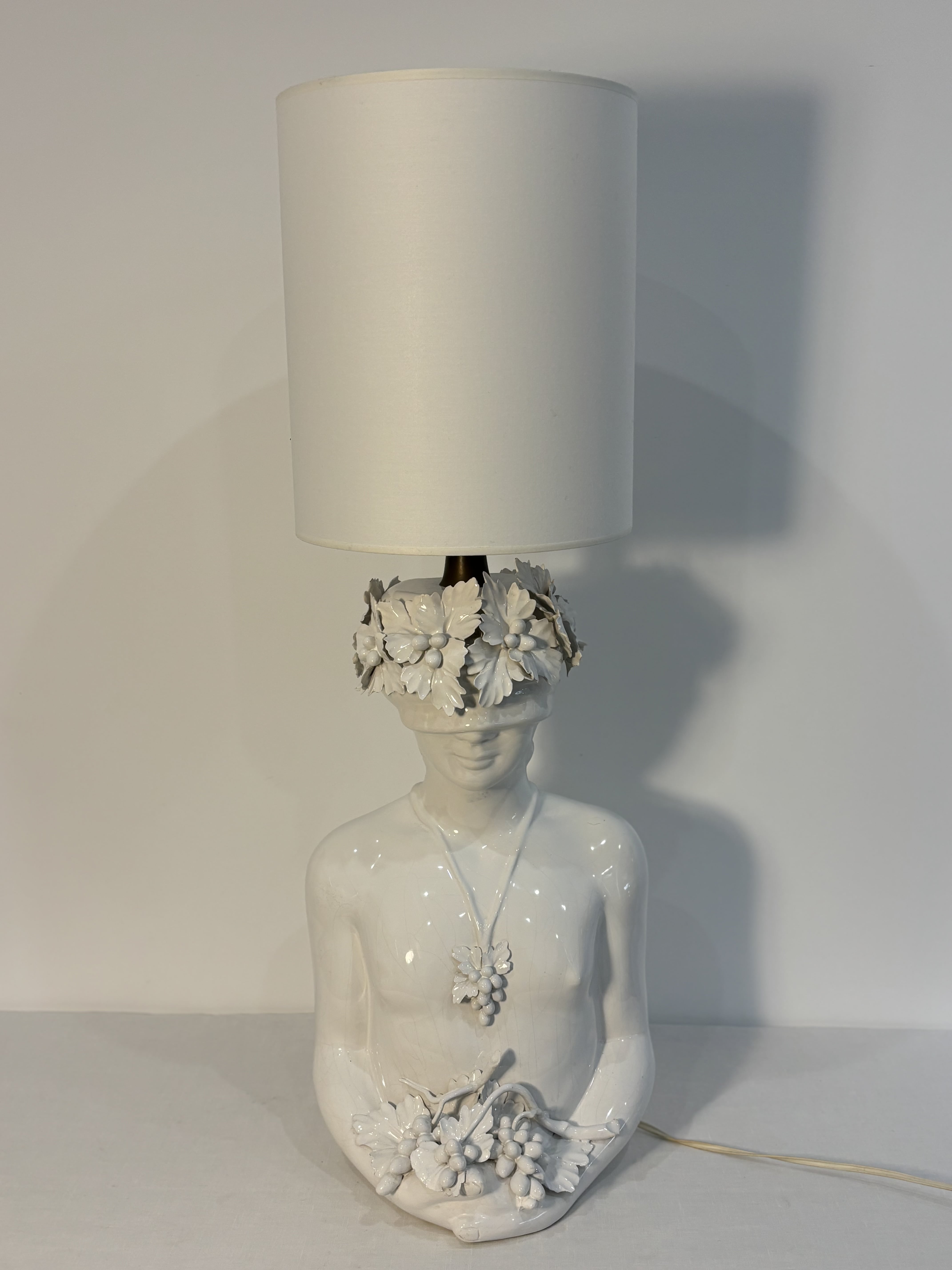 Rare et spectaculaire lampe italienne en céramique émaillée blanche attribuée aux ateliers Capodimonte, représentant un buste masculin allégorique orné d'un riche décor en haut-relief. Le personnage, les yeux bandés, est coiffé d'une vaste couronne de feuilles de vigne et grappes de raisin finement modelées, typiques des productions Capodimonte de la seconde moitié du XXe siècle: feuillages minutieusement appliqués, grappes en relief aux formes pleines, modelé expressif du visage, esthétique théâtrale d'inspiration mythologique. Le buste présente également un motif de pampres dans les mains. Abat-jour cylindrique. Italie, circa 1960-1970