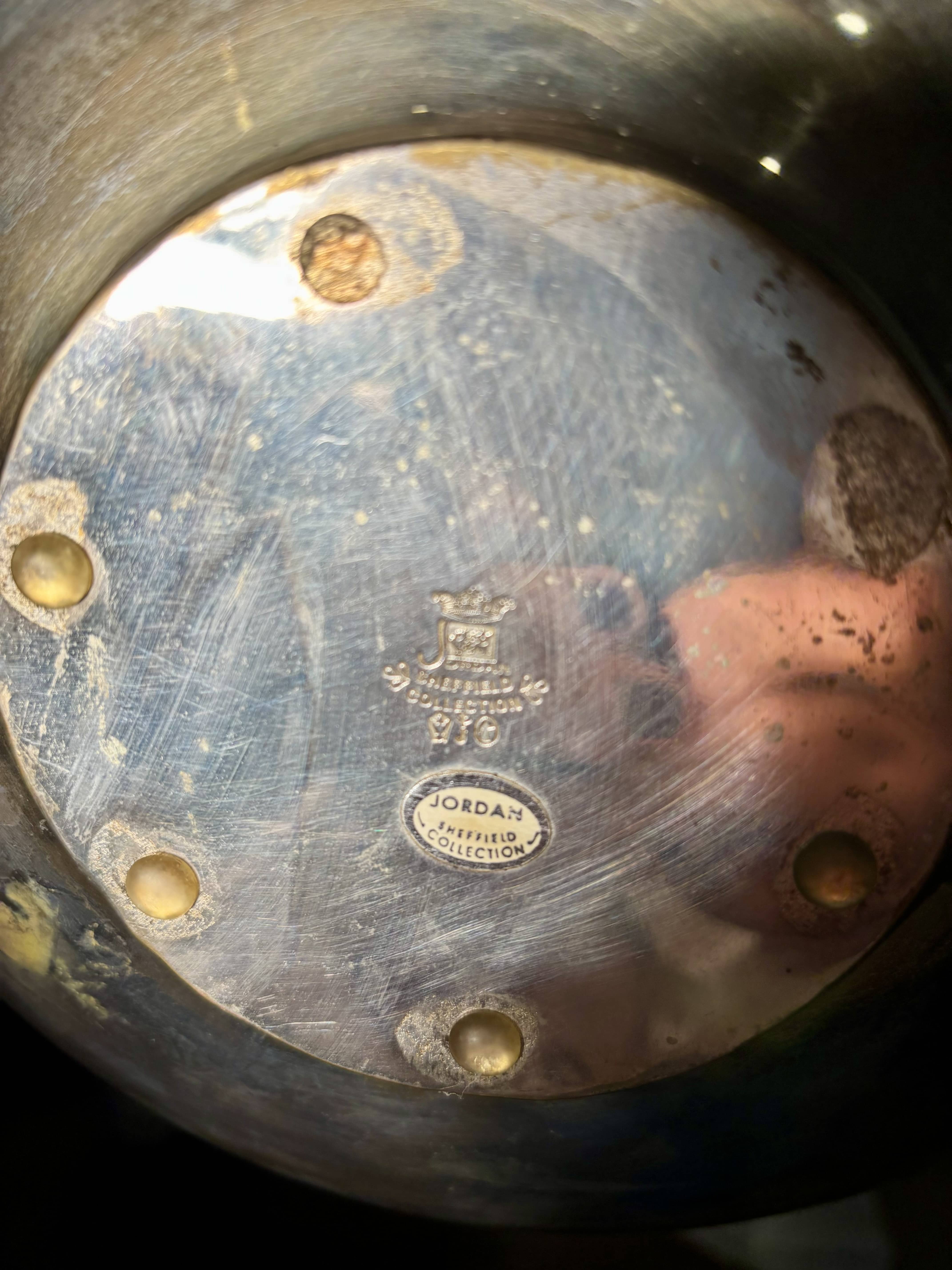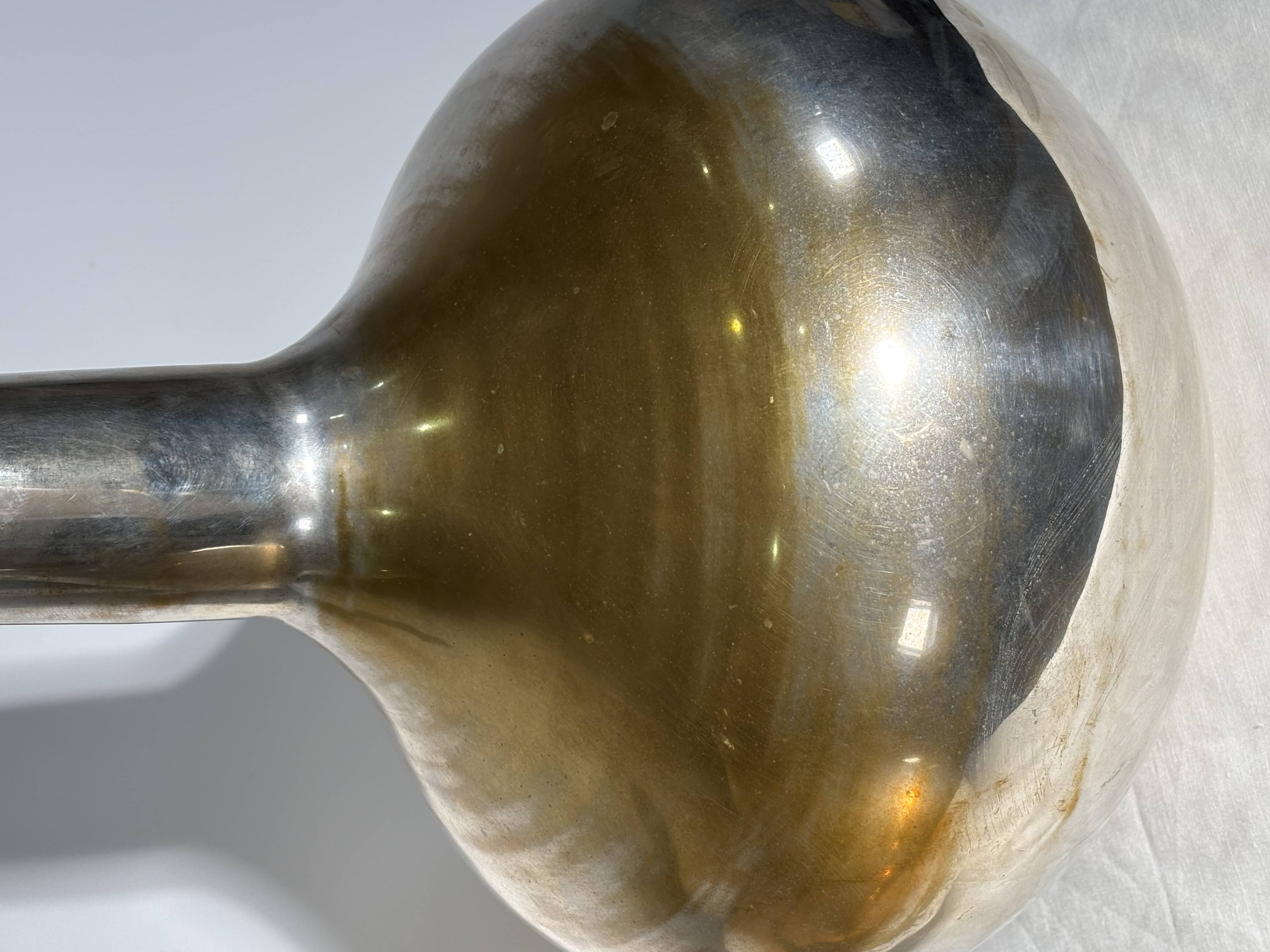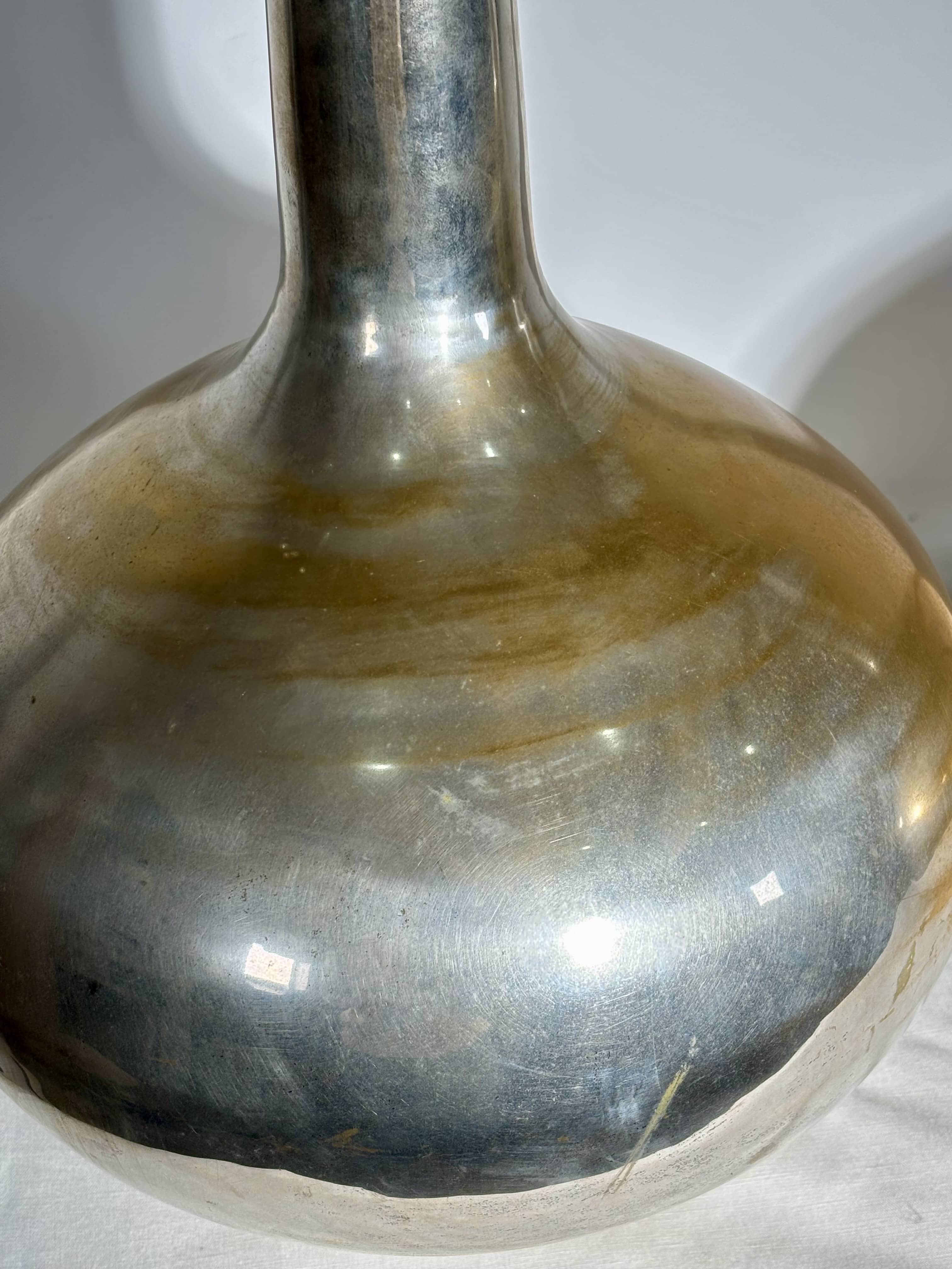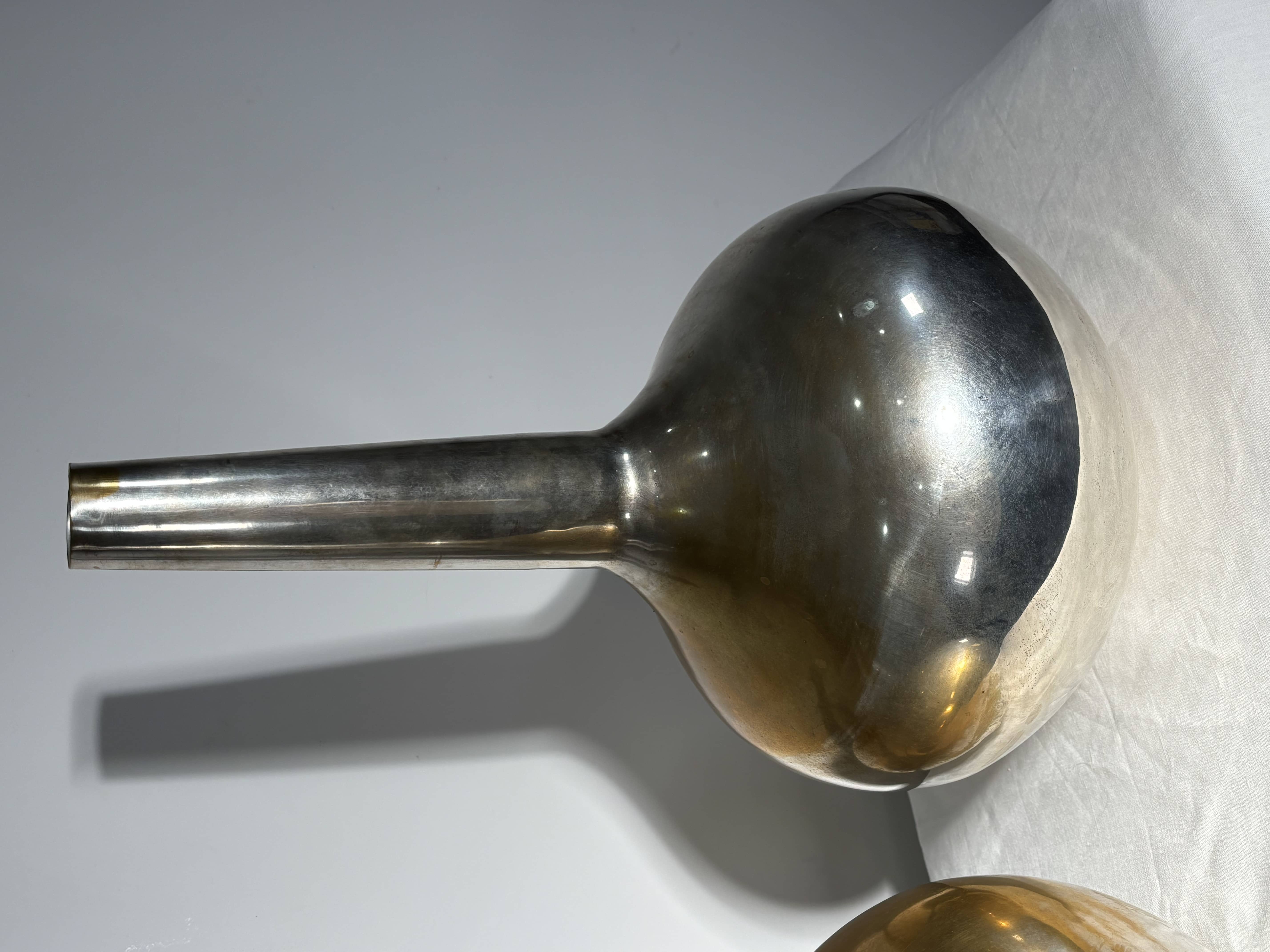 Spectaculaire paire de vases de forme "gourde" ou "bouteille" Mid-Century, en métal argenté, aux lignes épurées et organiques. Ces pièces se distinguent par leurs dimensions généreuses, notamment le plus grand modèle atteignant 58 cm de hauteur, ce qui en fait des objets de décoration de premier plan. Sous la base, chaque vase porte l'estampille de la prestigieuse maison italienne "Jordan Sheffield Collection" - maison Jordan-Silverado, basée près de Rome. Le nom Jordan fait référence à la famille de créateurs italiens Antonio Jordan. La mention Sheffield n'indique pas une origine britanique, mais garantit une technique d'argenture de haute qualité, héritée du savoir-faire traditionnel. Ces pièces sont le reflet du design italien des années 70-80, alliant l'élégance classique de l'argenterie à des formes minimalistes très modernes. Très bel aspect visuel. Traces d'usage, patine d'usage. Italie, XXe siècle