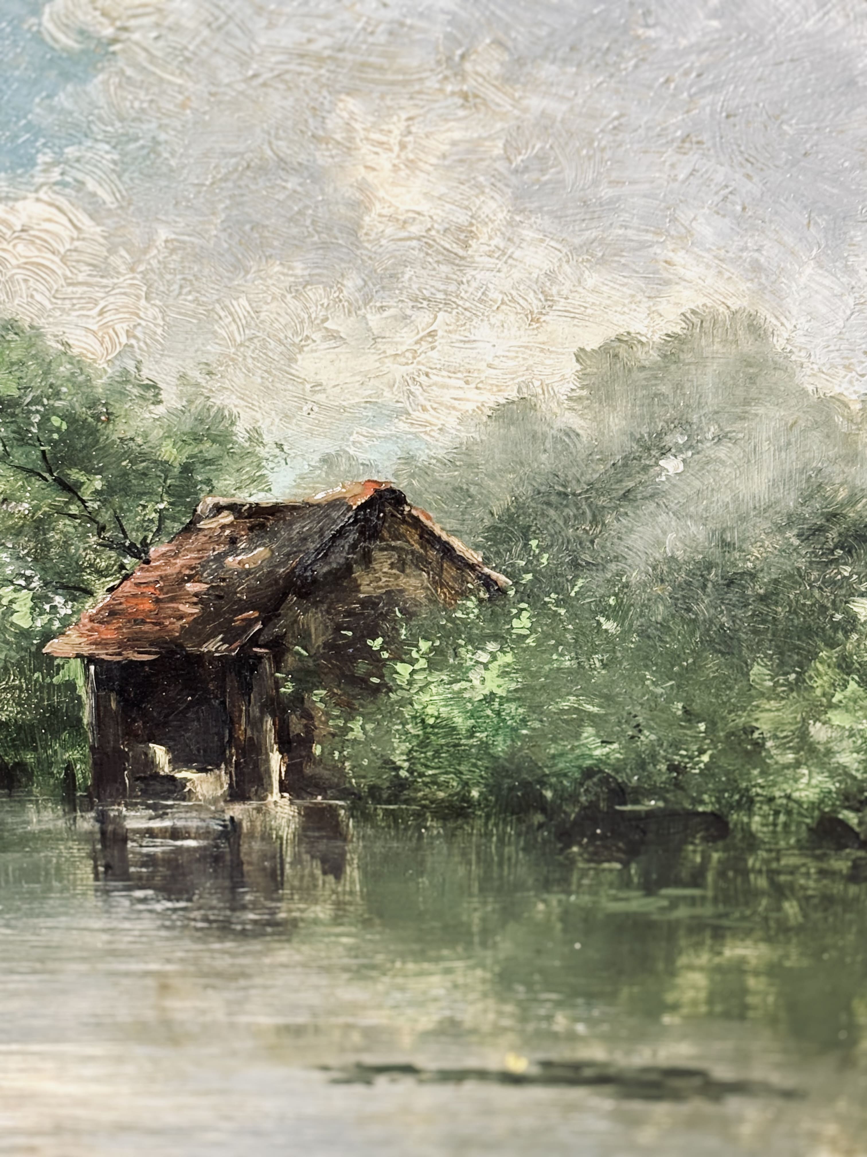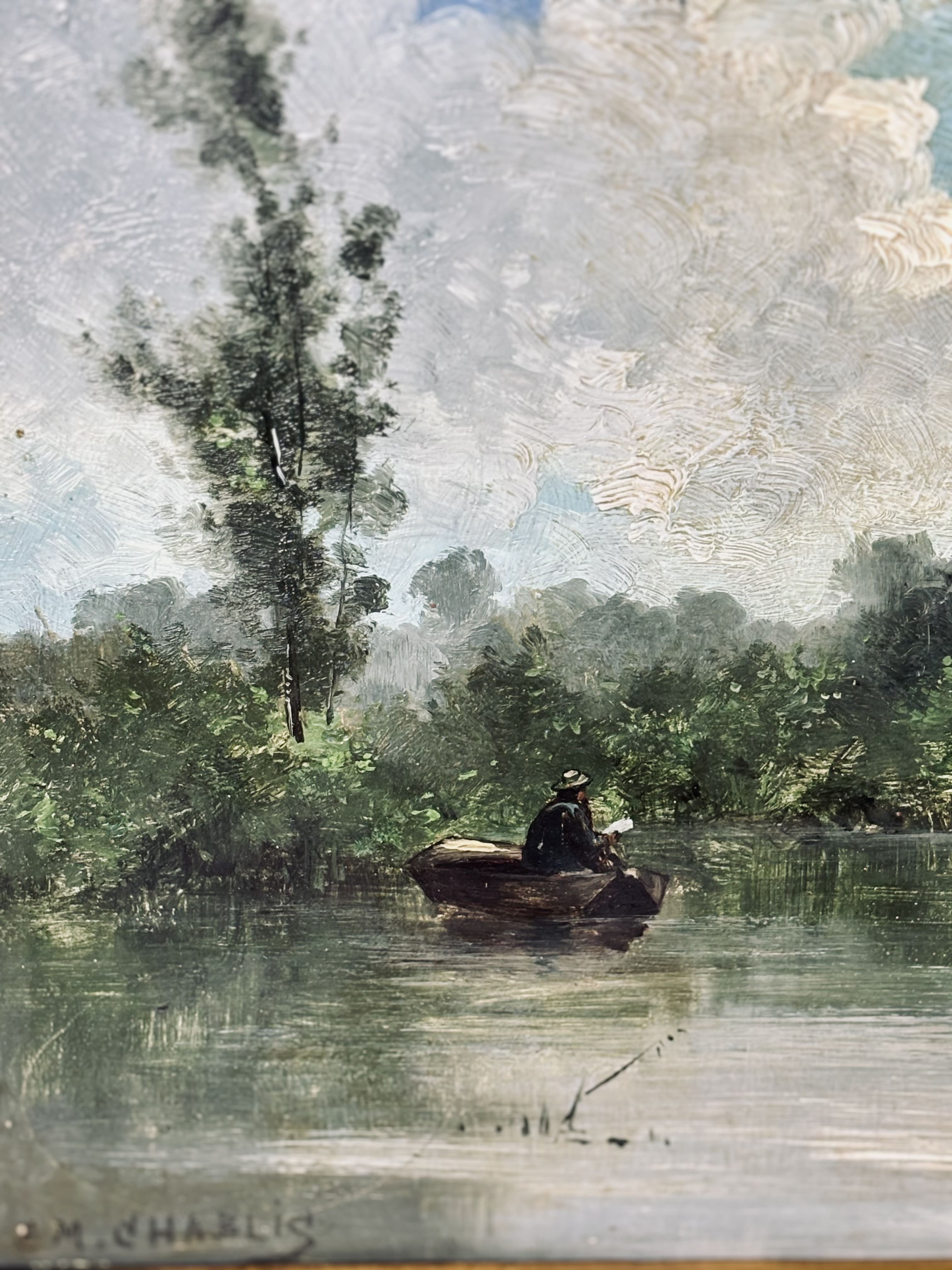 Très belle huile sur panneau de Jules-Ernest Martin Chablis représentant un paysage au bord d'un étang animé d'un personnage en barque et d'un petit édifice sur la rive. La composition est équilibrée, d'une grande douceur, avec un travail subtil sur les ciels et les reflets. La touche est précise, nerveuse et caractéristique de la peinture naturaliste française du XIXe siècle. Le verso porte un tampon ovale de marchand de couleurs parisien, confirmant un support d'époque. Cadre en bois doré ancien, décor de croisillons et de feuilles d'acanthe. Usure d'usage.