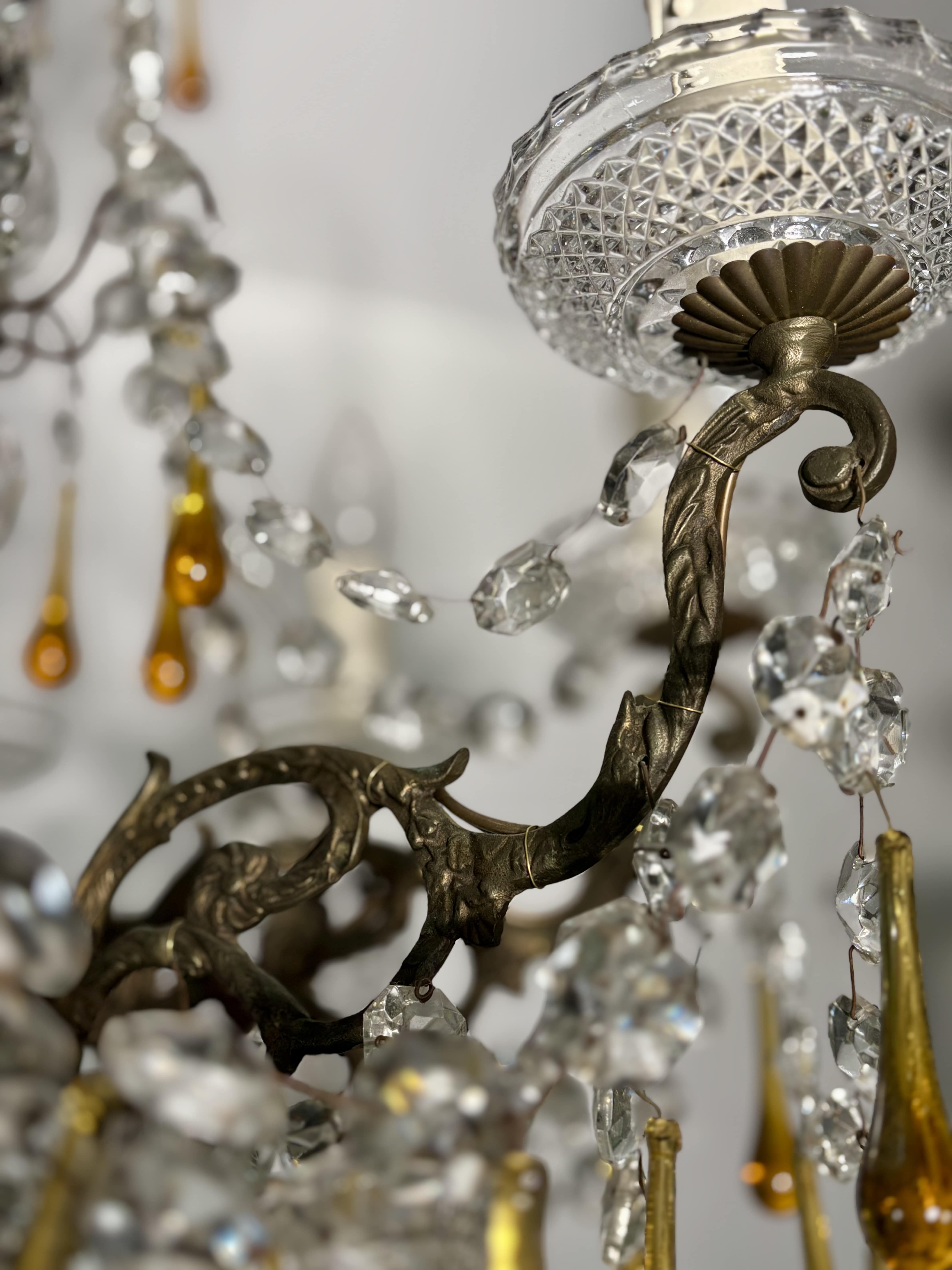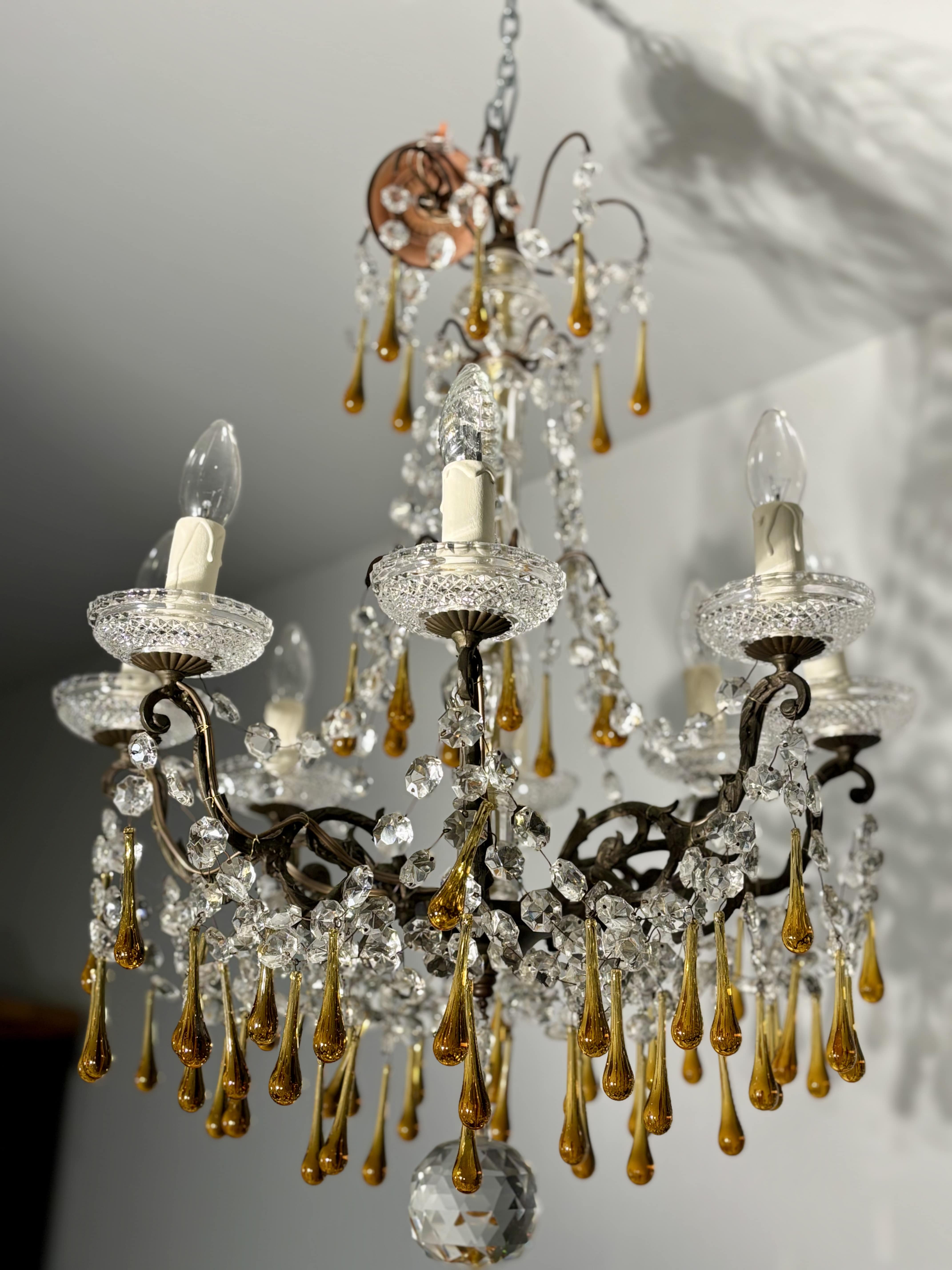 Lustre à pampilles à 8 feux, en bronze et cristal, gouttes en verre ambré, circa 1900