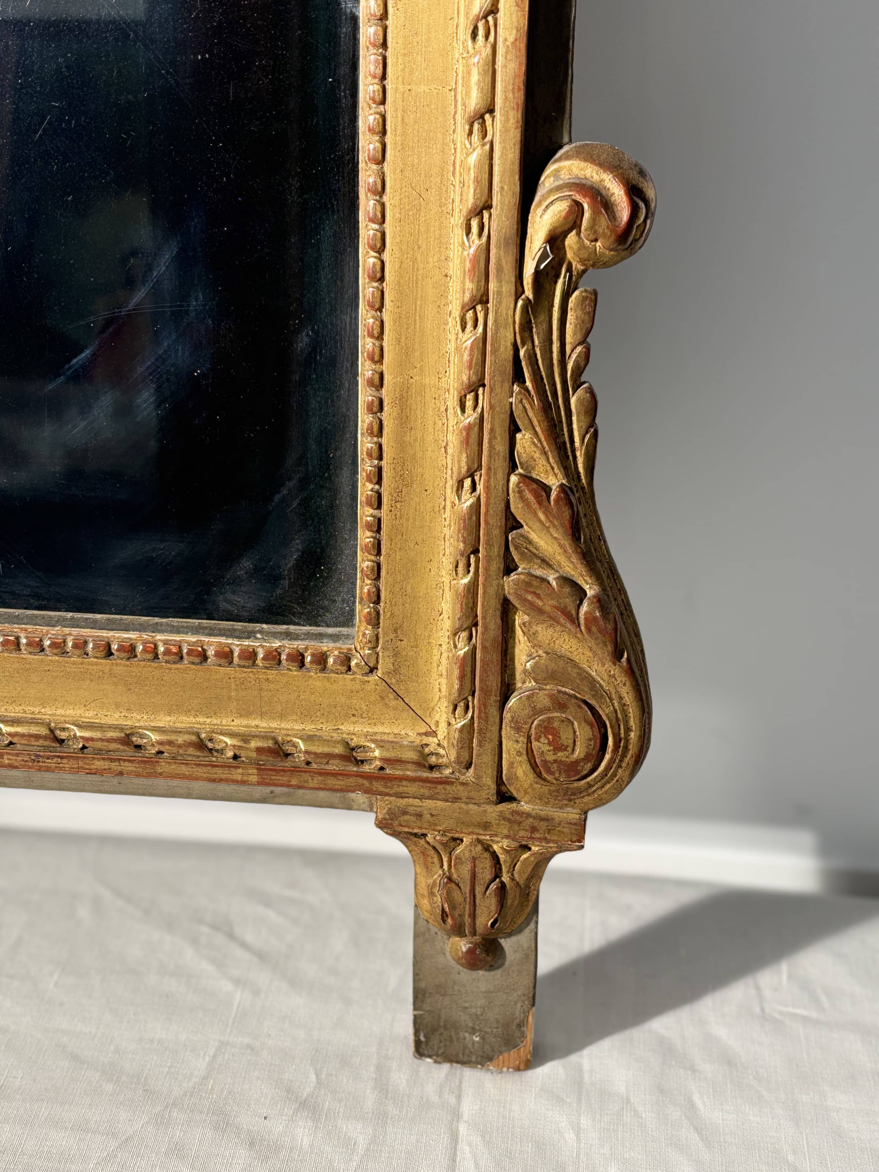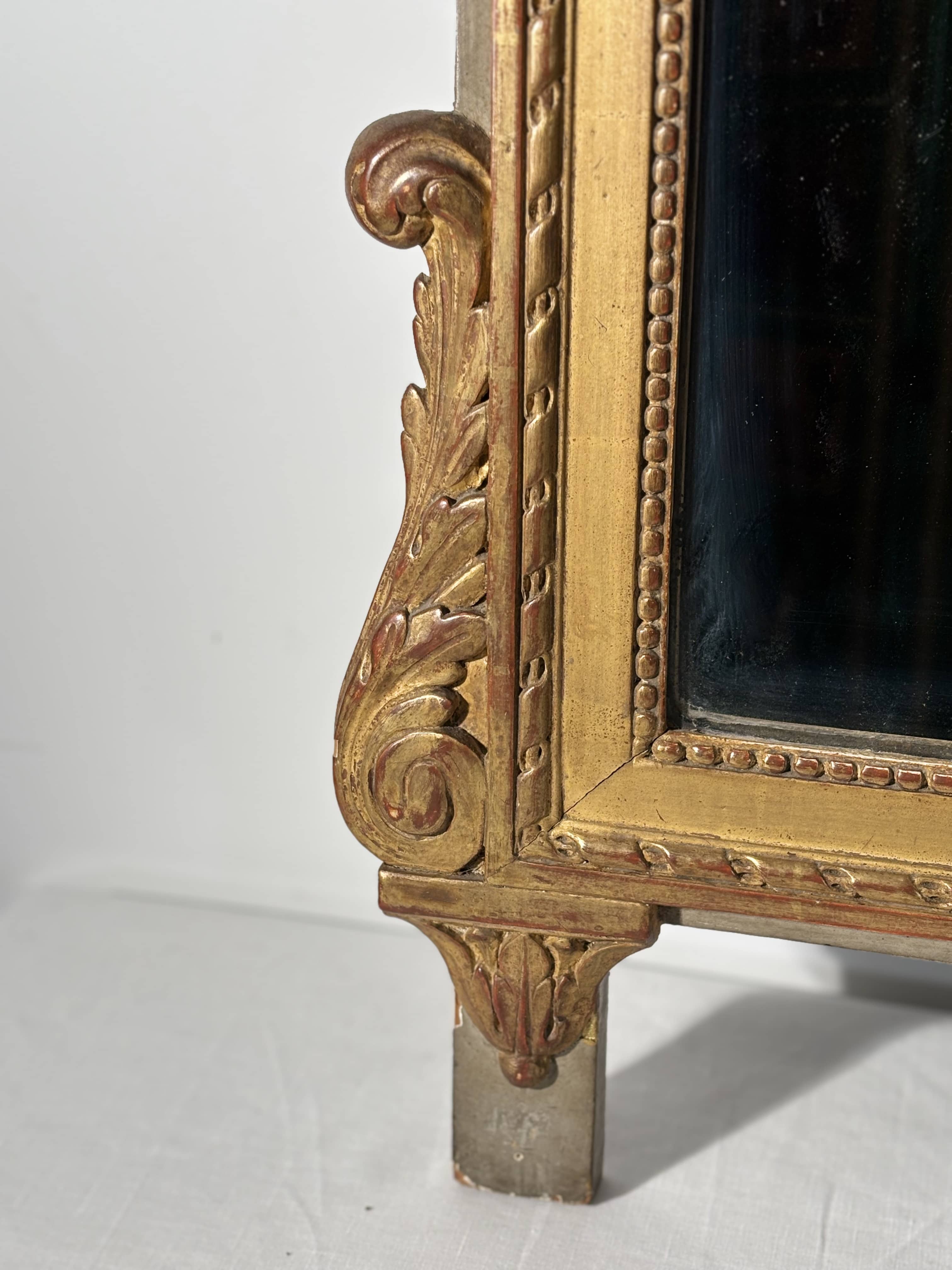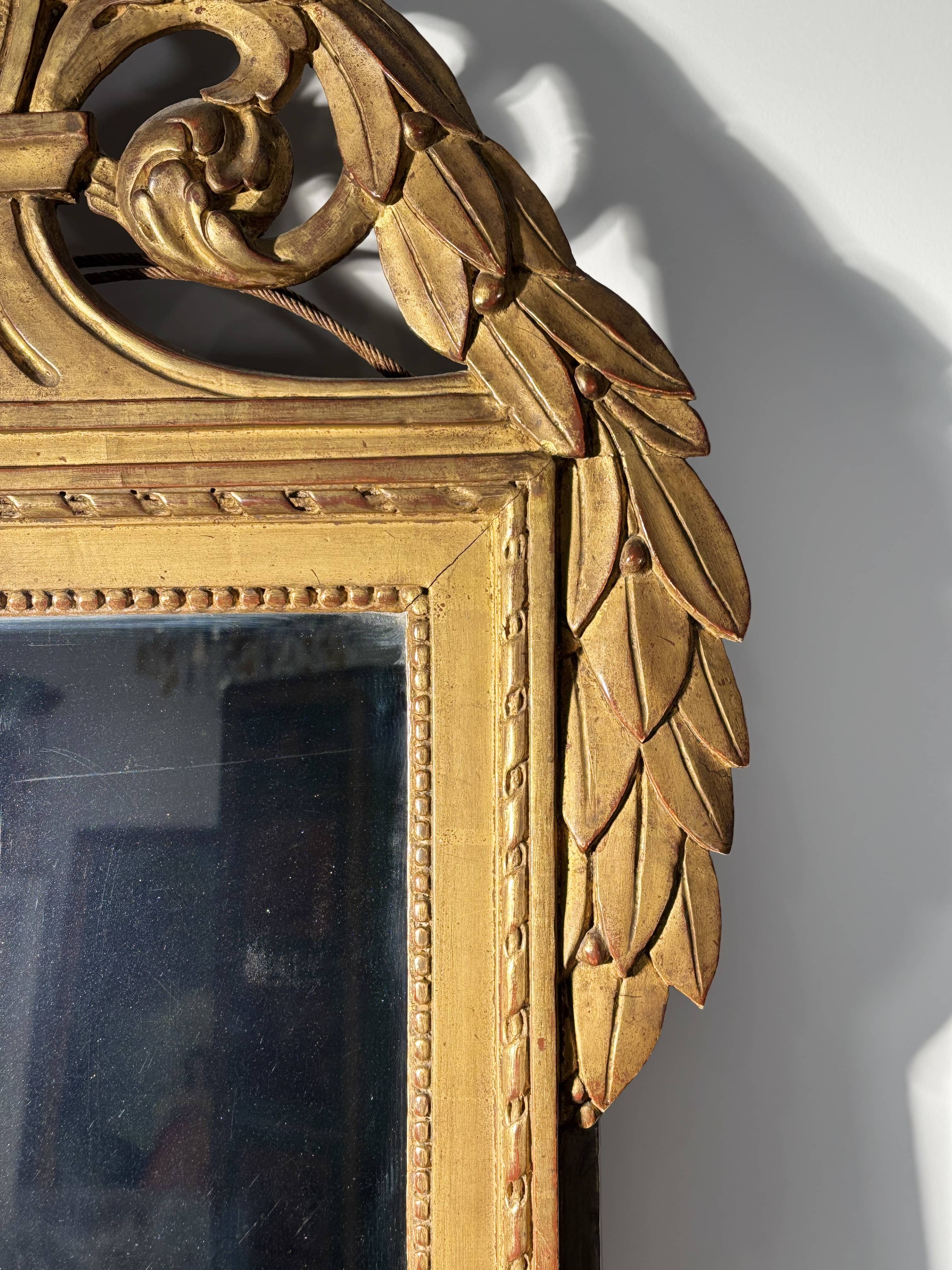 Miroir à fronton de style Louis XVI en bois sculpté doré, fin XVIIIe siècle