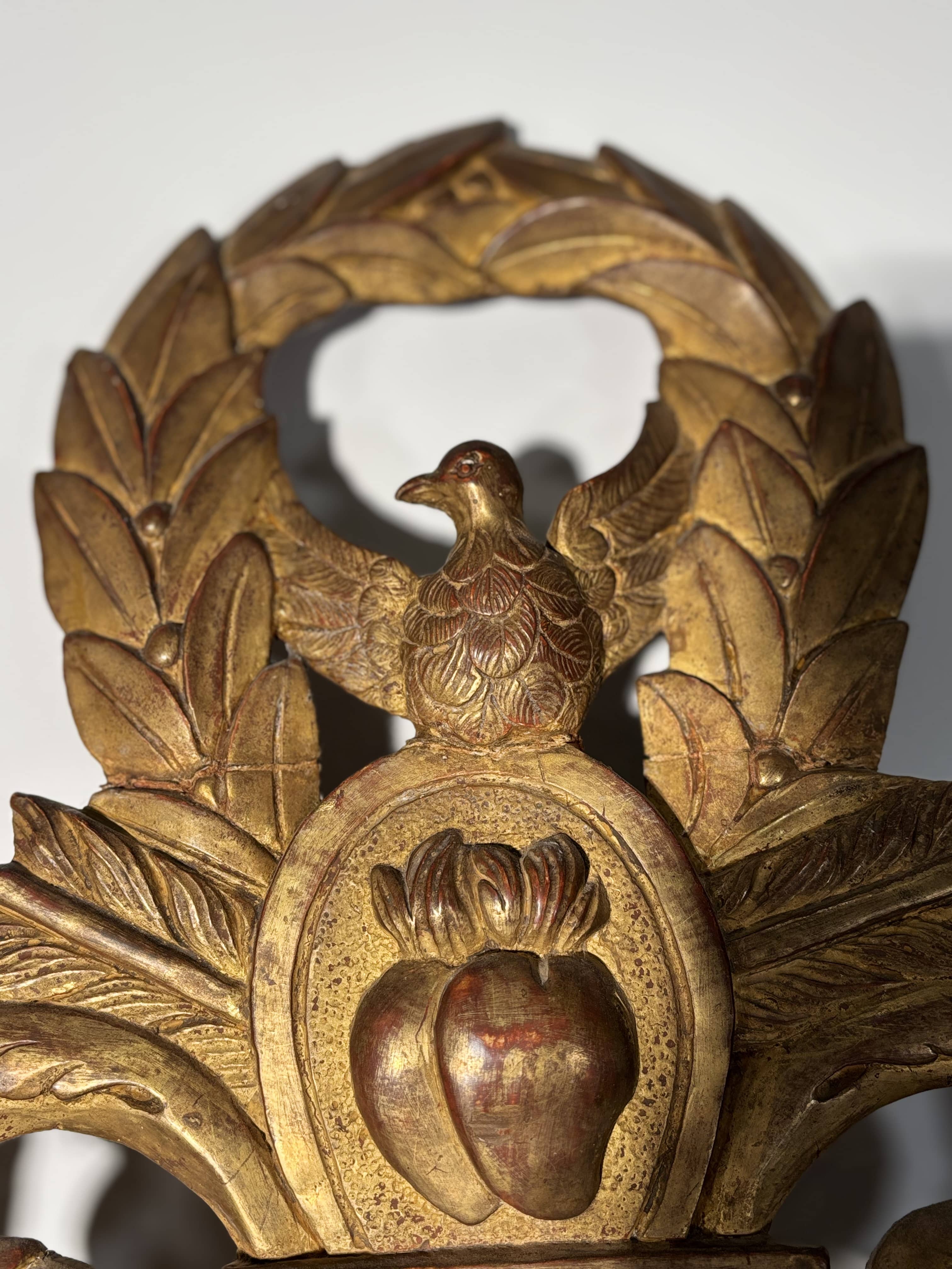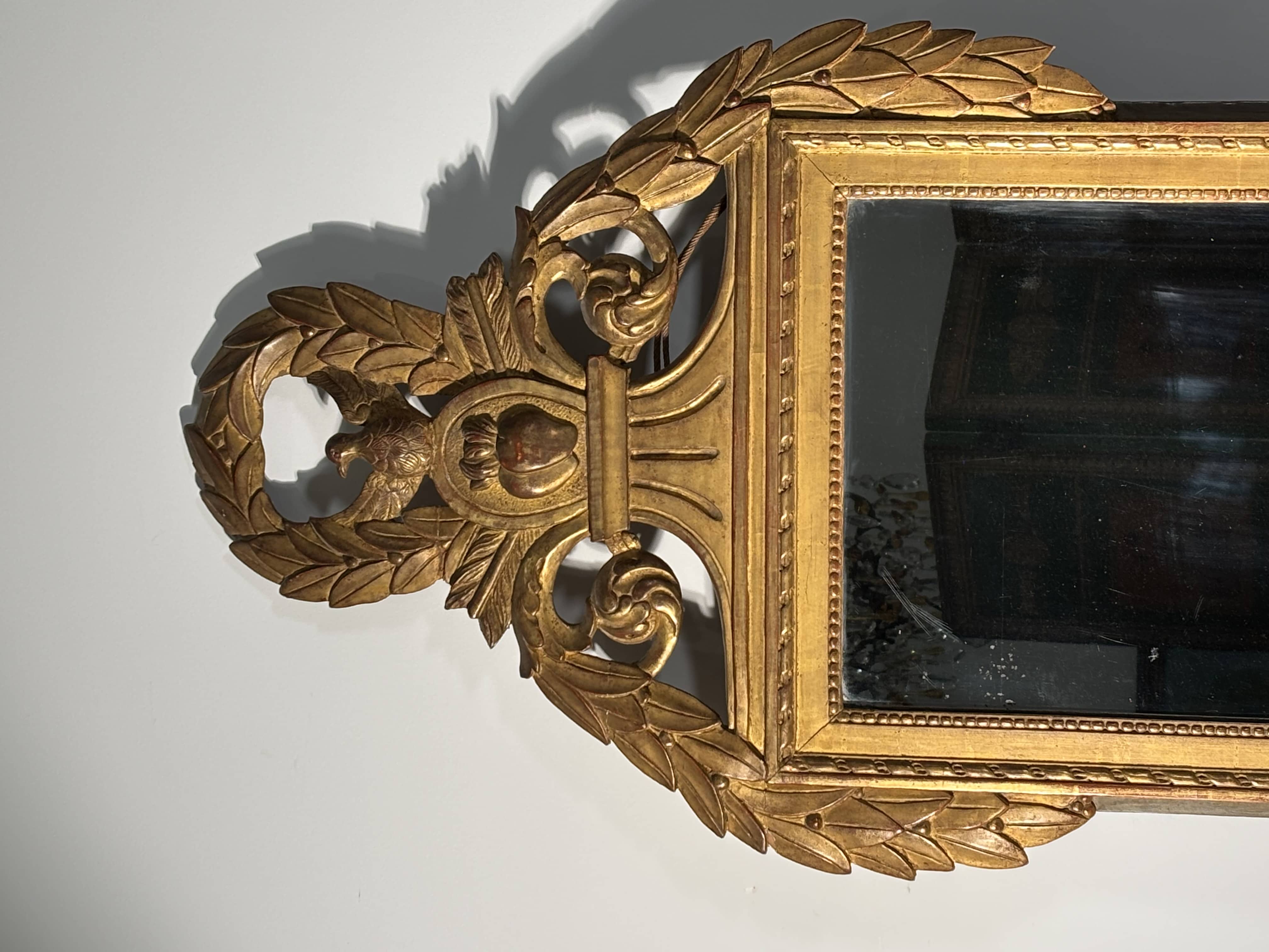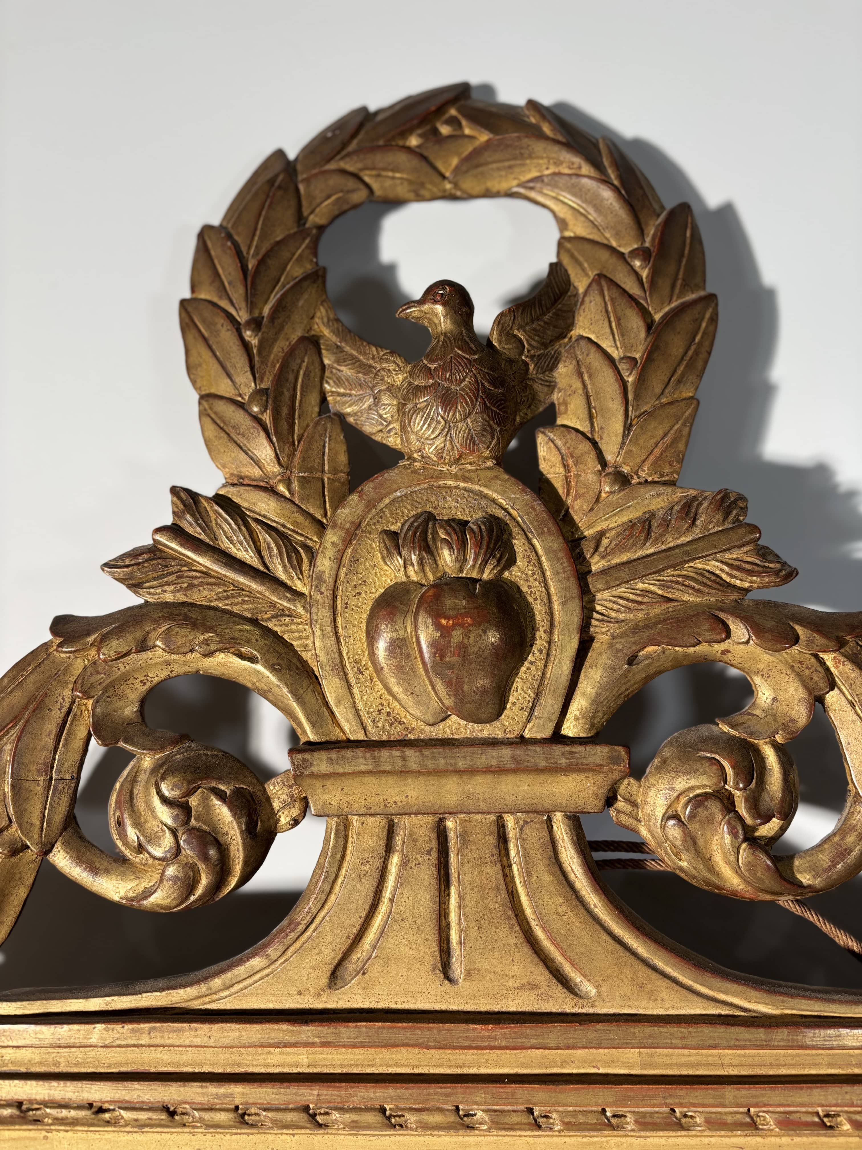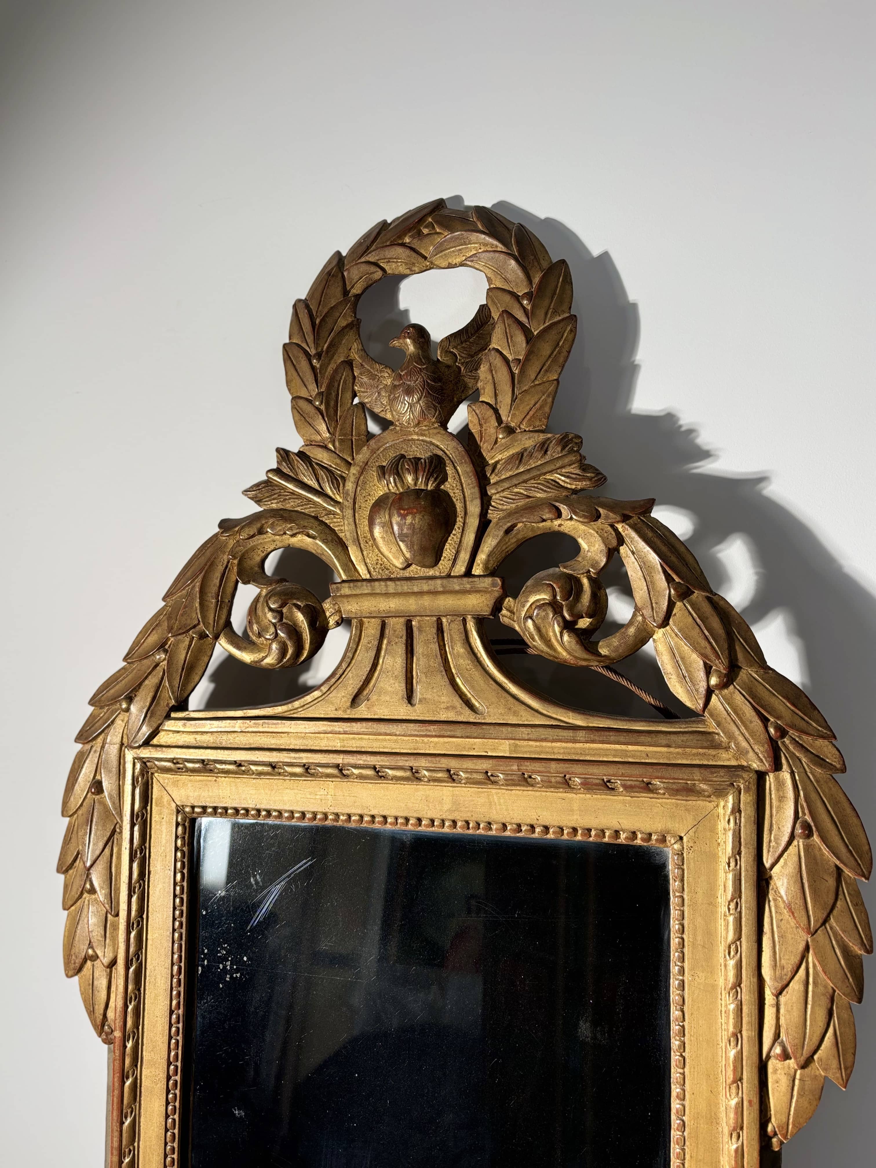 Important miroir de forme rectangulaire en bois sculpté et doré. Ce modèle se distingue par un fronton spectaculaire et richement travaillé. Au sommet, une colombe aux ailes déployées, symbole de paix ou d'amour, est inscrite dans une couronne de lauriers. Elle surplombe un médaillon central orné de deux cœurs enflammés transpercés par des flèches, reposant sur une base à cannelures. Frise de rubans torsadés et frise de perles. Le cadre est flanqué de larges chutes de feuillages et de lauriers qui descendent le long des montants. La partie basse est agrémentée de deux consoles à volutes stylisées, permettant au miroir de reposer élégamment sur une cheminée ou une console.
