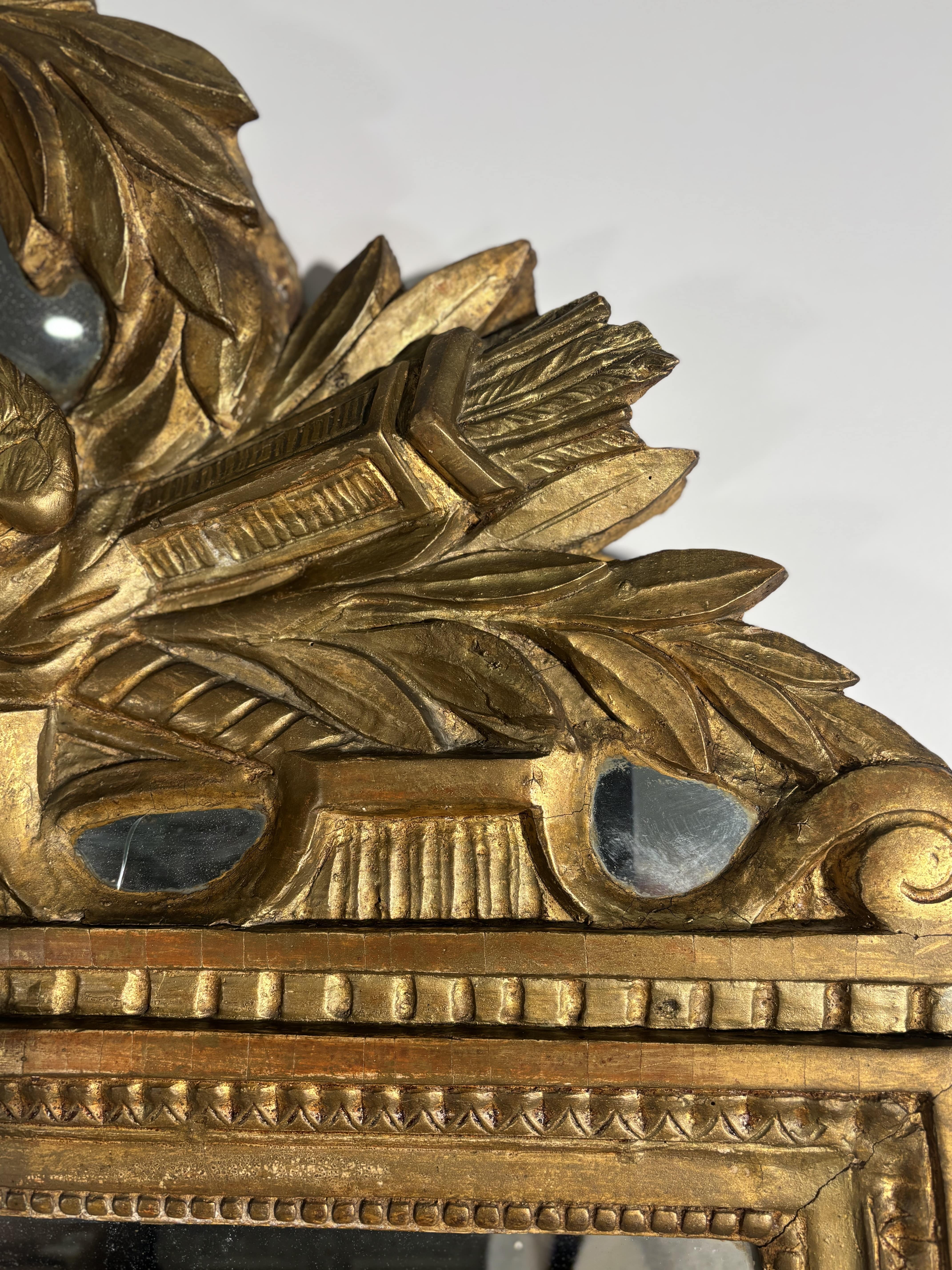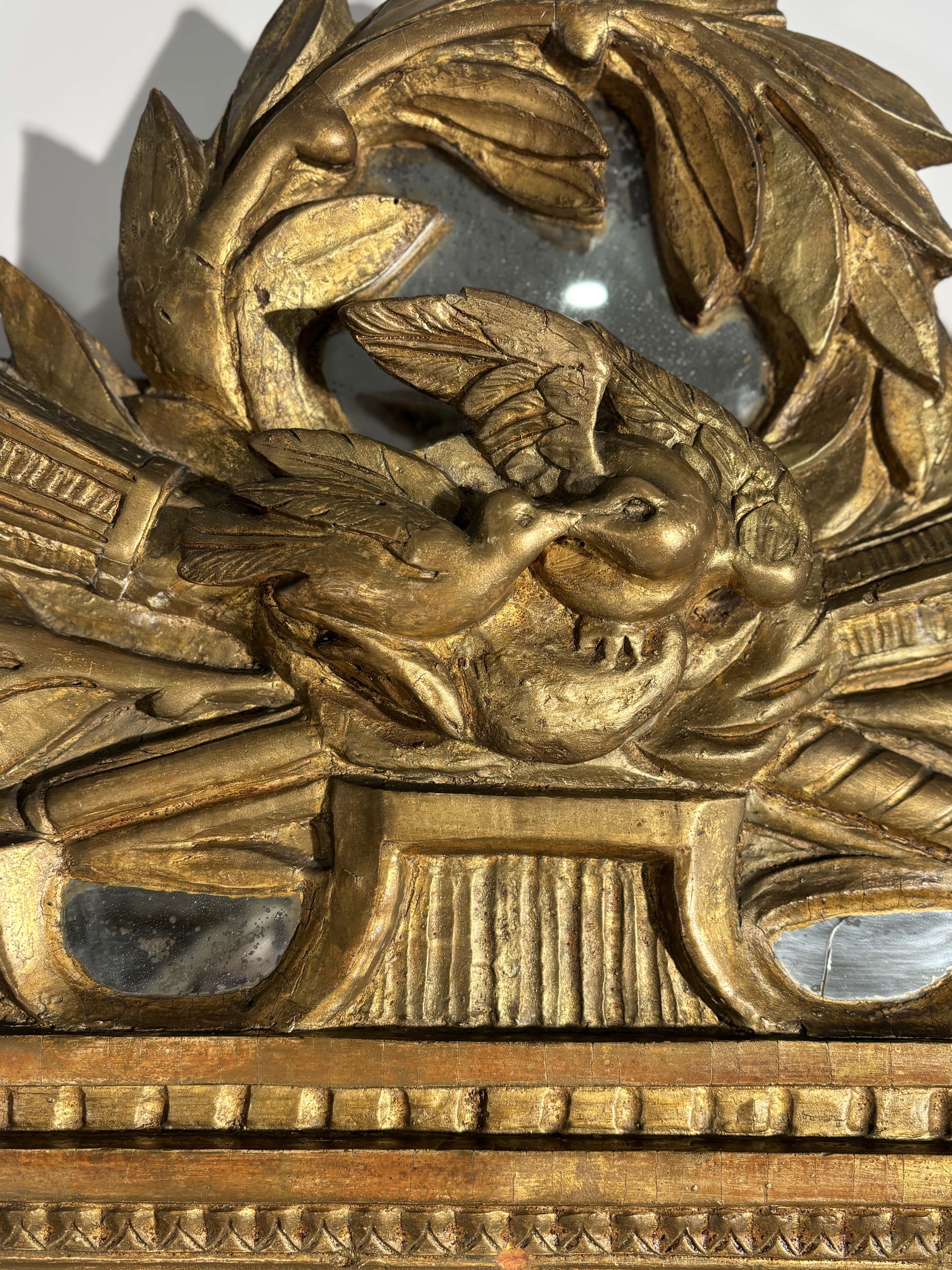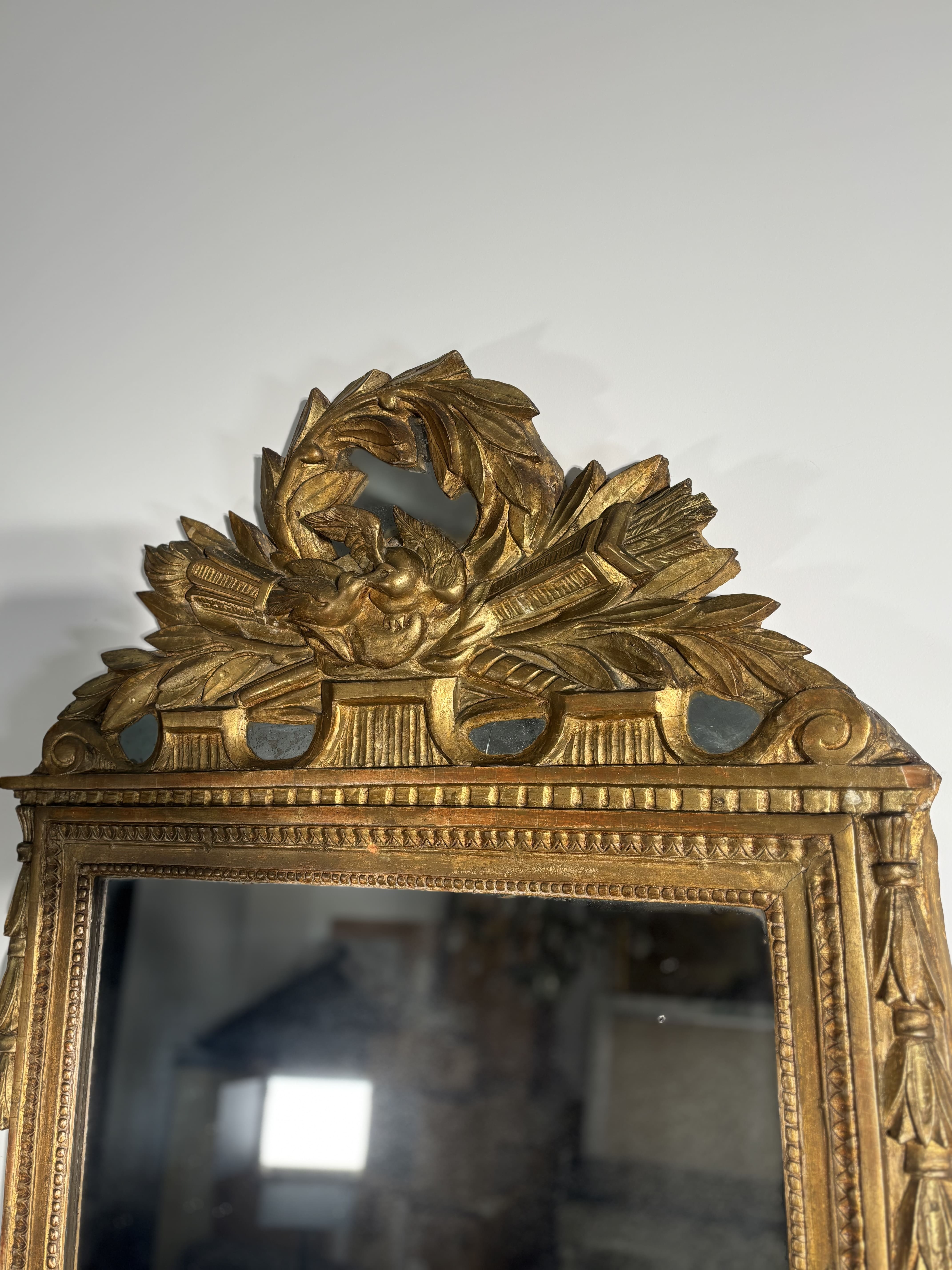 Très beau miroir en bois doré sculpté du début du XIXe siècle dans le style Louis XVI. Il présente un fronton orné de couronne de laurier symbole de succès, de colombes symbole de paix et d'un carquois garni de ses flèches symbole d'amour. Encadrement à frises de perles, chutes latérales à décor de feuilles d'acanthes. Glace d'origine.
