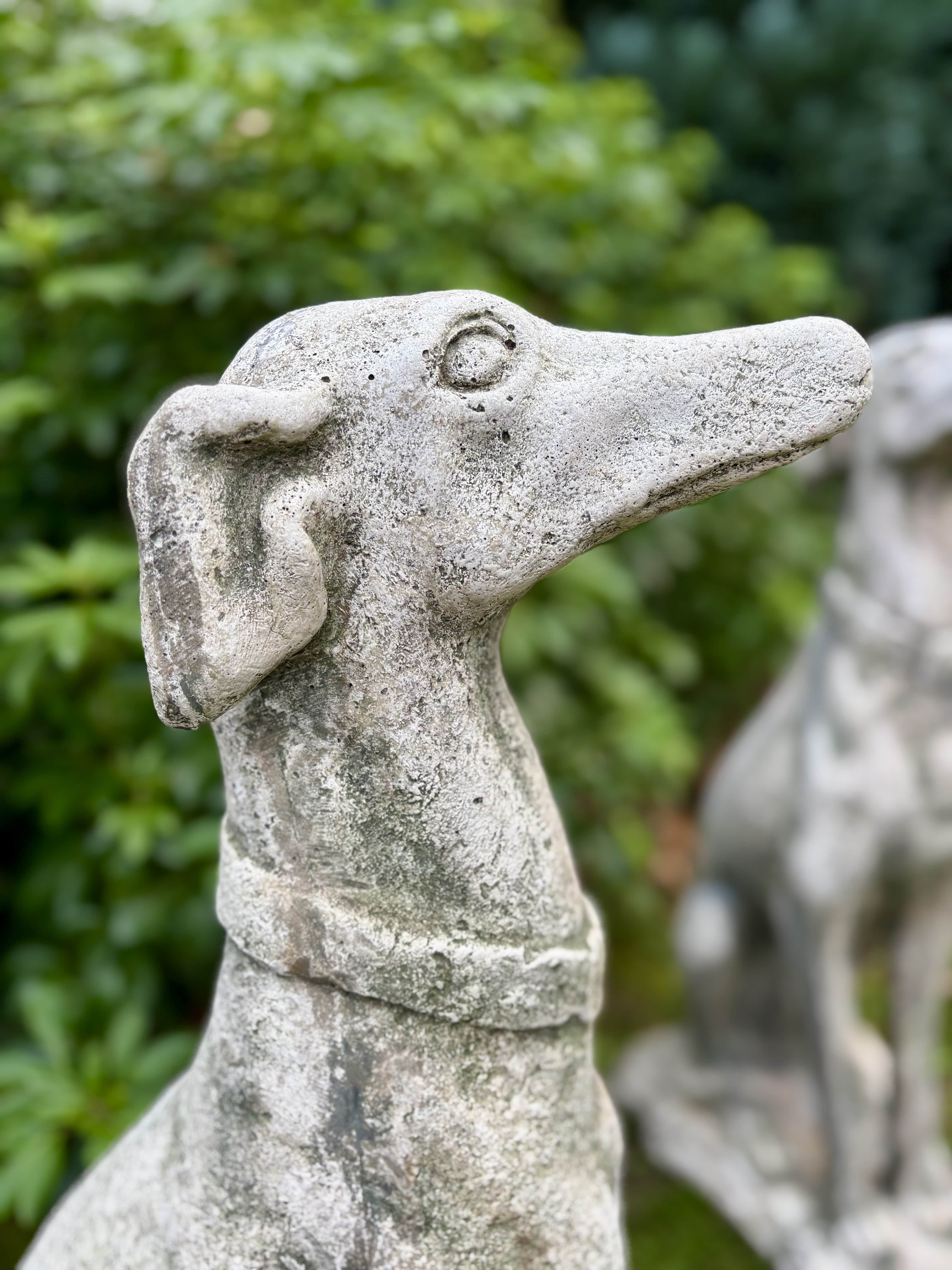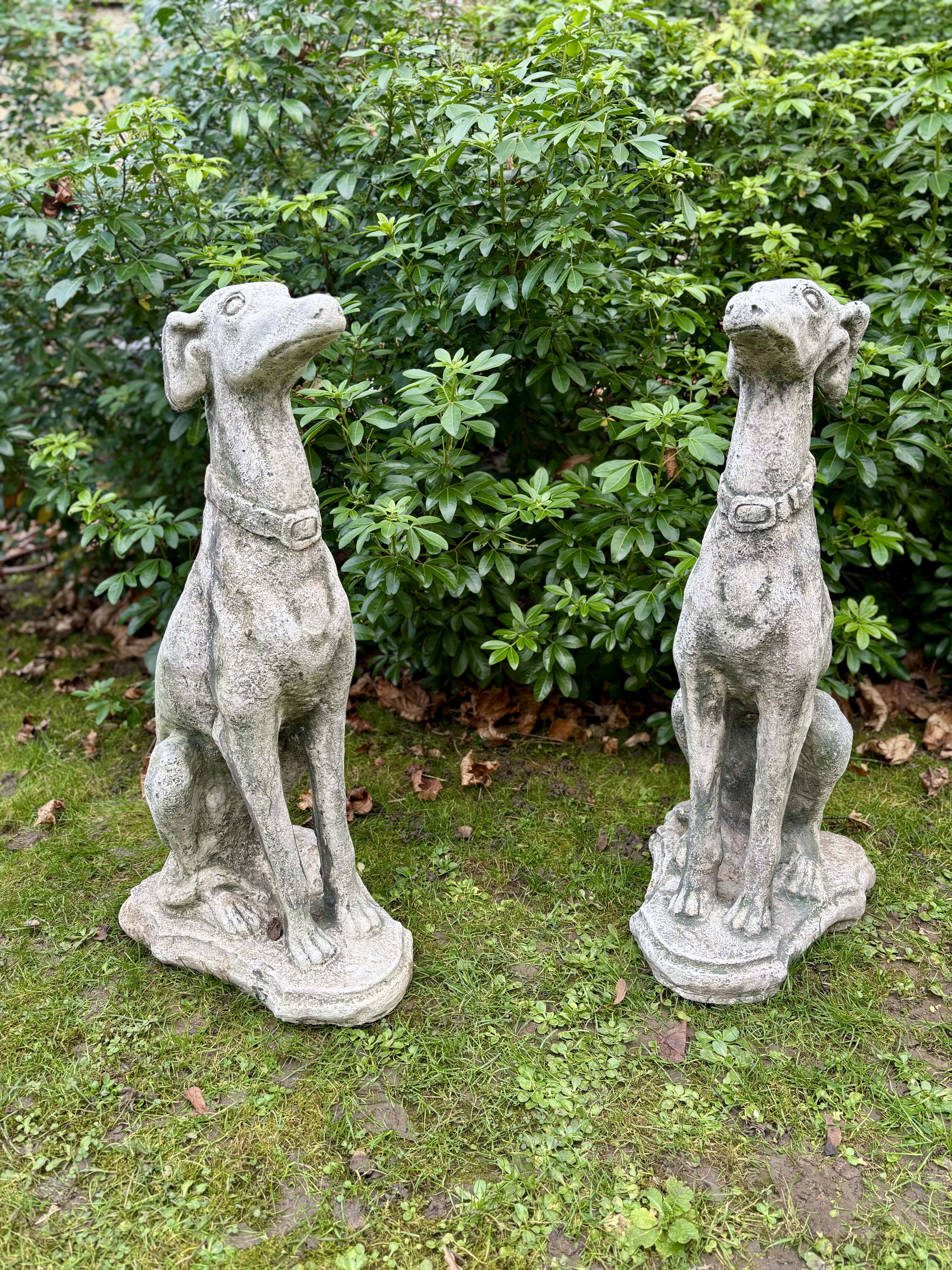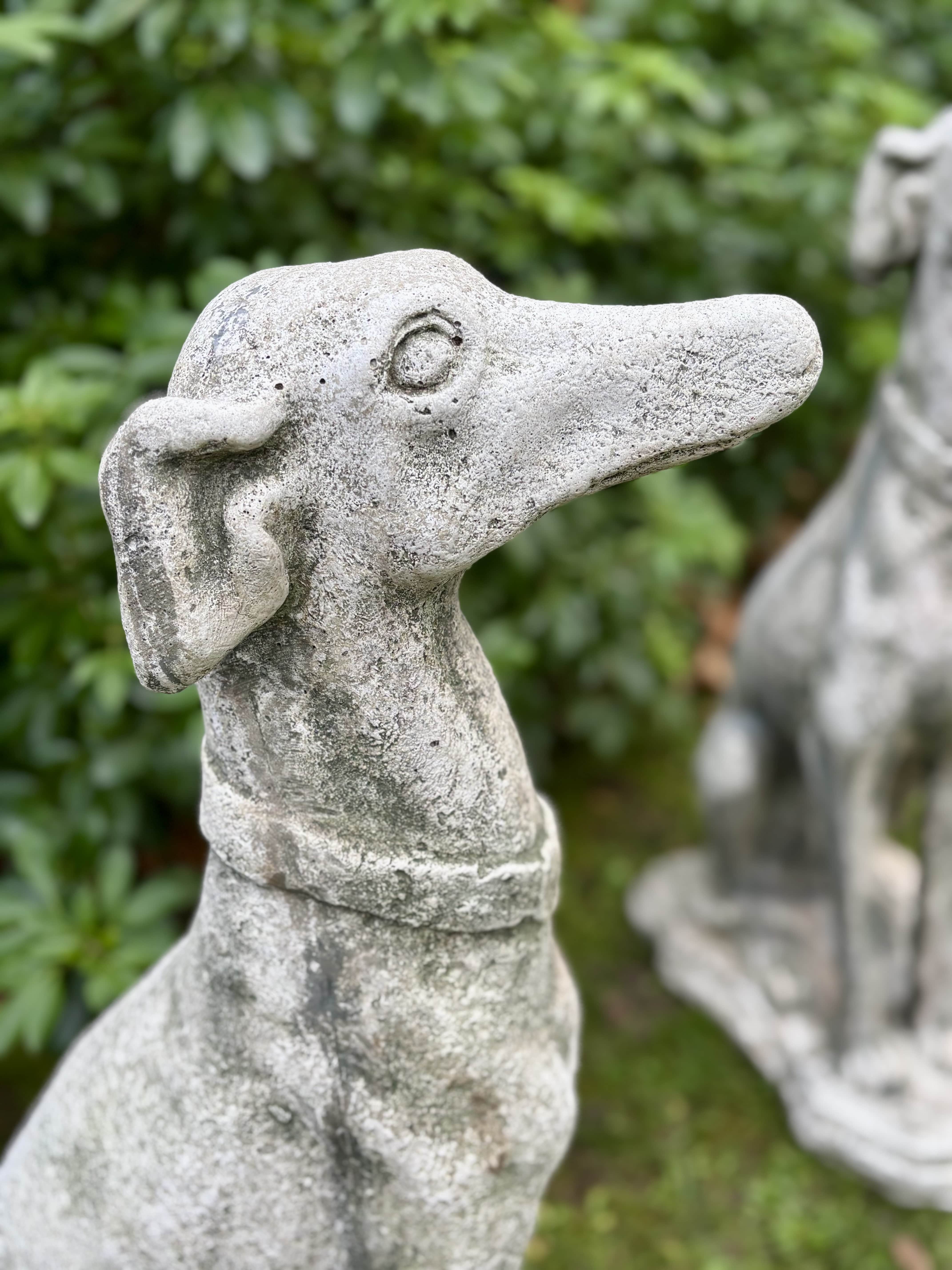 Elégante paire de lévriers assis, réalisée en pierre reconstituée, destinée à l'ornement d'un jardin, d'une terrasse ou à la mise en scène d'une entrée. Sujets identiques formant paire. Patine naturelle liée à une ancienne installation extérieure. Portugal, XXe siècle. Poids: 44 kg par sujet soit 88 kg pour la paire