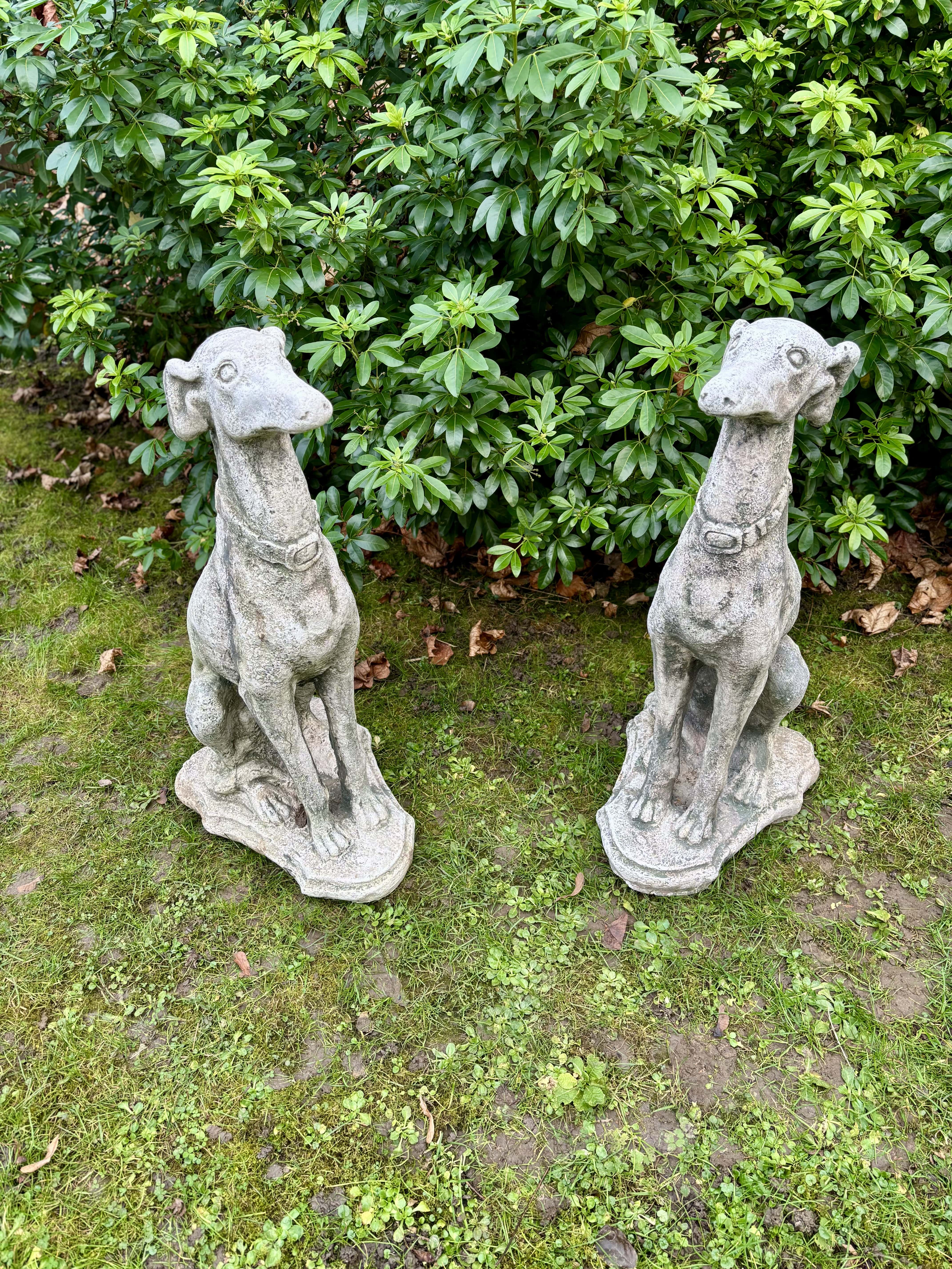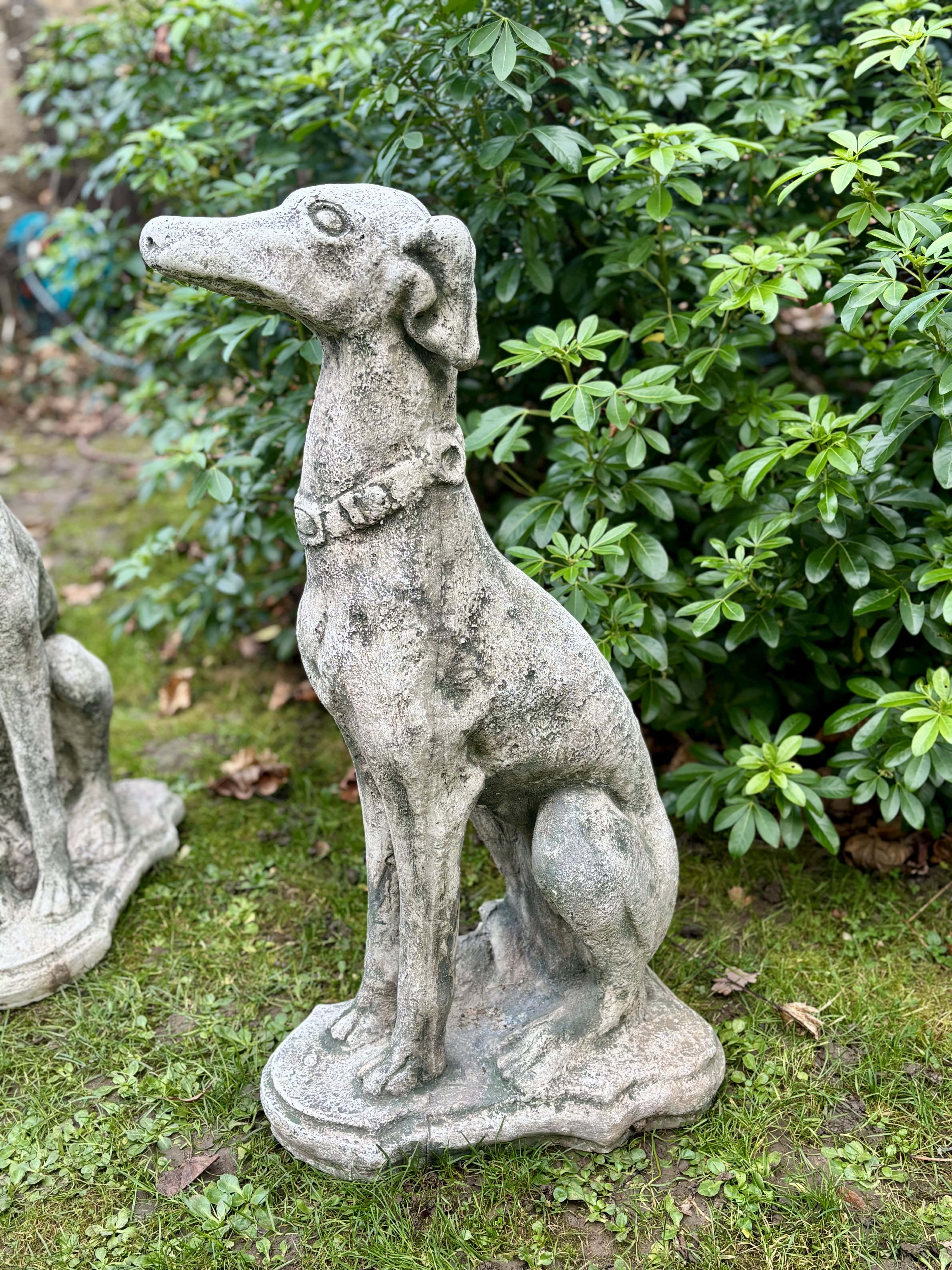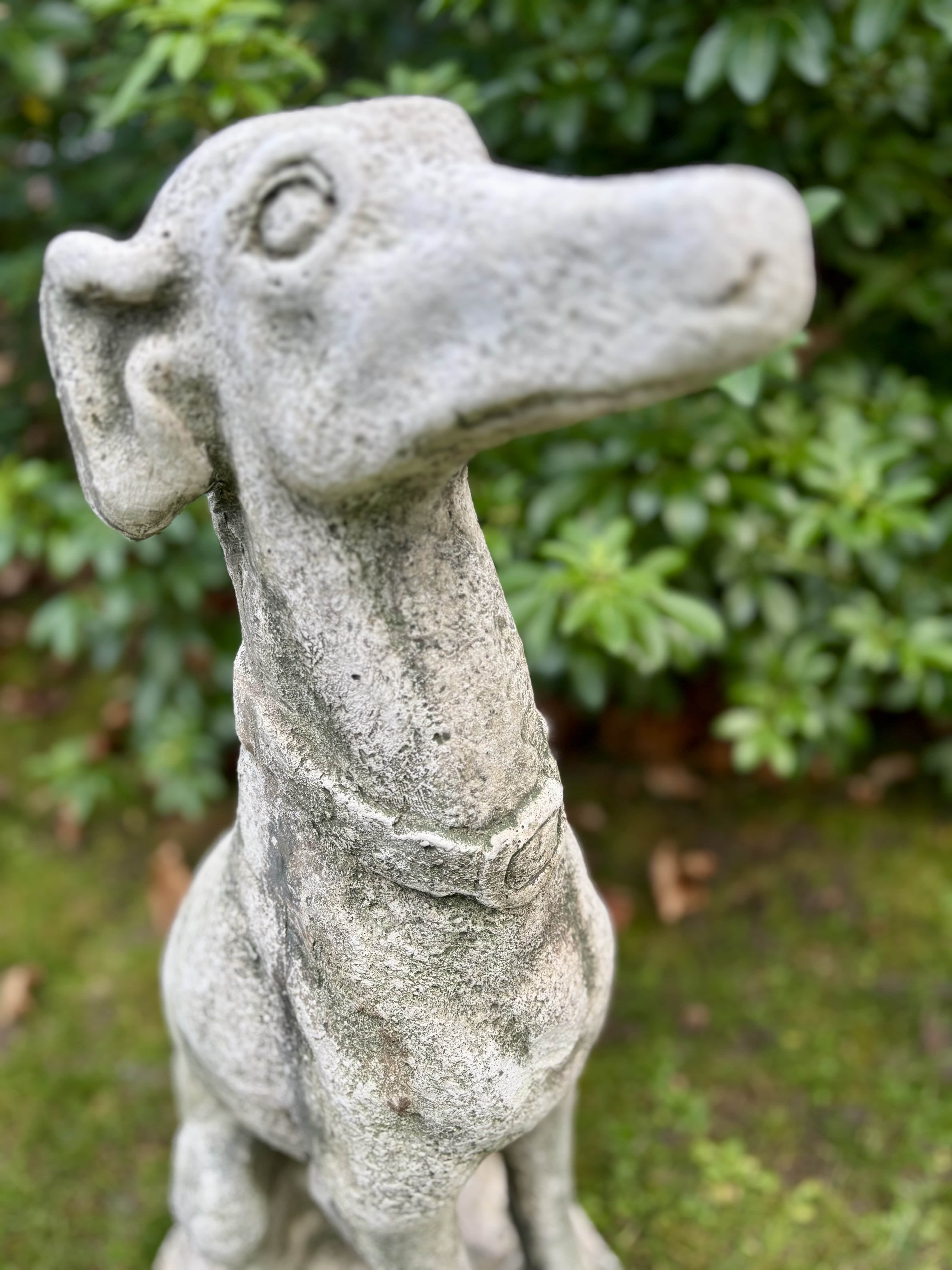 Elégante paire de lévriers assis, réalisée en pierre reconstituée, destinée à l'ornement d'un jardin, d'une terrasse ou à la mise en scène d'une entrée. Sujets identiques formant paire. Patine naturelle liée à une ancienne installation extérieure. Portugal, XXe siècle. Poids: 44 kg par sujet soit 88 kg pour la paire