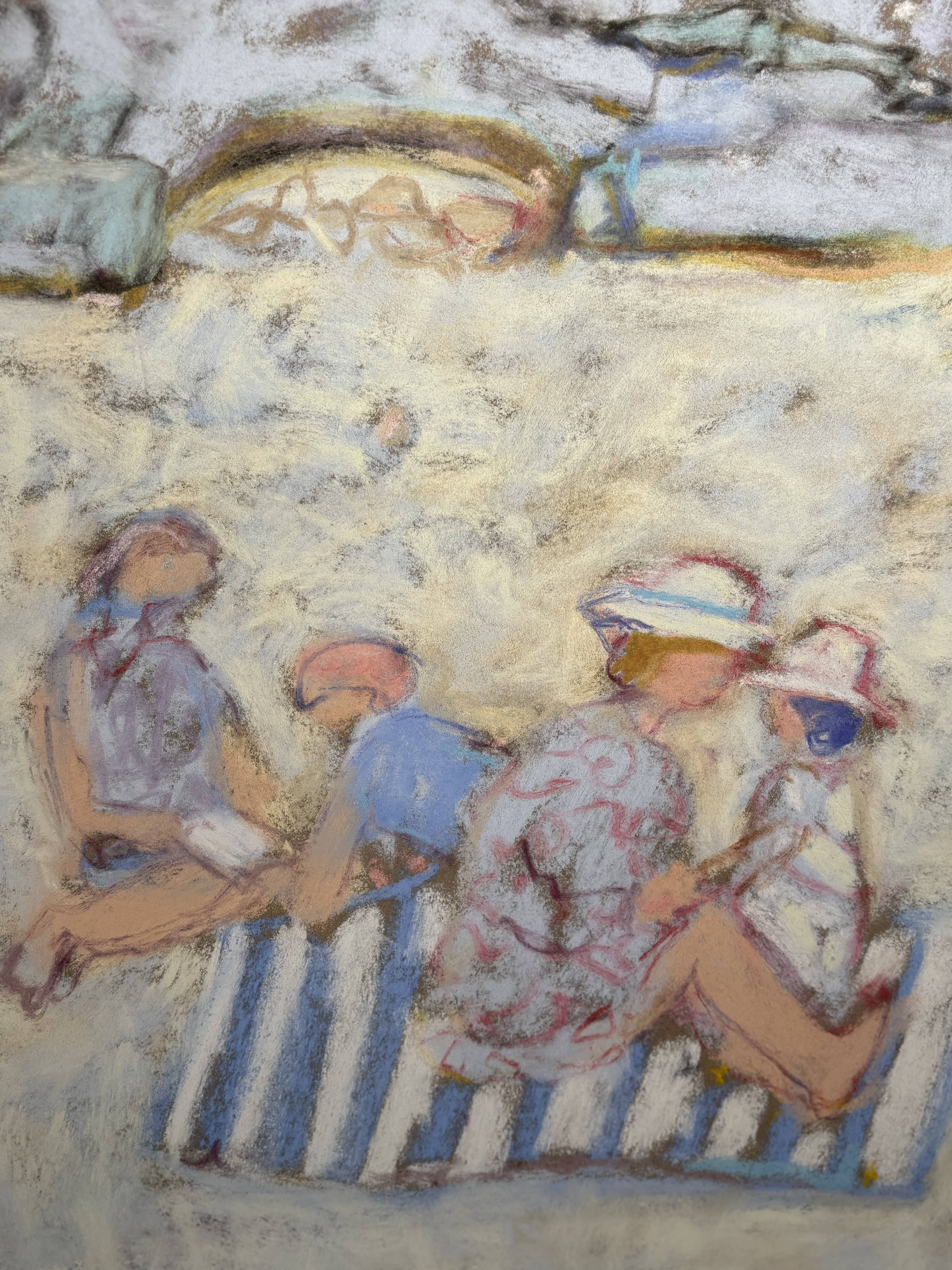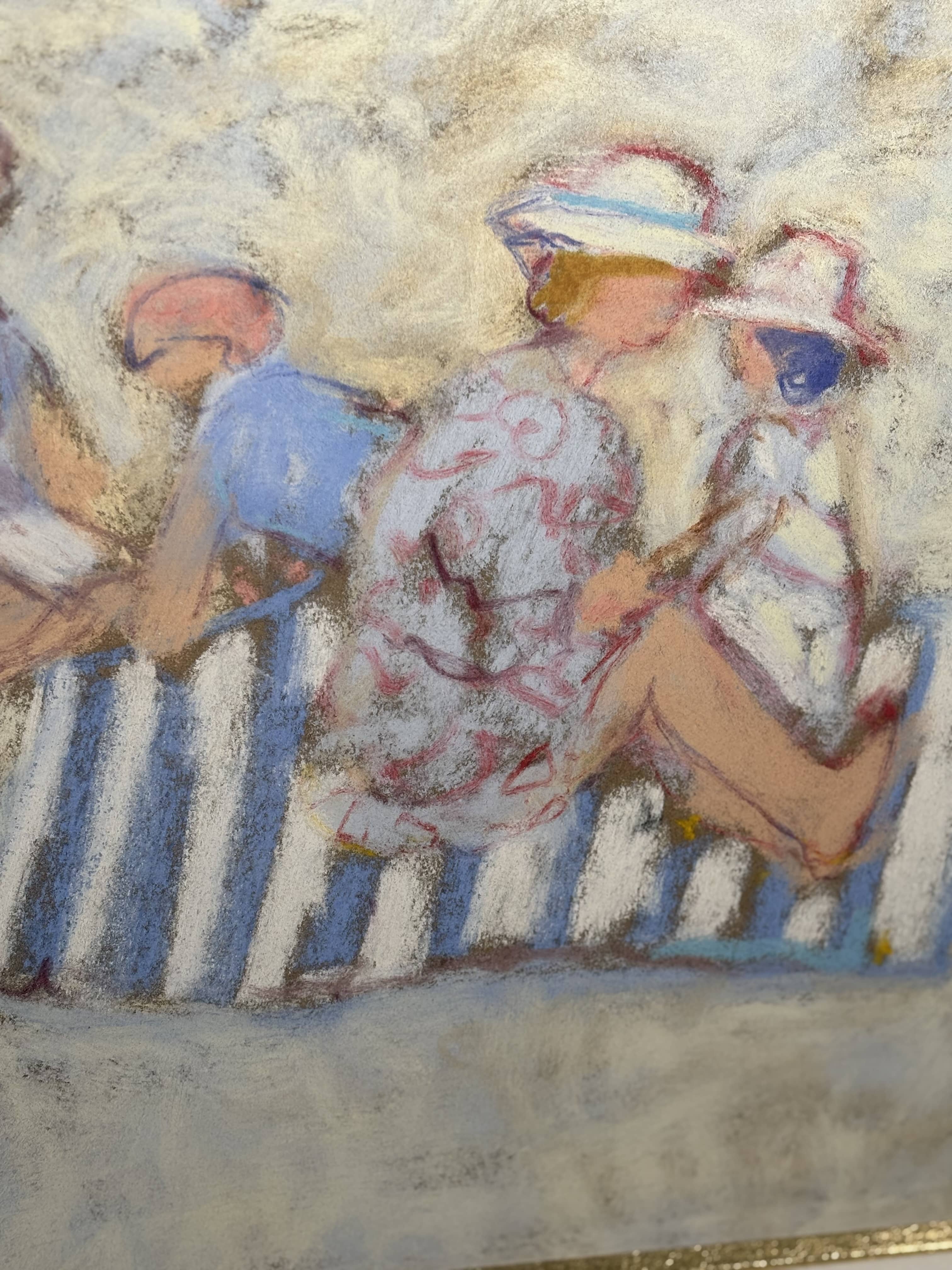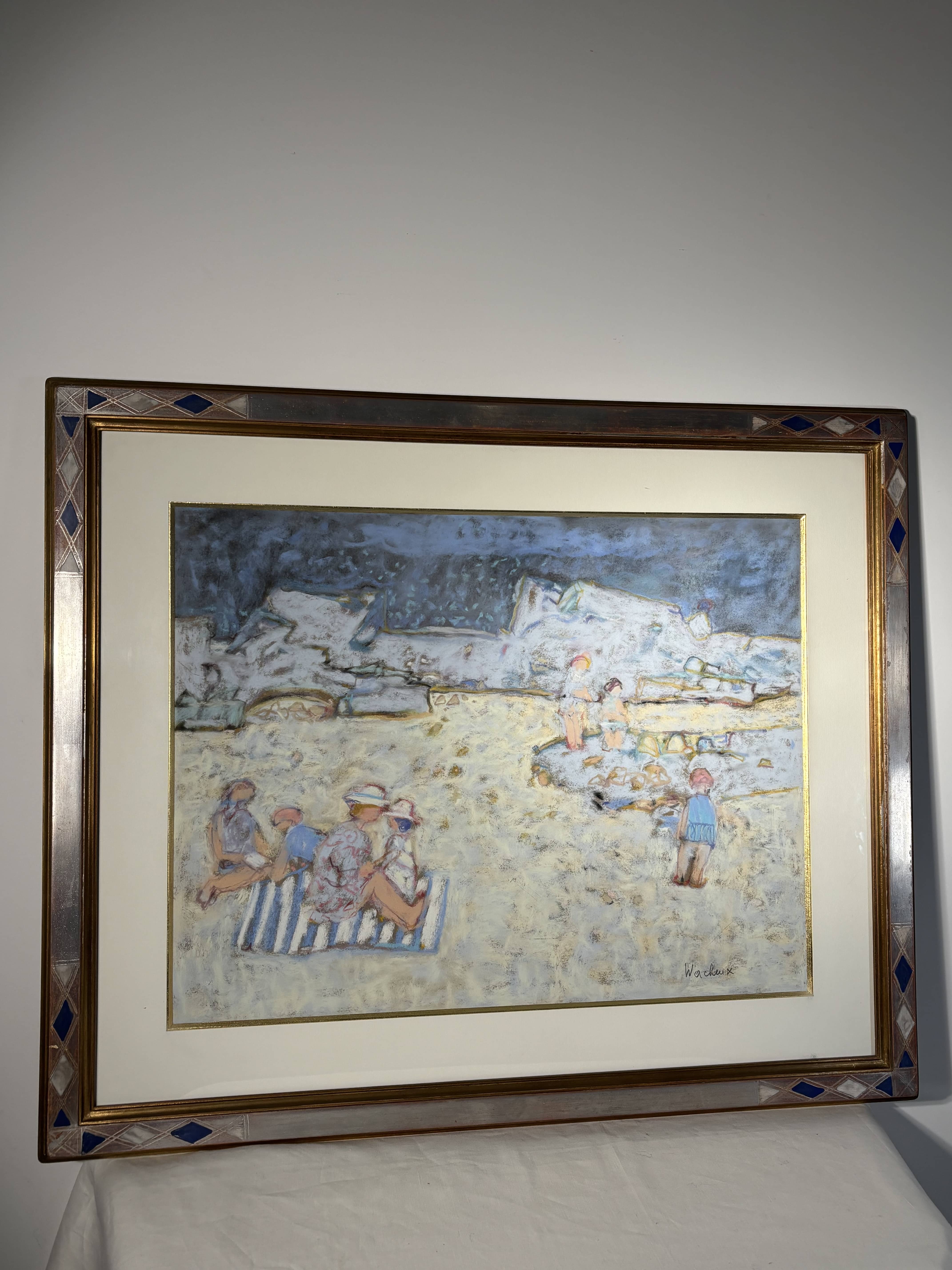 Très belle scène de plage d'Yves Wacheux, peintre du XXe siècle, représentant un groupe de personnages sur le sable face à la mer, dans une atmosphère douce et légèrement voilée. L'artiste y capte un moment de vie simple et silencieux,où adultes et enfants se partagent l'espace entre la mer et les dunes. La composition est construite par larges zones de couleur, dominées par les bleus, les beiges et les blancs, créant une lumière diffuse, presque brumeuse, qui évoque une plage hors saison ou une fin d'après-midi. Les figures sont traitées avec des contours fondus donnant à la scène une grande poésie et une impression de calme absolu. Le travail des couleurs et de la lumière particulièrement subtil traduit la sensibilité de l'artiste. Oeuvre signée en bas à droite. Présentée dans un cadre en bois à décor géométrique.