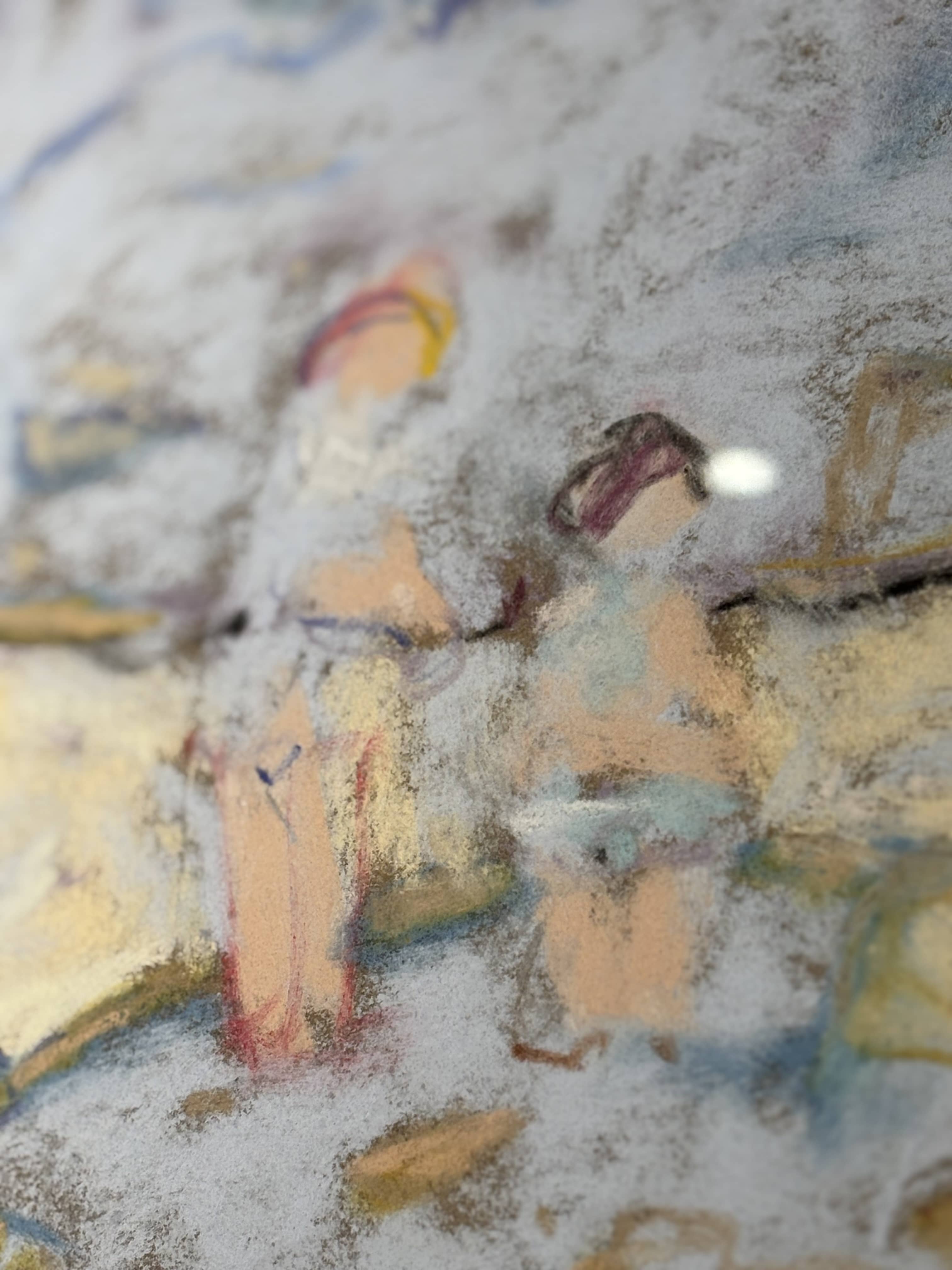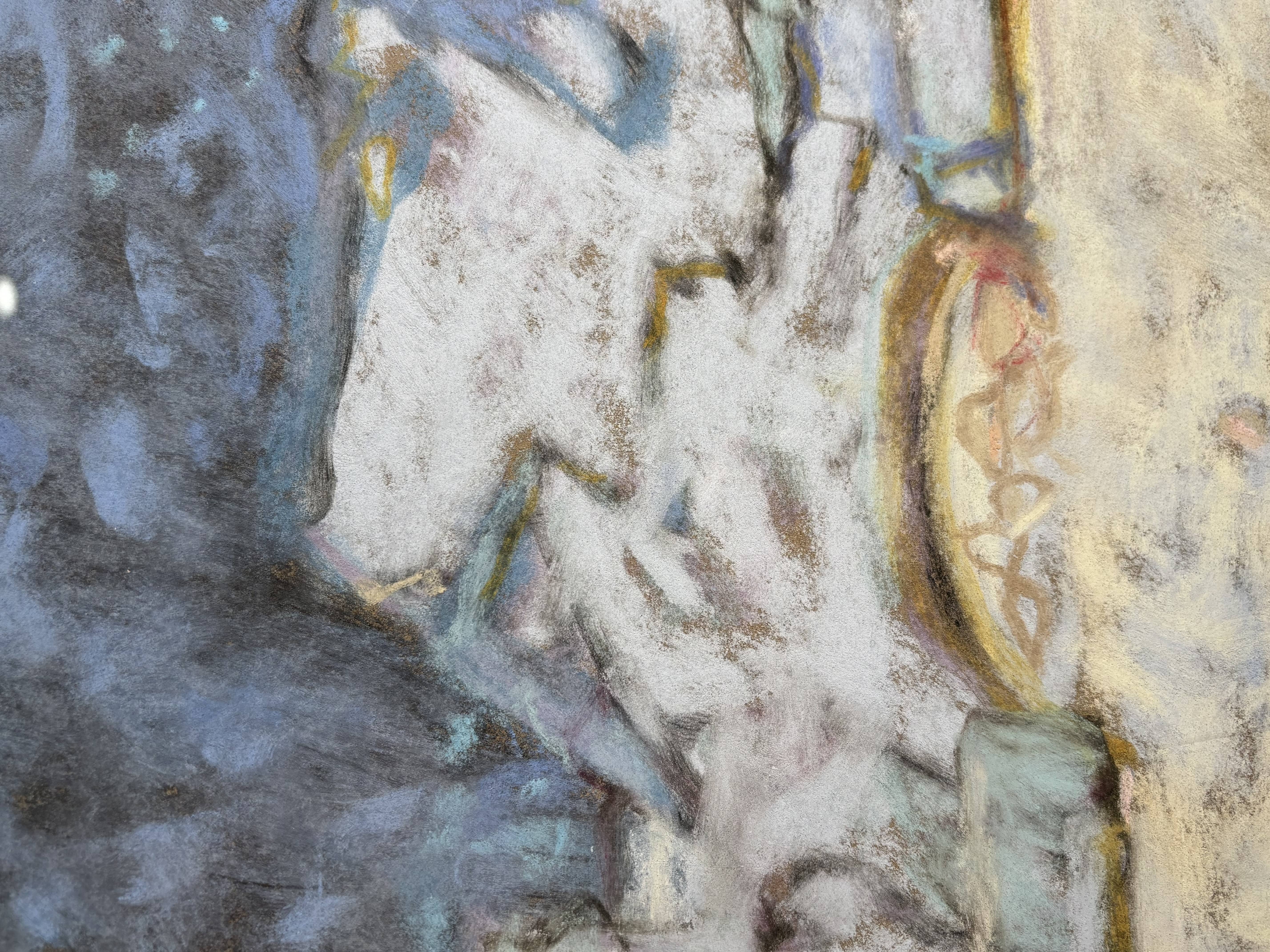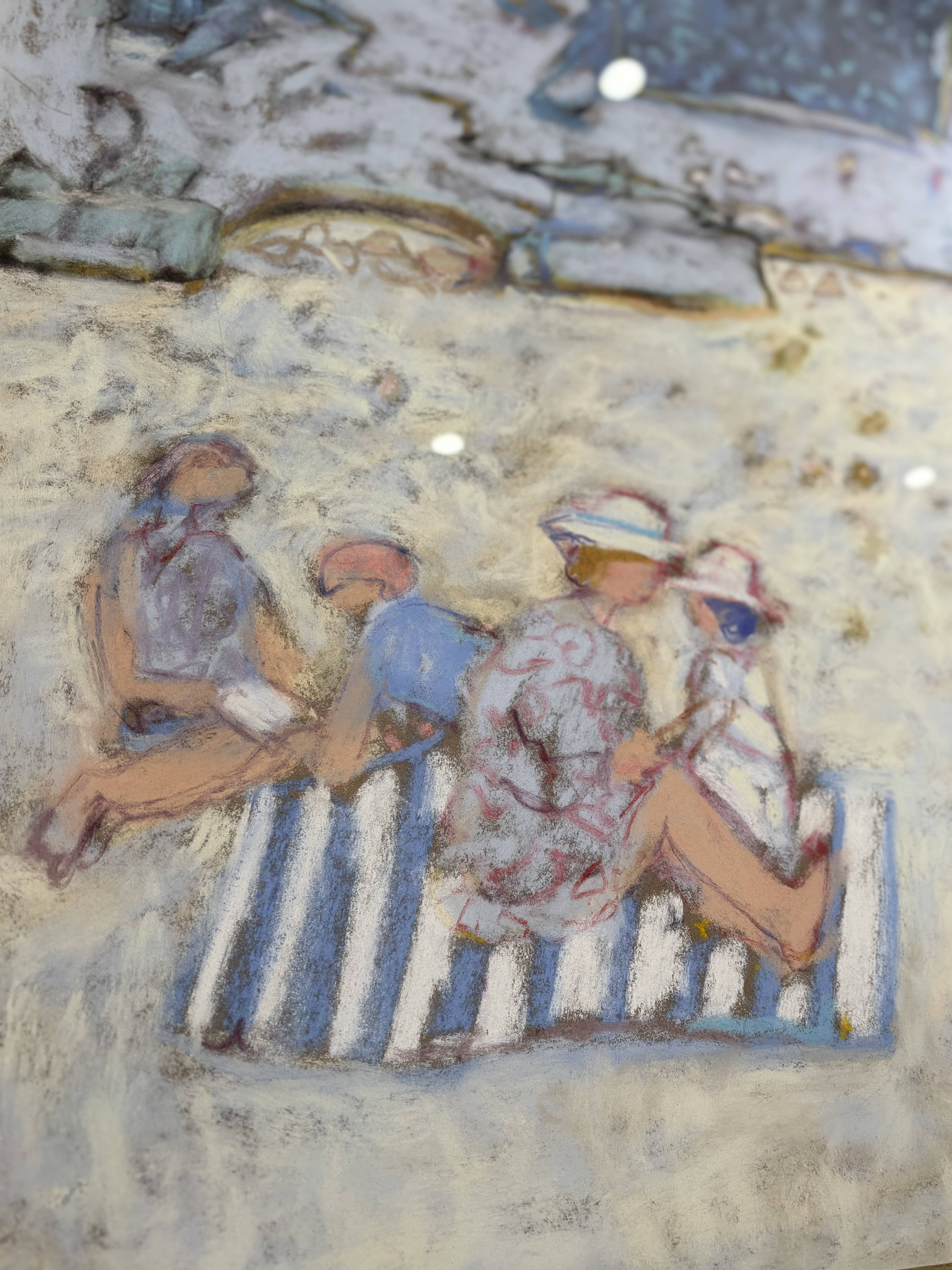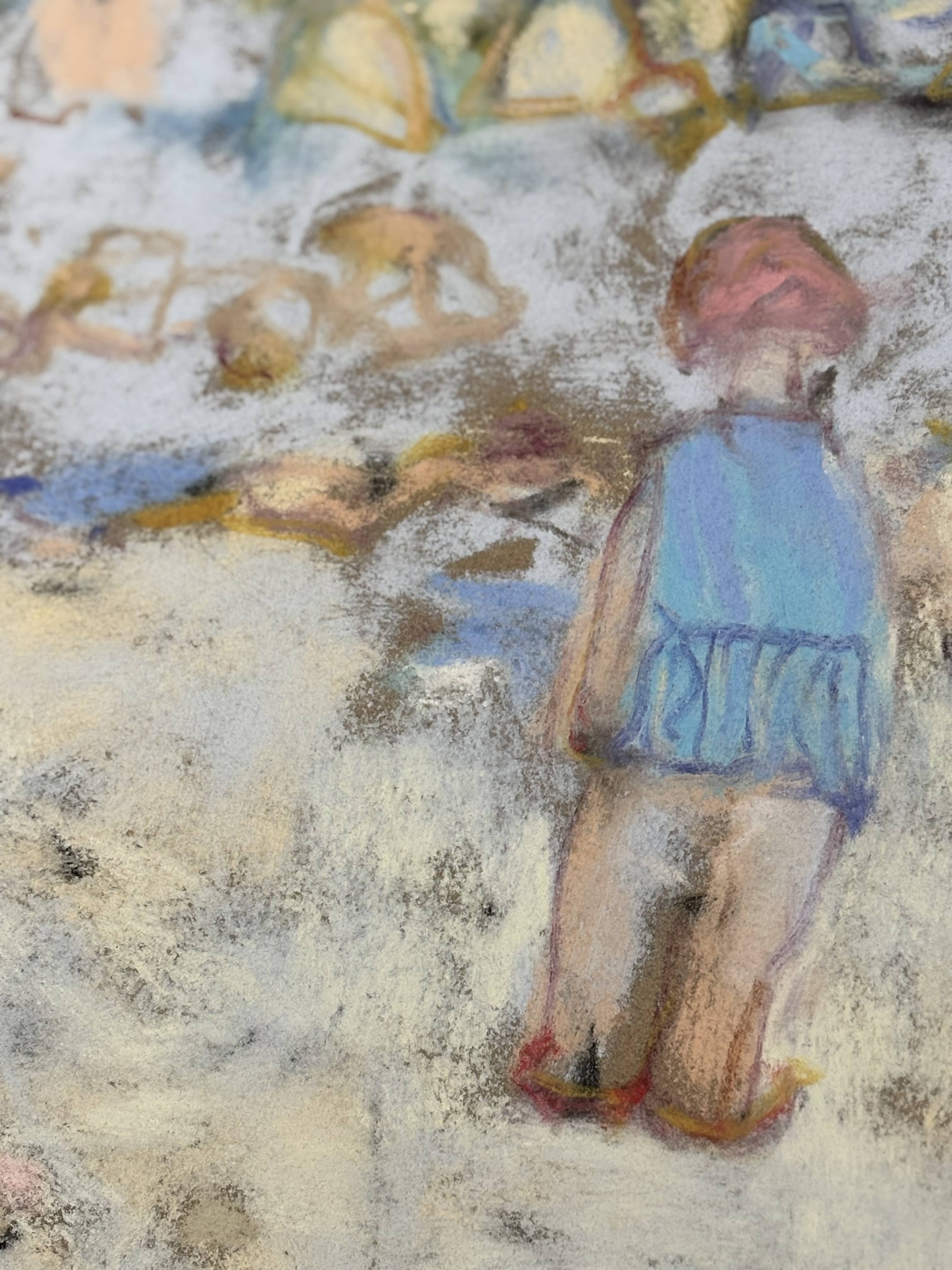 Très belle scène de plage d'Yves Wacheux, peintre du XXe siècle, représentant un groupe de personnages sur le sable face à la mer, dans une atmosphère douce et légèrement voilée. L'artiste y capte un moment de vie simple et silencieux,où adultes et enfants se partagent l'espace entre la mer et les dunes. La composition est construite par larges zones de couleur, dominées par les bleus, les beiges et les blancs, créant une lumière diffuse, presque brumeuse, qui évoque une plage hors saison ou une fin d'après-midi. Les figures sont traitées avec des contours fondus donnant à la scène une grande poésie et une impression de calme absolu. Le travail des couleurs et de la lumière particulièrement subtil traduit la sensibilité de l'artiste. Oeuvre signée en bas à droite. Présentée dans un cadre en bois à décor géométrique.